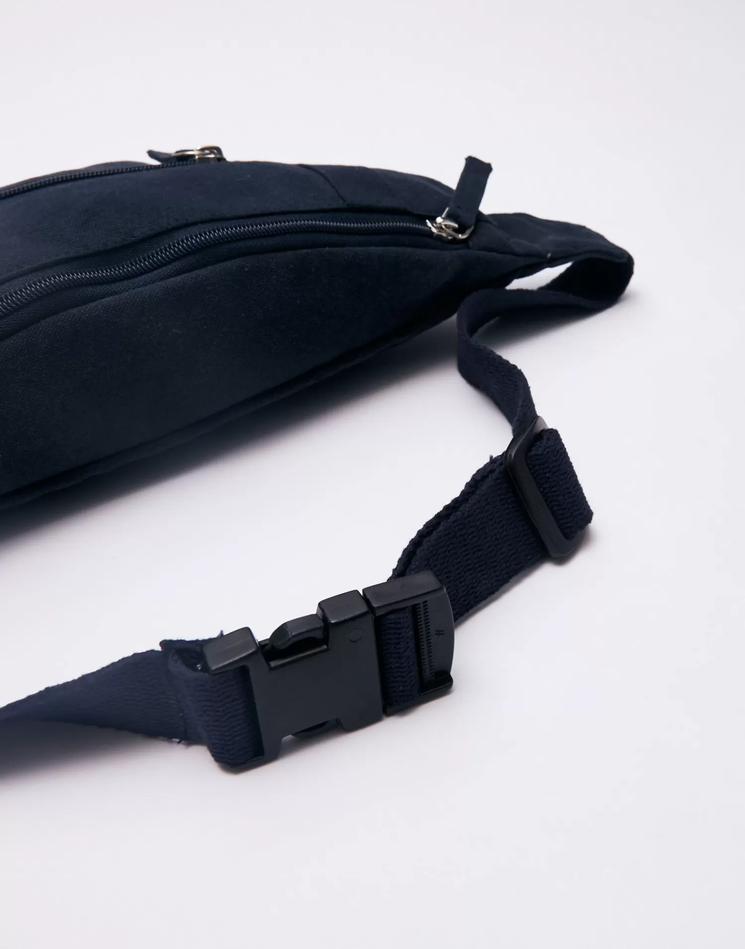 Fanny pack with adjustable belt, front pocket, and zipper closure.