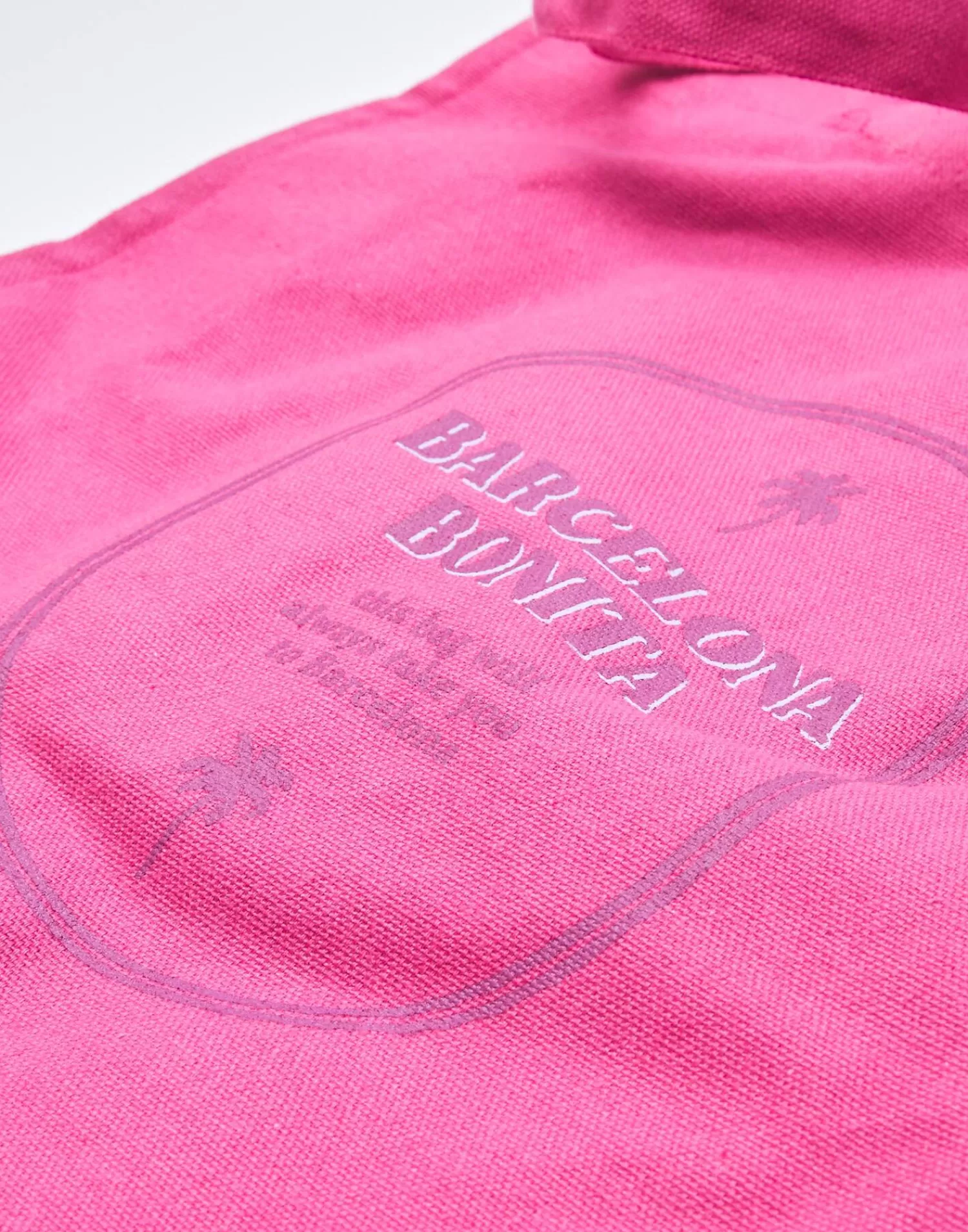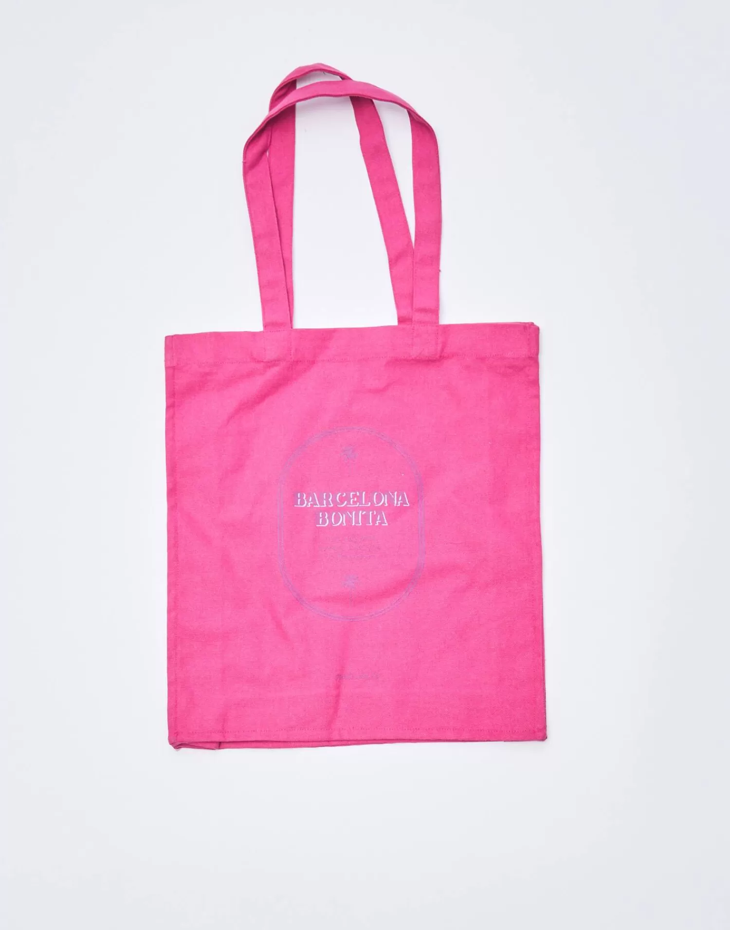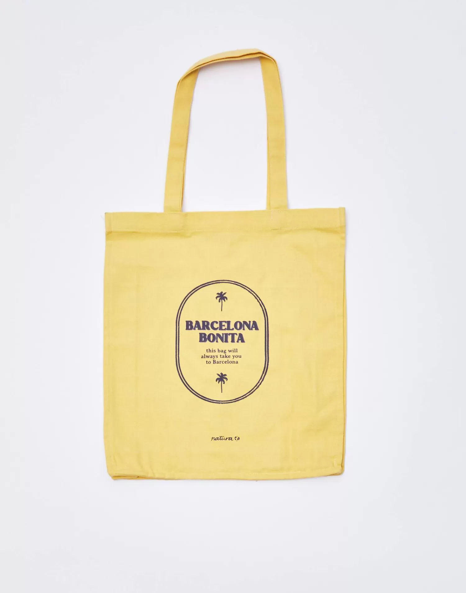 Cotton shopper bag featuring two shoulder straps to carry at the shoulder with graphics in the front.