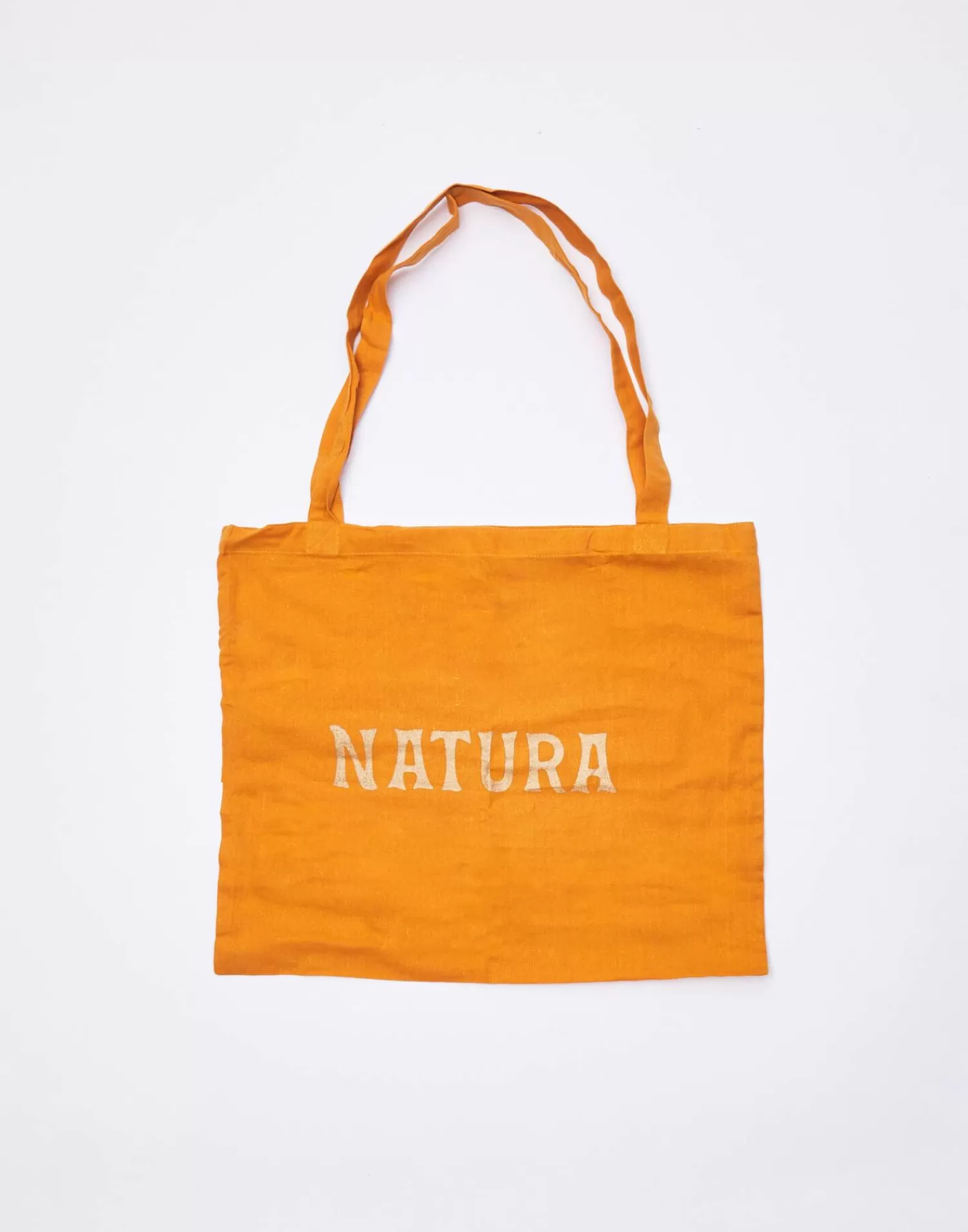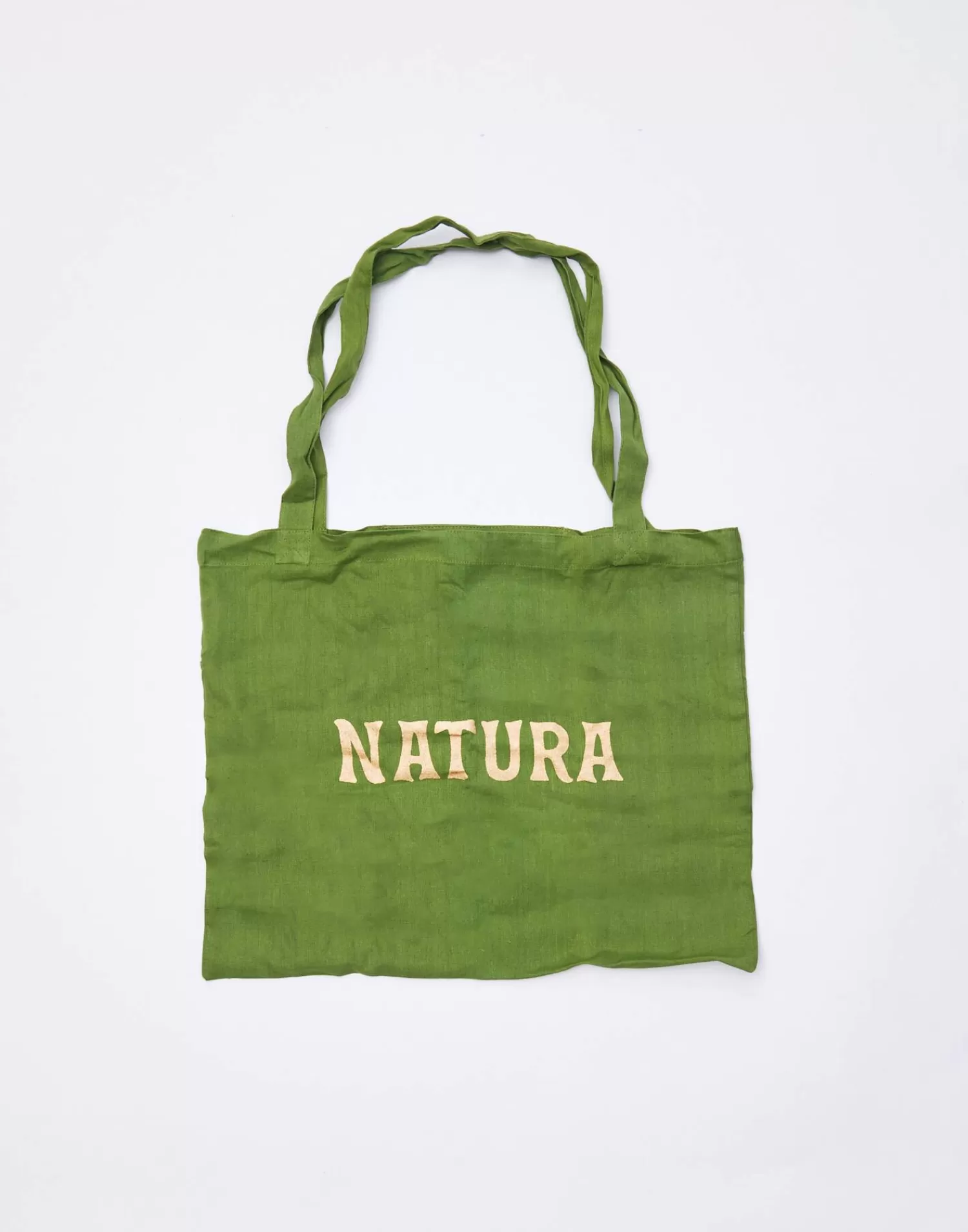 Cotton tote bag, with ‘Natura’ printed on the front and two handles. It features a drawstring detail for closure and an interior pocket.