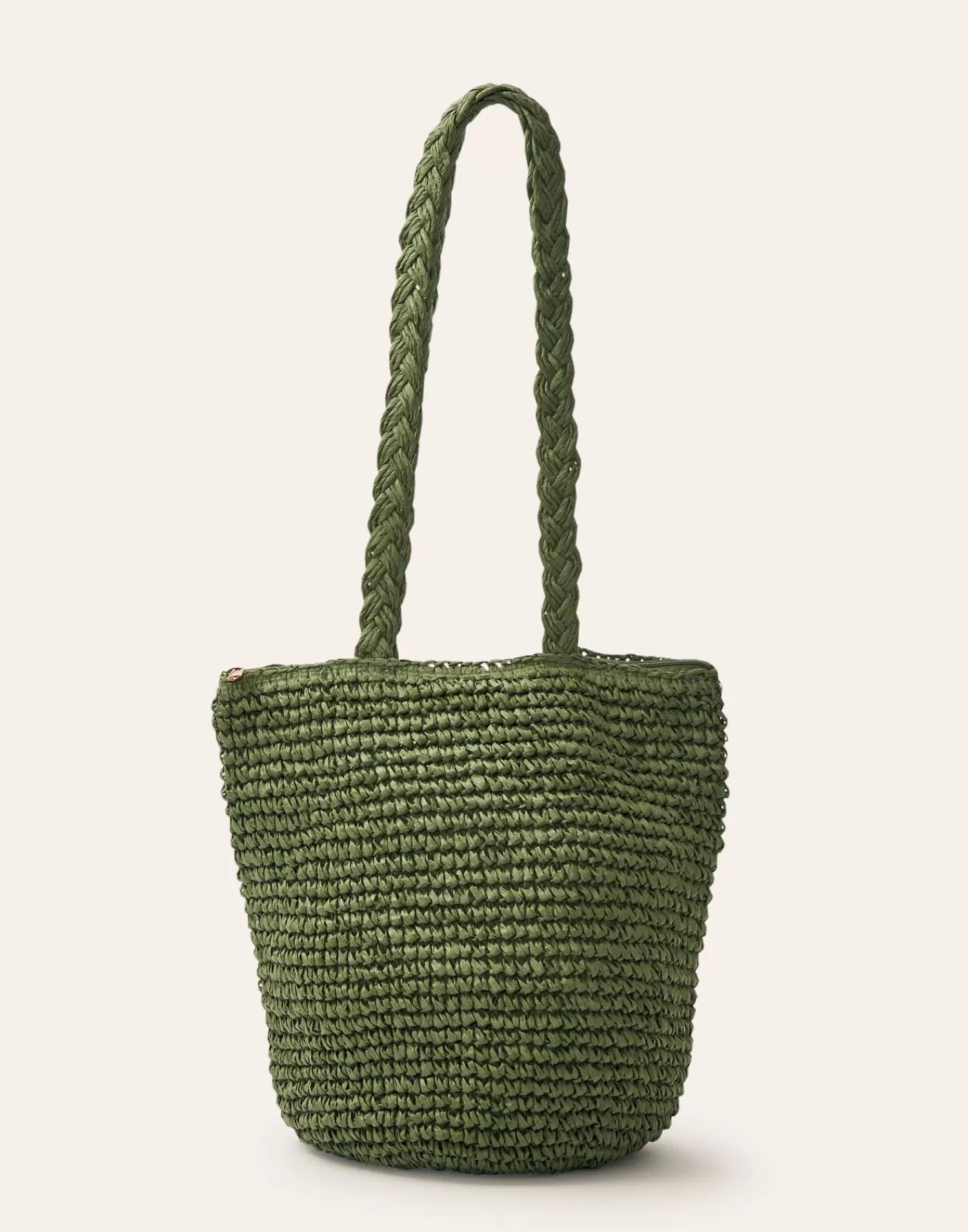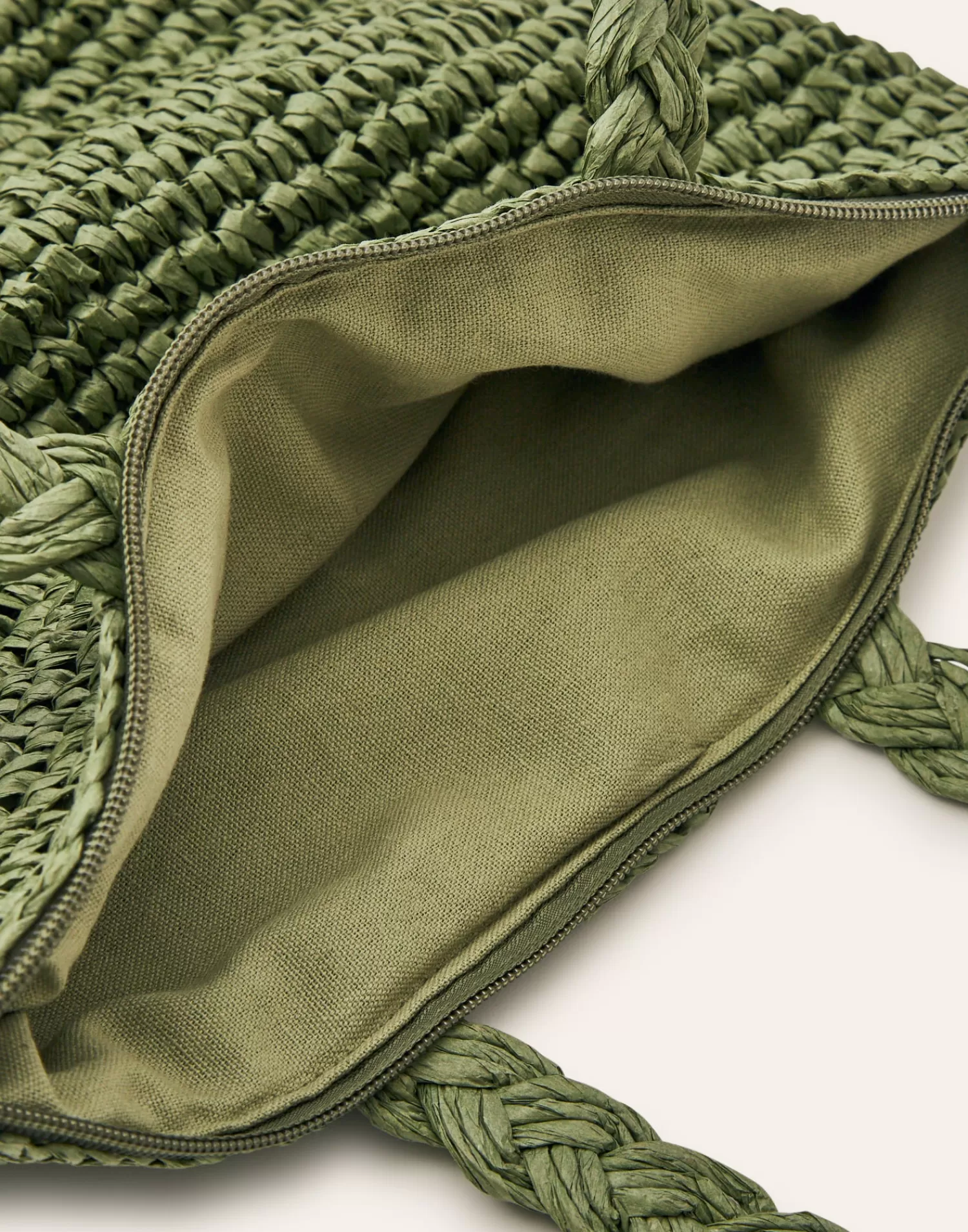 Paper bag with zipper closure and inner lining. Shoulder strap for carrying.