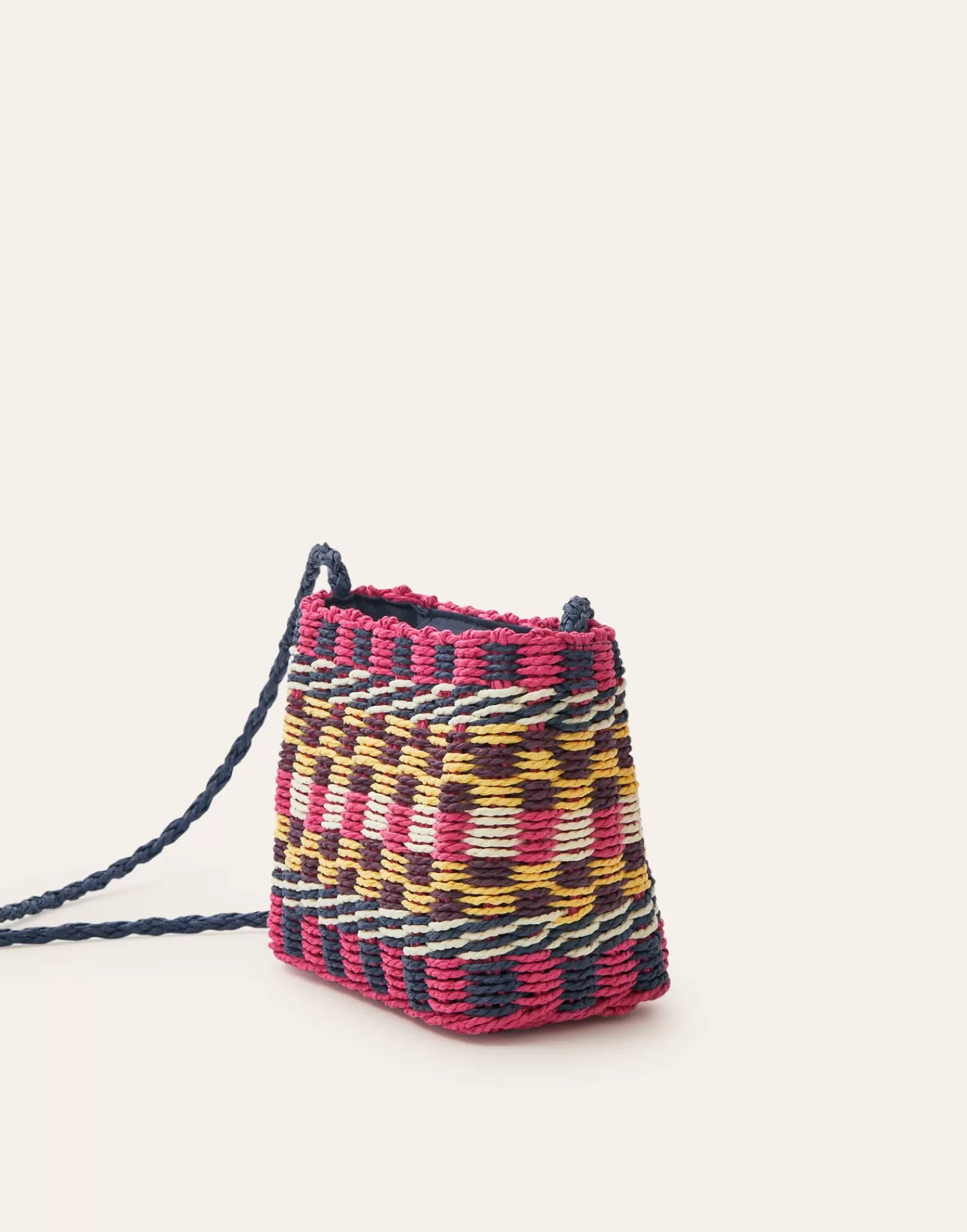 Small paper bag with zipper closure, lining, and interior zip pocket. Long strap for crossbody wear.