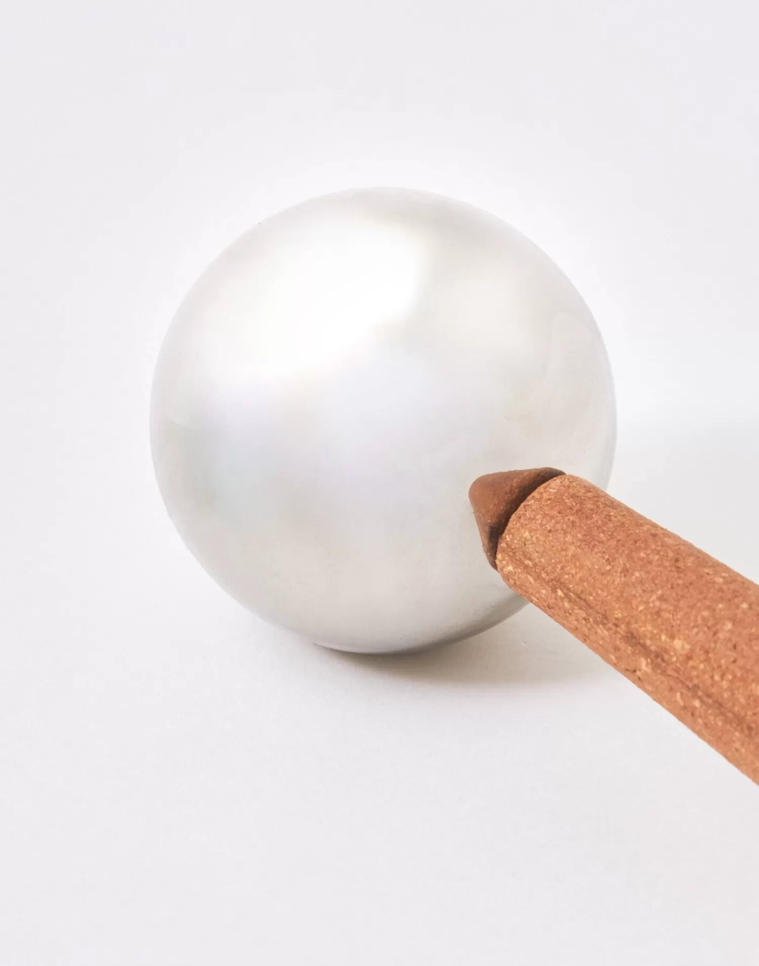Get firmer skin with this stainless steel facial massager with cork handle.