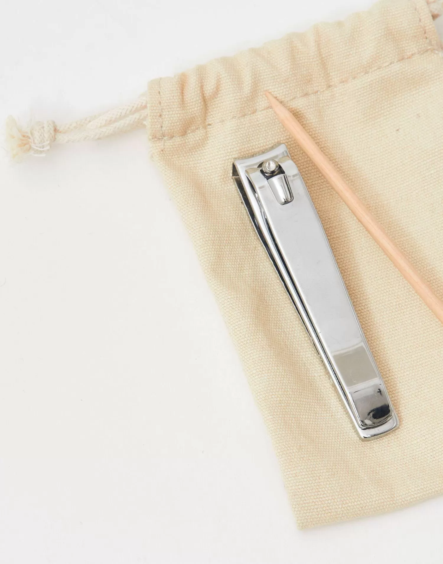Keep your hands polished thanks to this on the go manicure set. Features stainless steel nail clippers and cuticle clippers, a glass nail file, a wooden cuticle stick and a cotton bag.