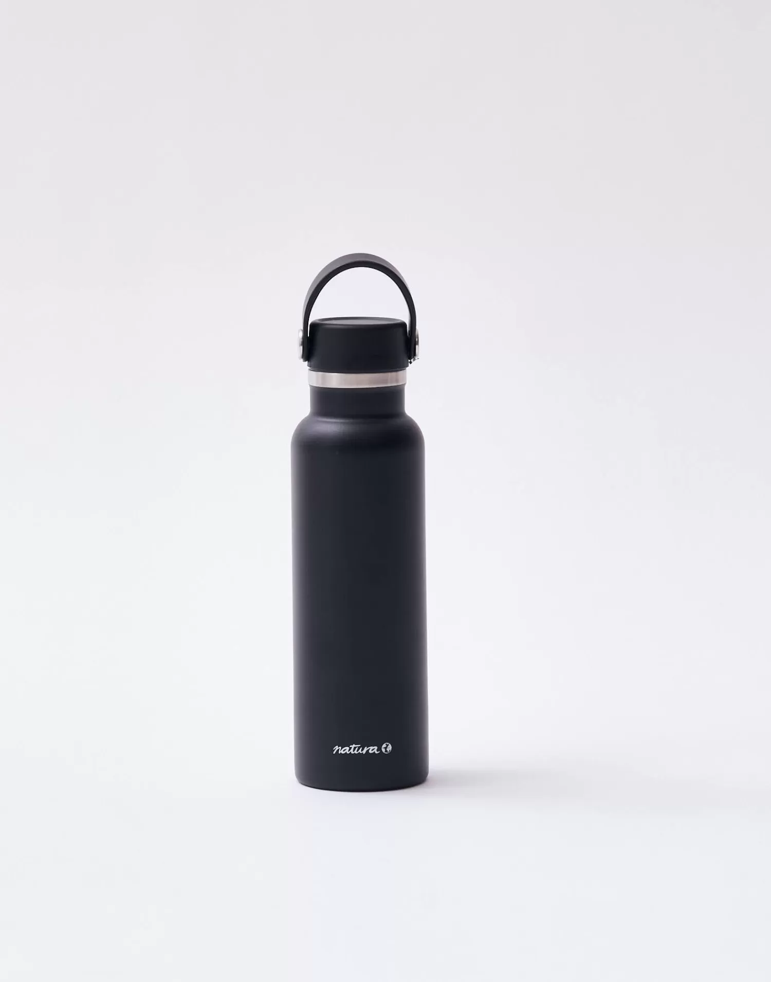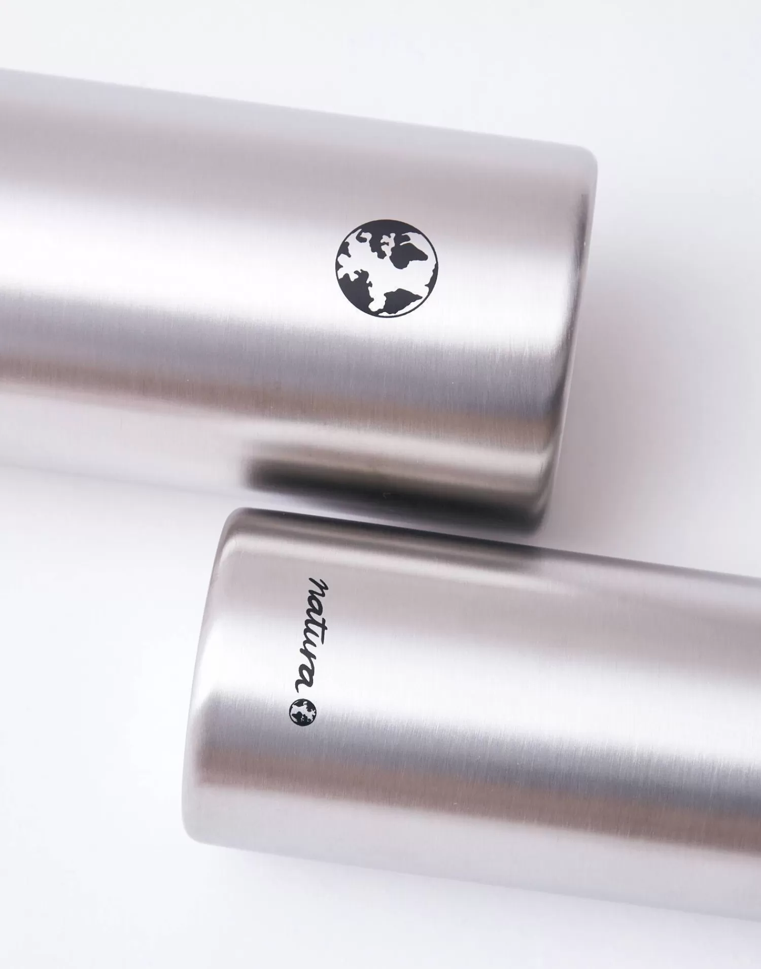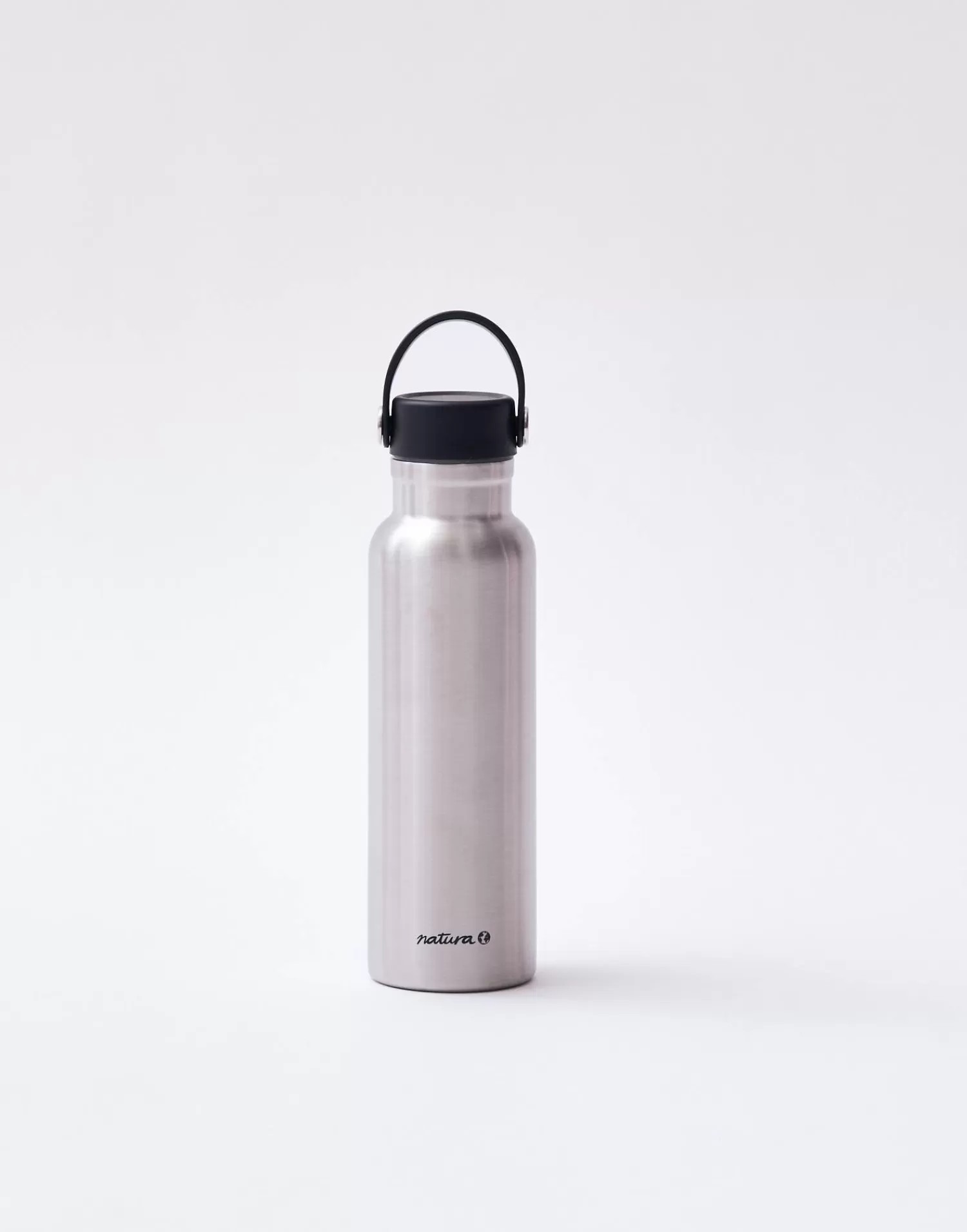 Reusable stainless steel bottle that can be used as thermos. Finished in a plug with handle.