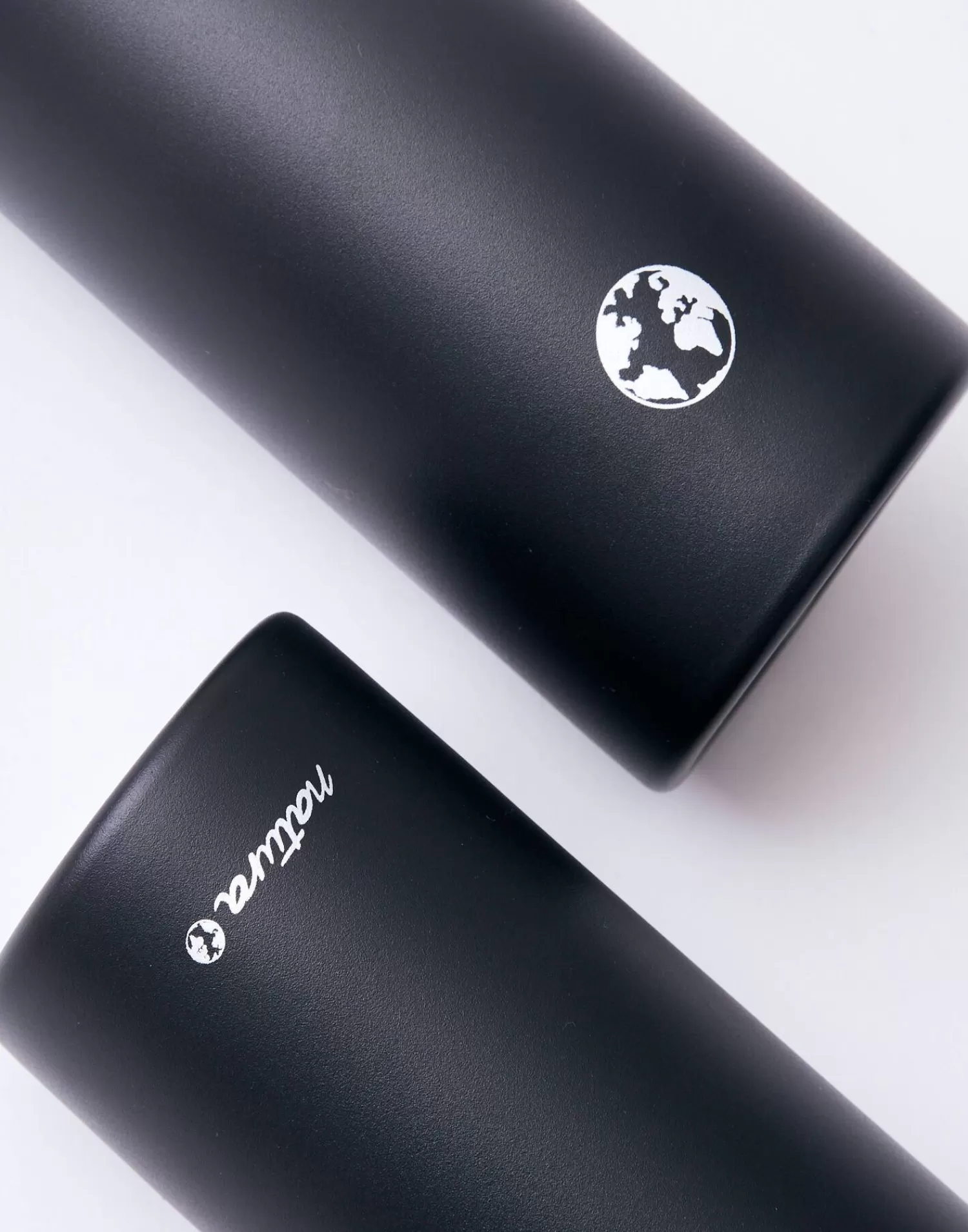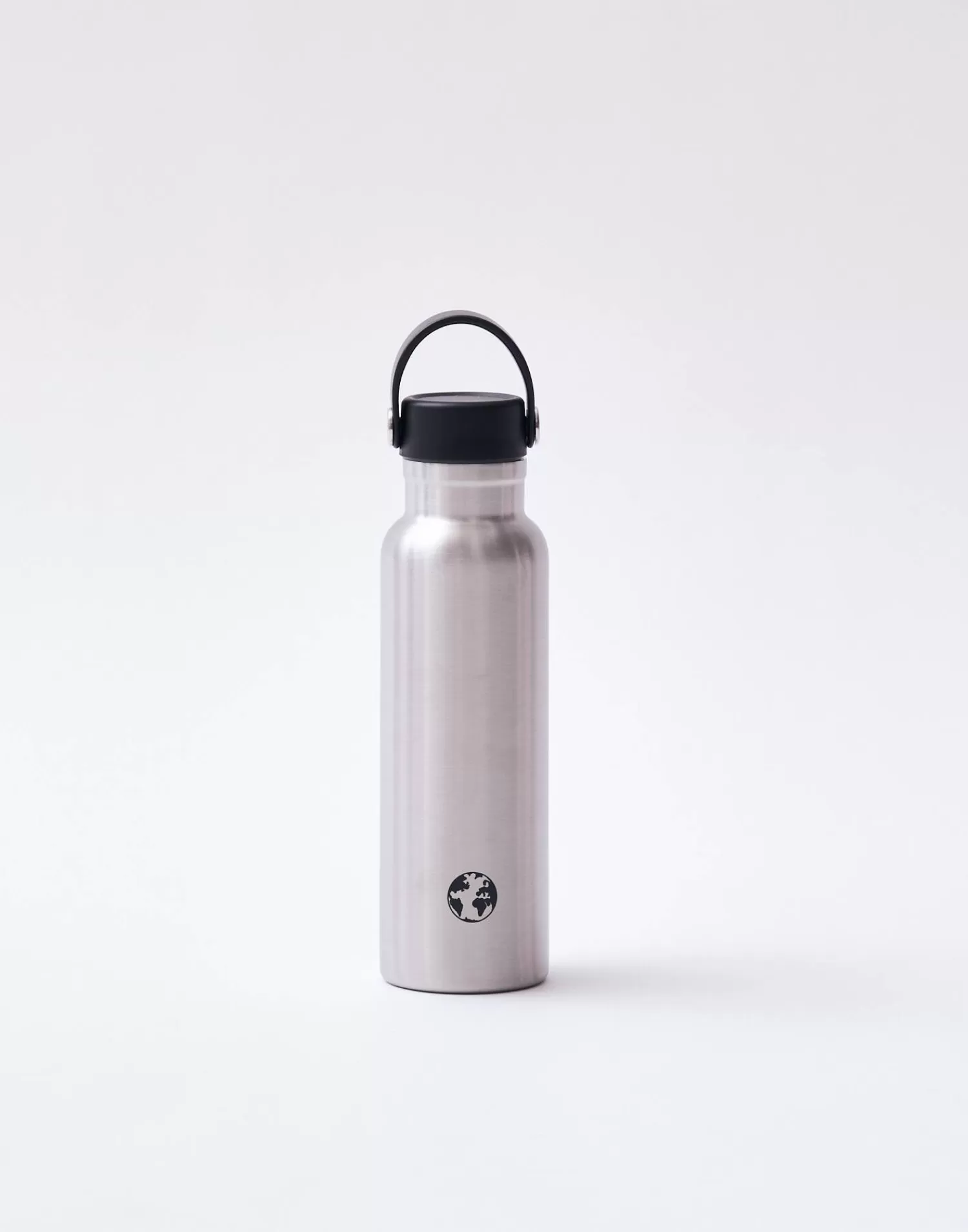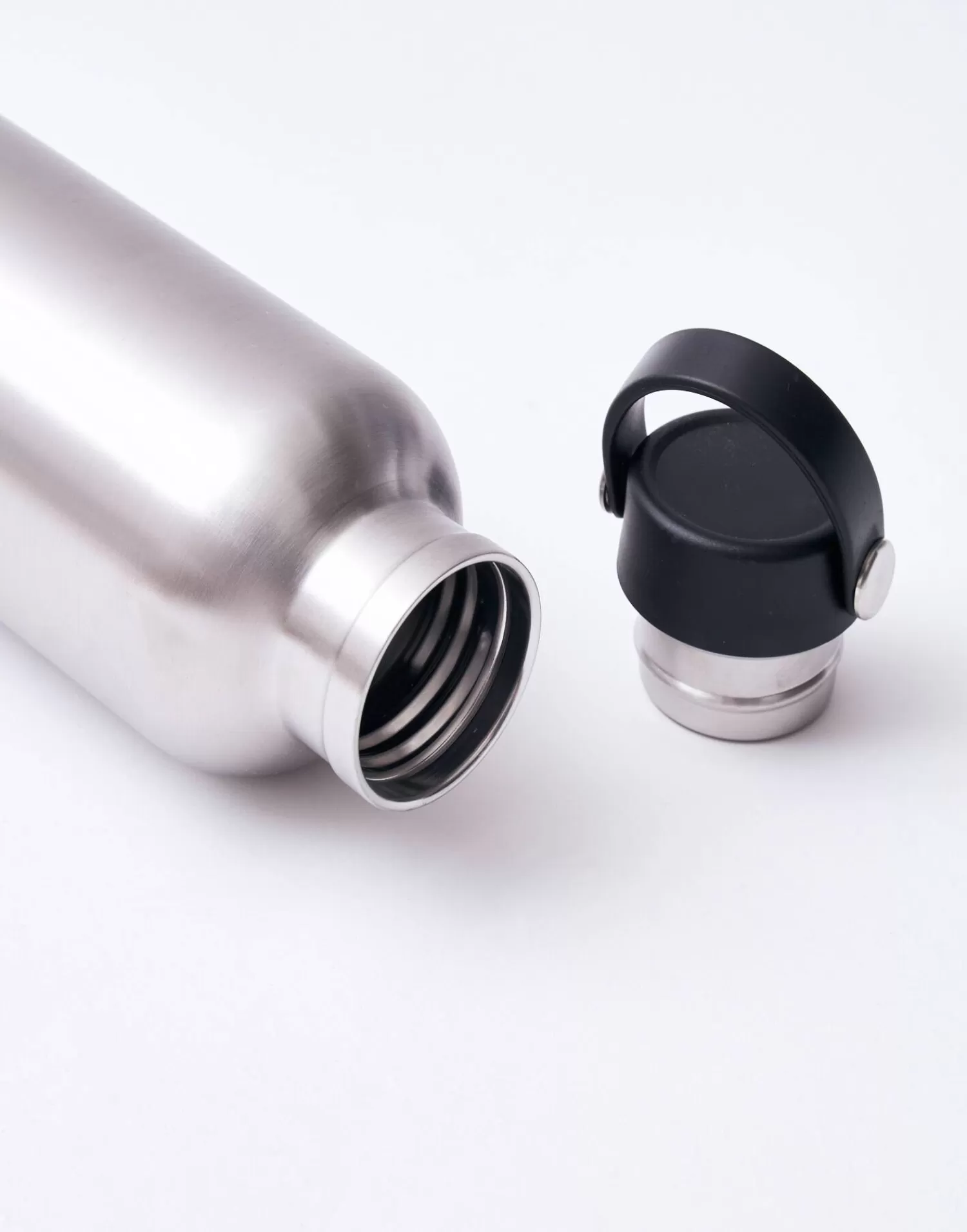 Reusable stainless steel bottle that can be used as thermos. Finished in a plug with handle.