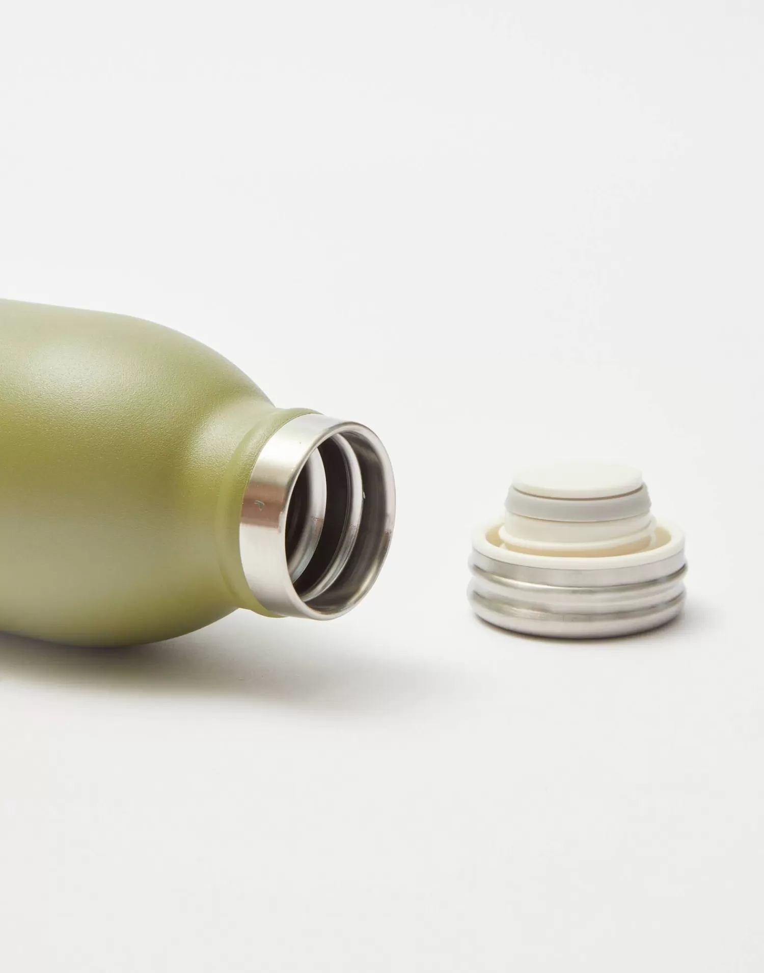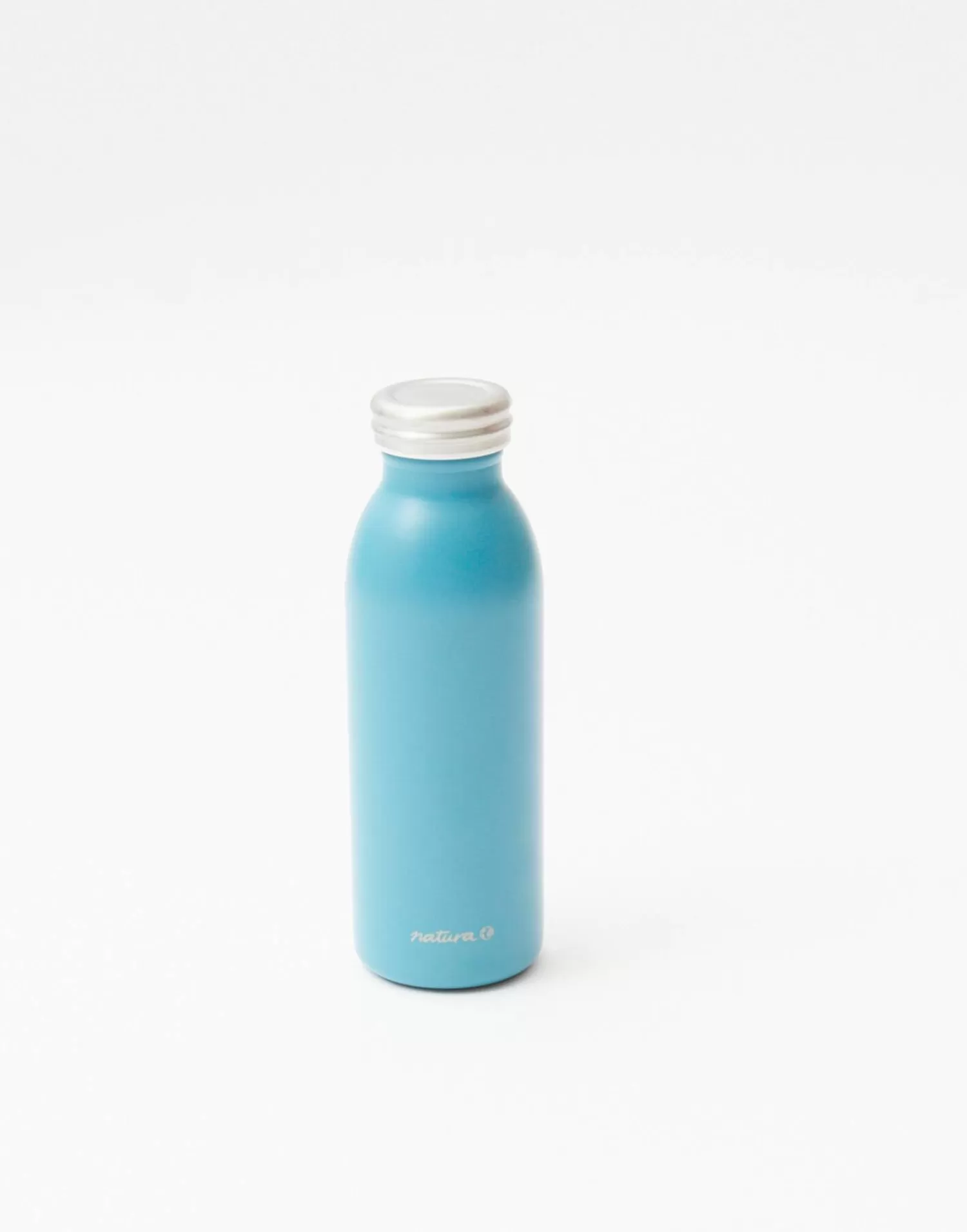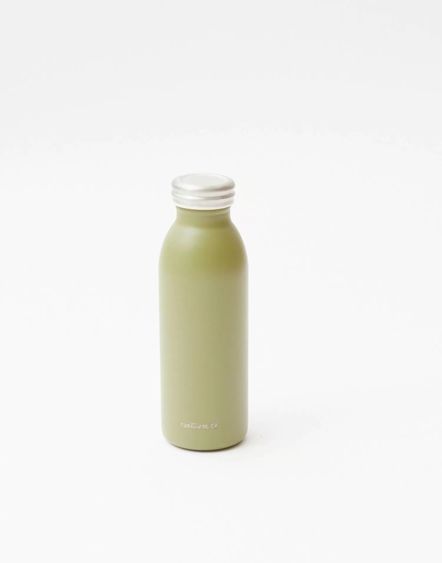 Metal bottle that can be used as a thermos. It has a non-slip rubber base to cushion impacts.