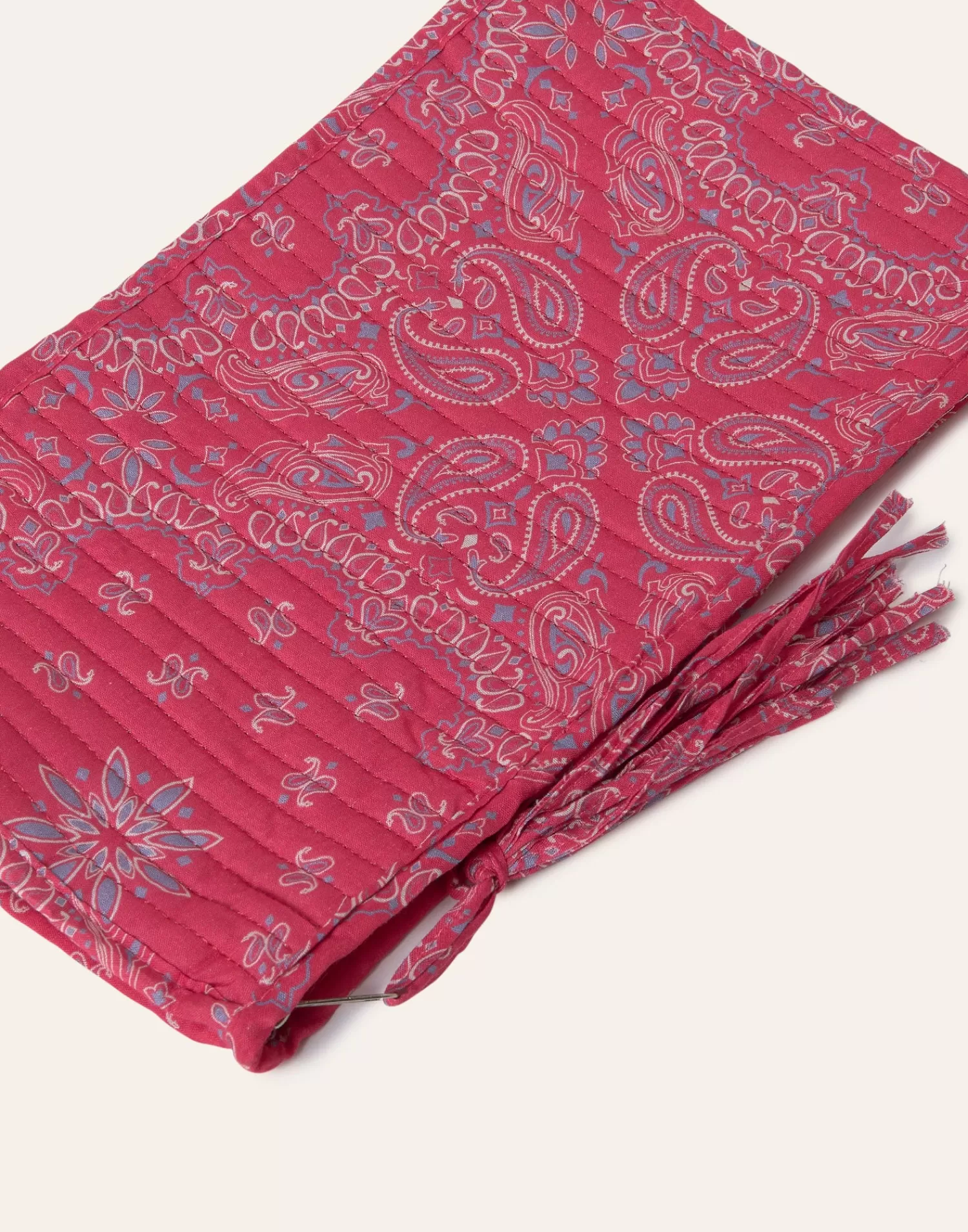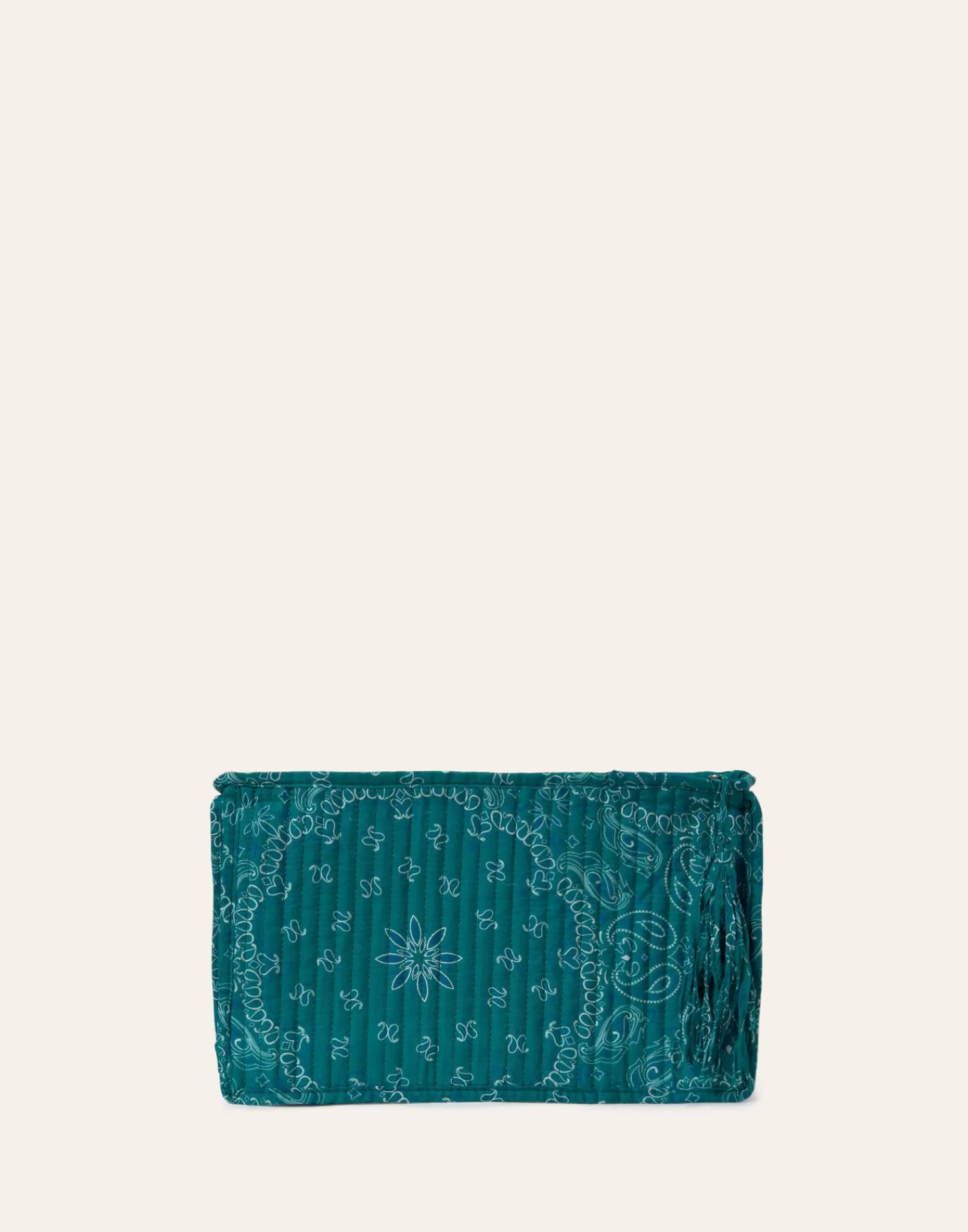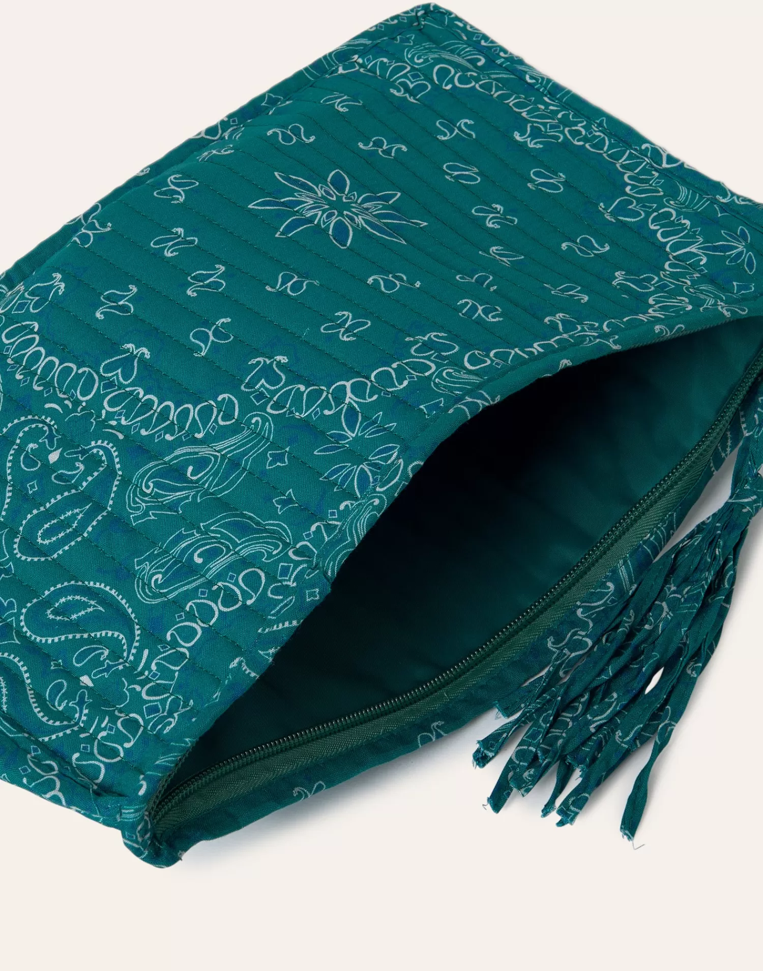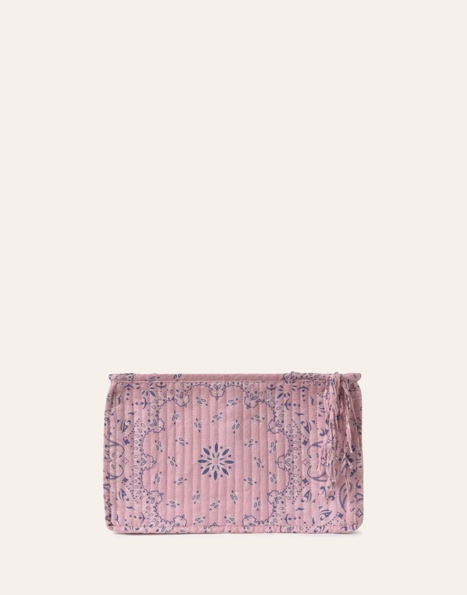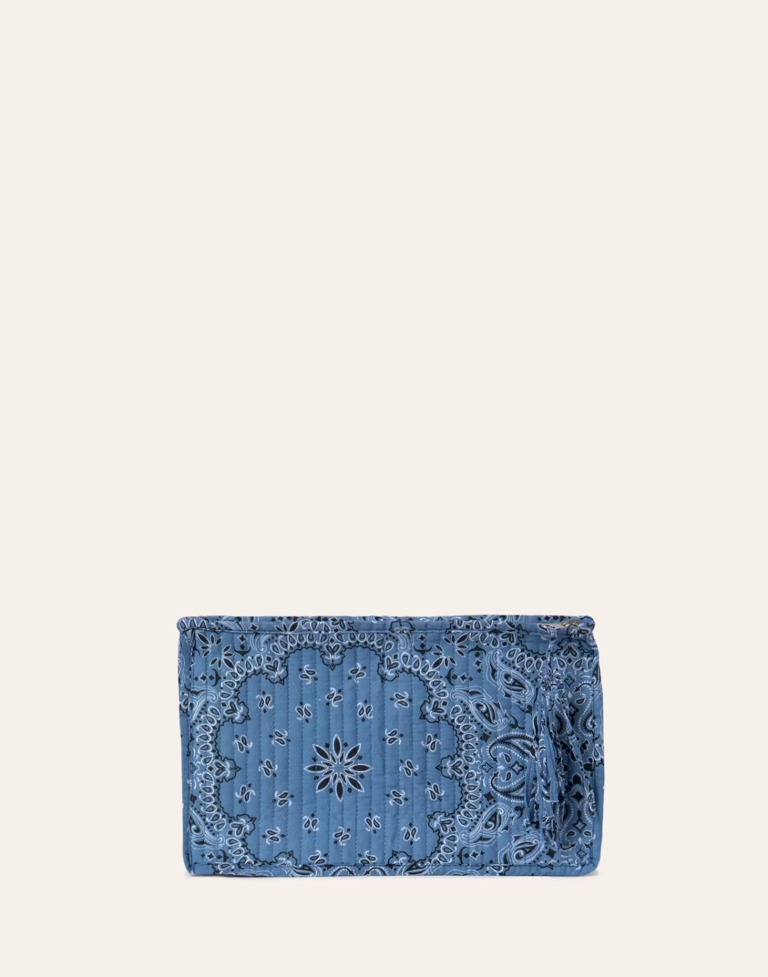 Rectangular padded cotton case. Top closure with zipper and zipper pull detail.
