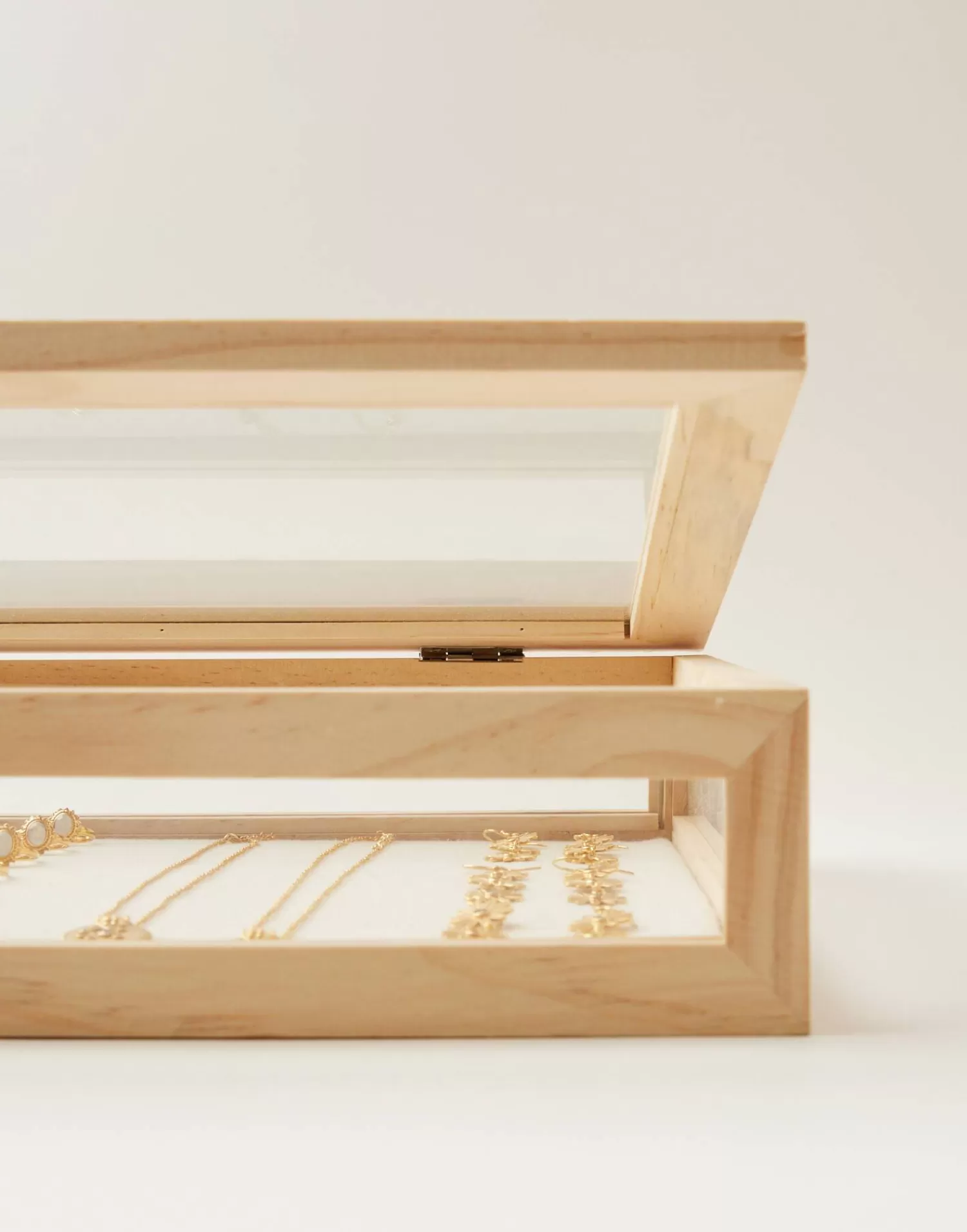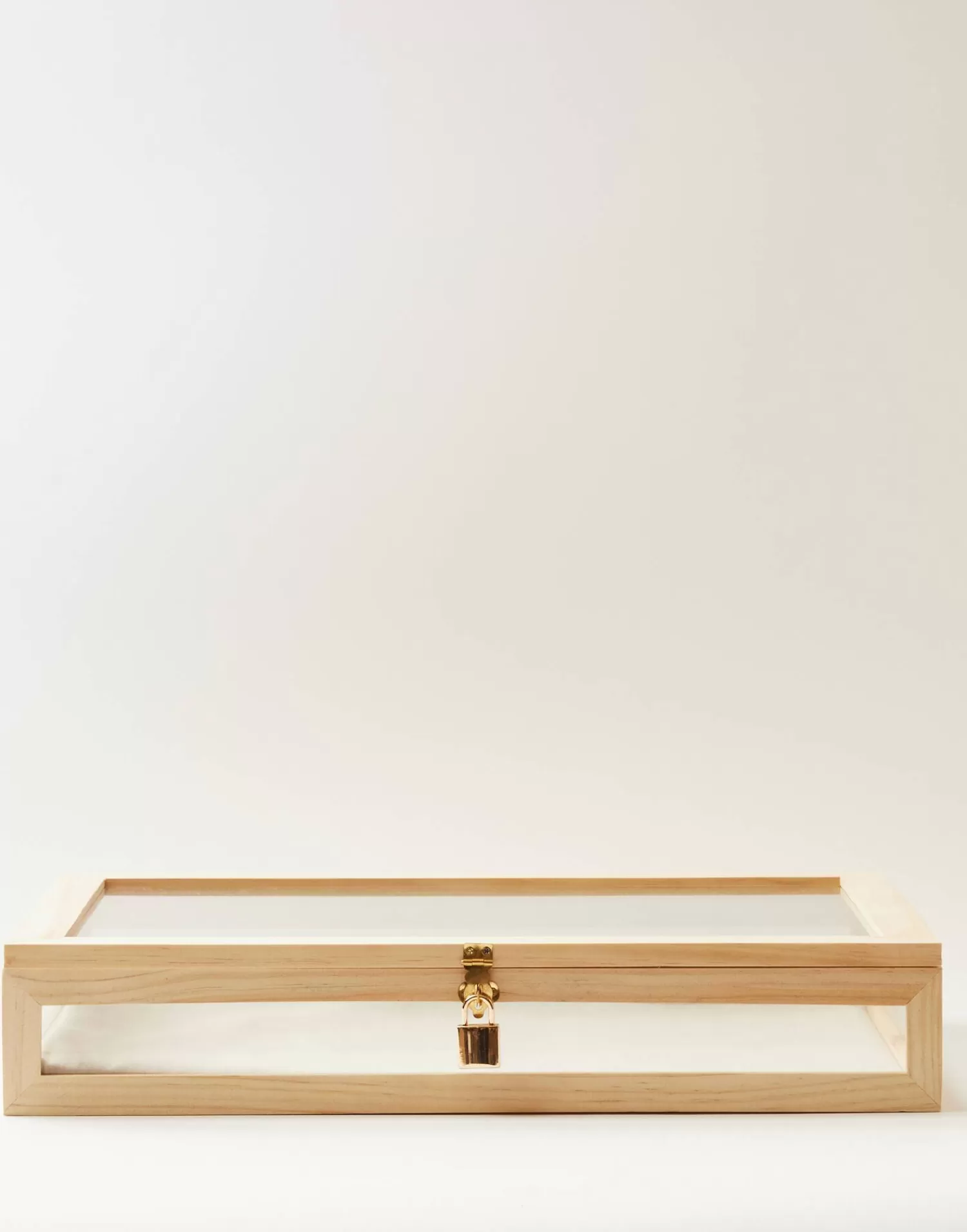 Large crystal showcase with wooden and sides in transparent glass on an aging wood base.