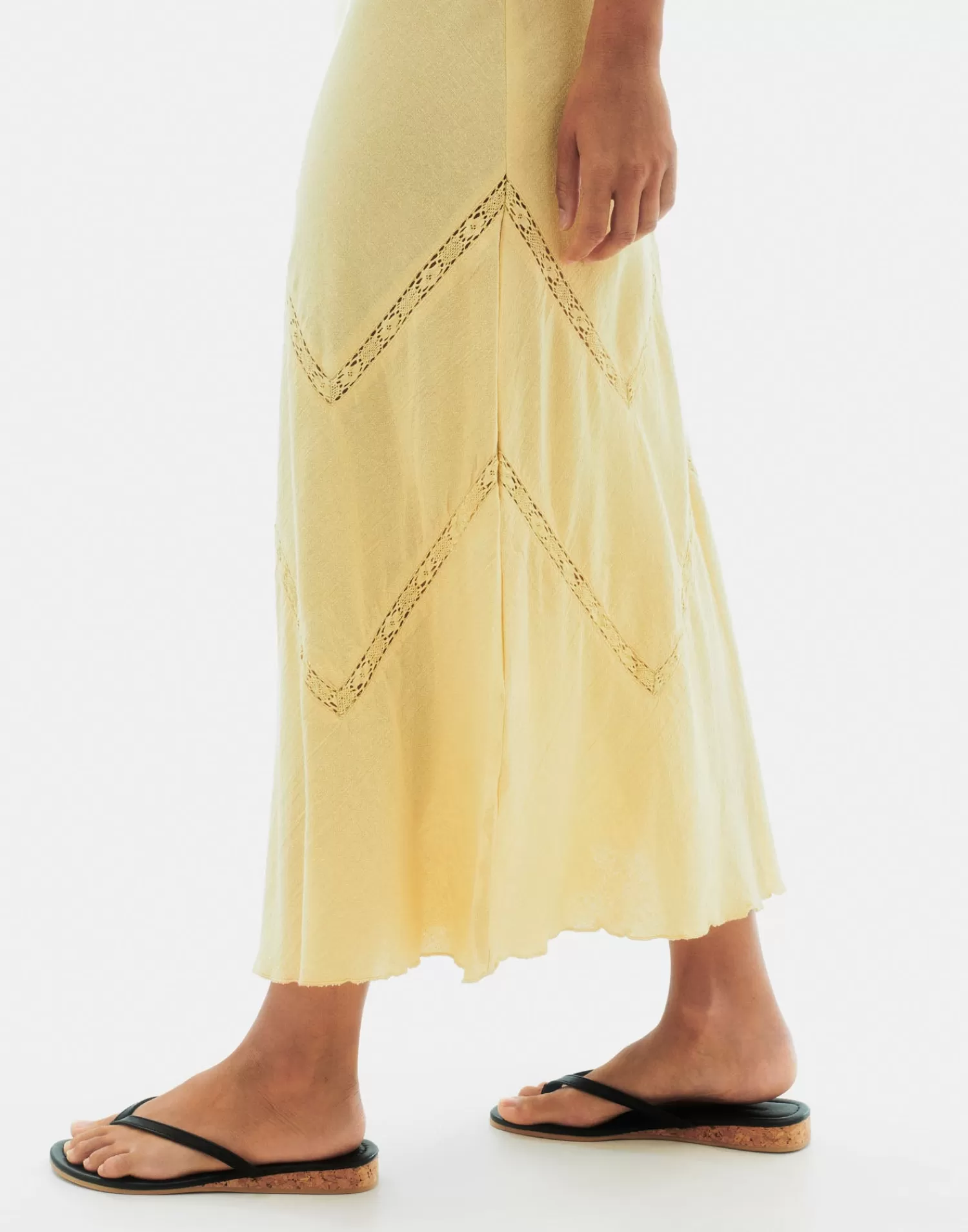 Long cotton dress with 3/4 sleeves, V-neck, and lace details.