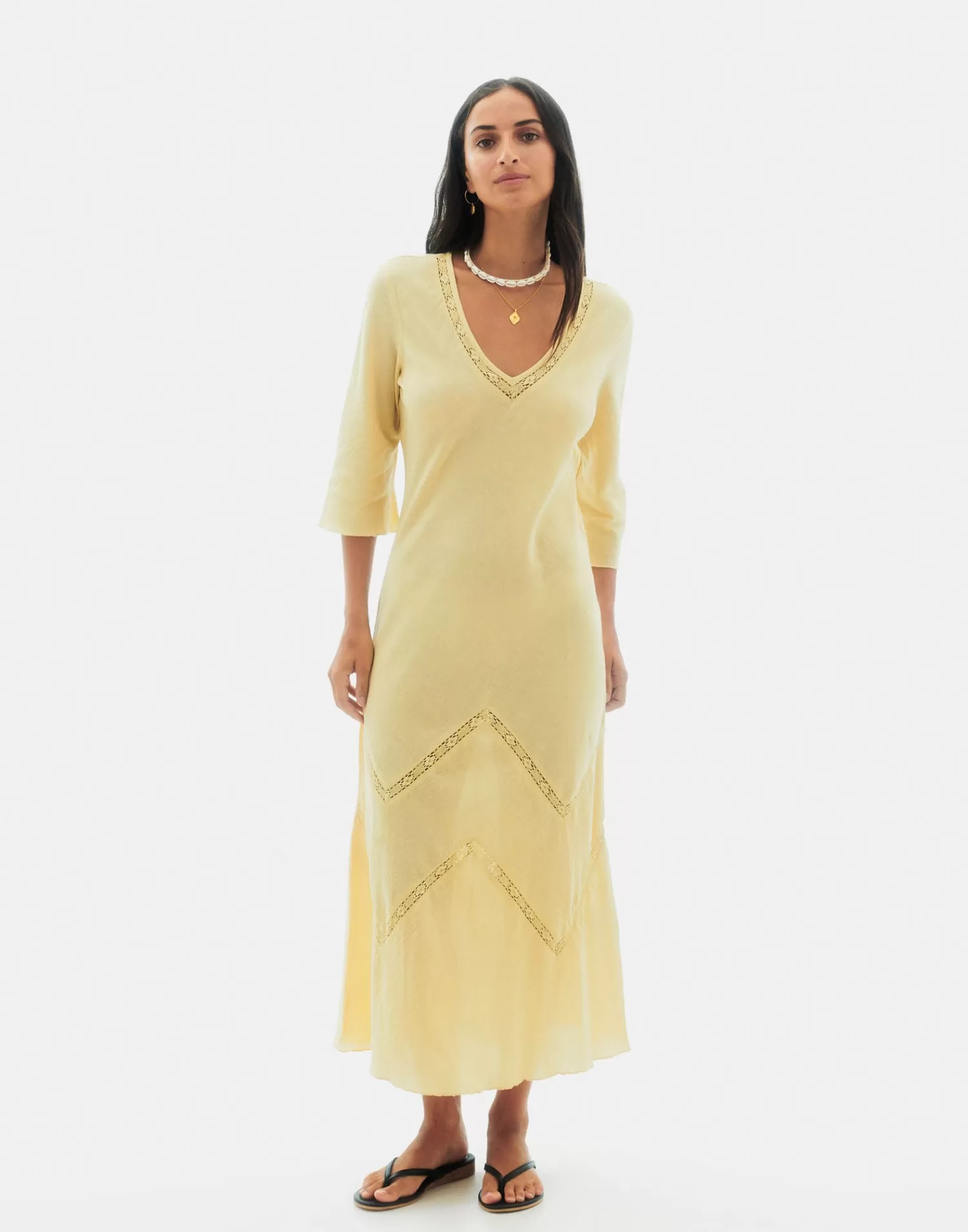 Long cotton dress with 3/4 sleeves, V-neck, and lace details.The model is 1.71 m tall.