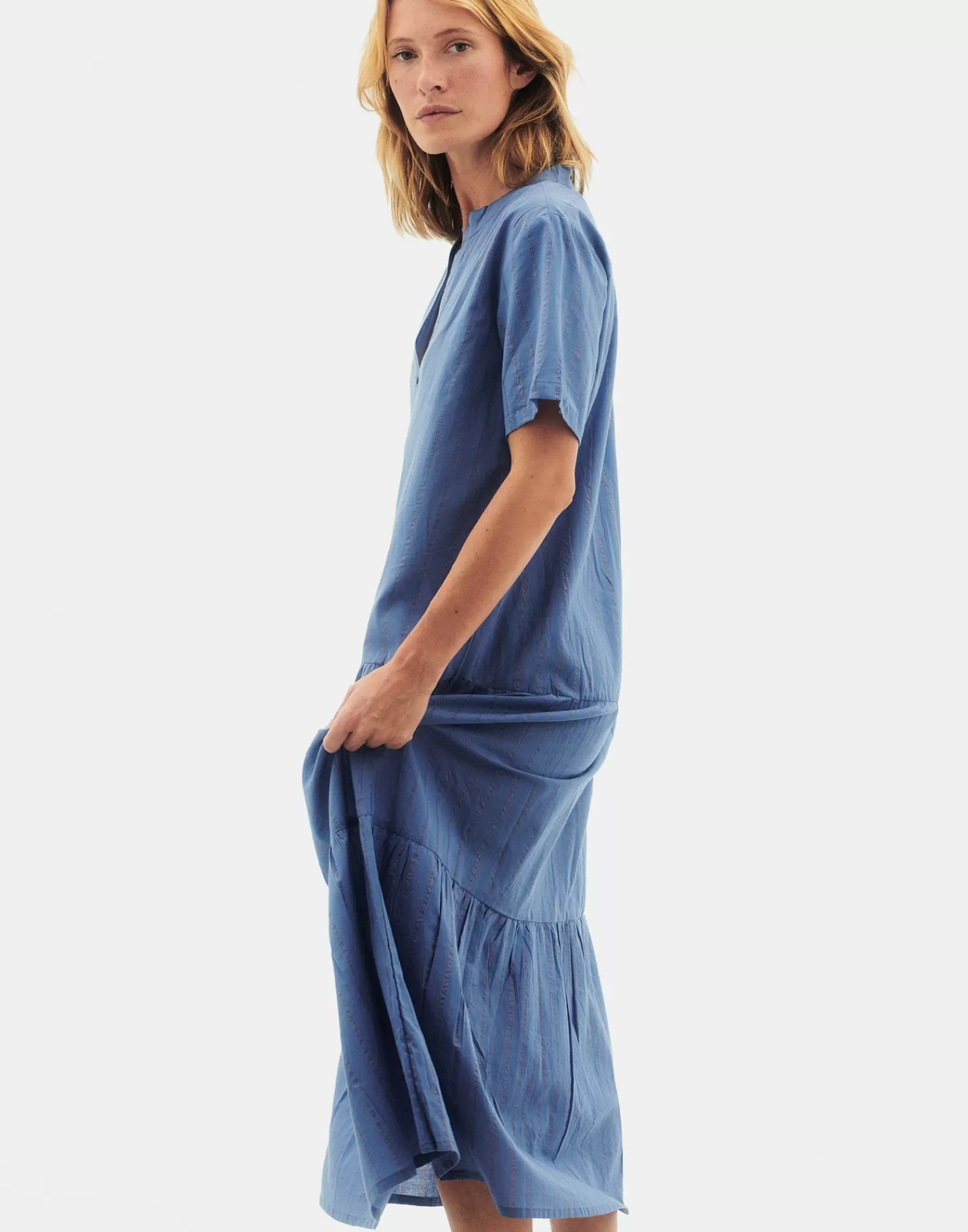 Short-sleeved dress with a v-neckline, ruffles, and metallic thread stripes. The model is 1.77 m tall.