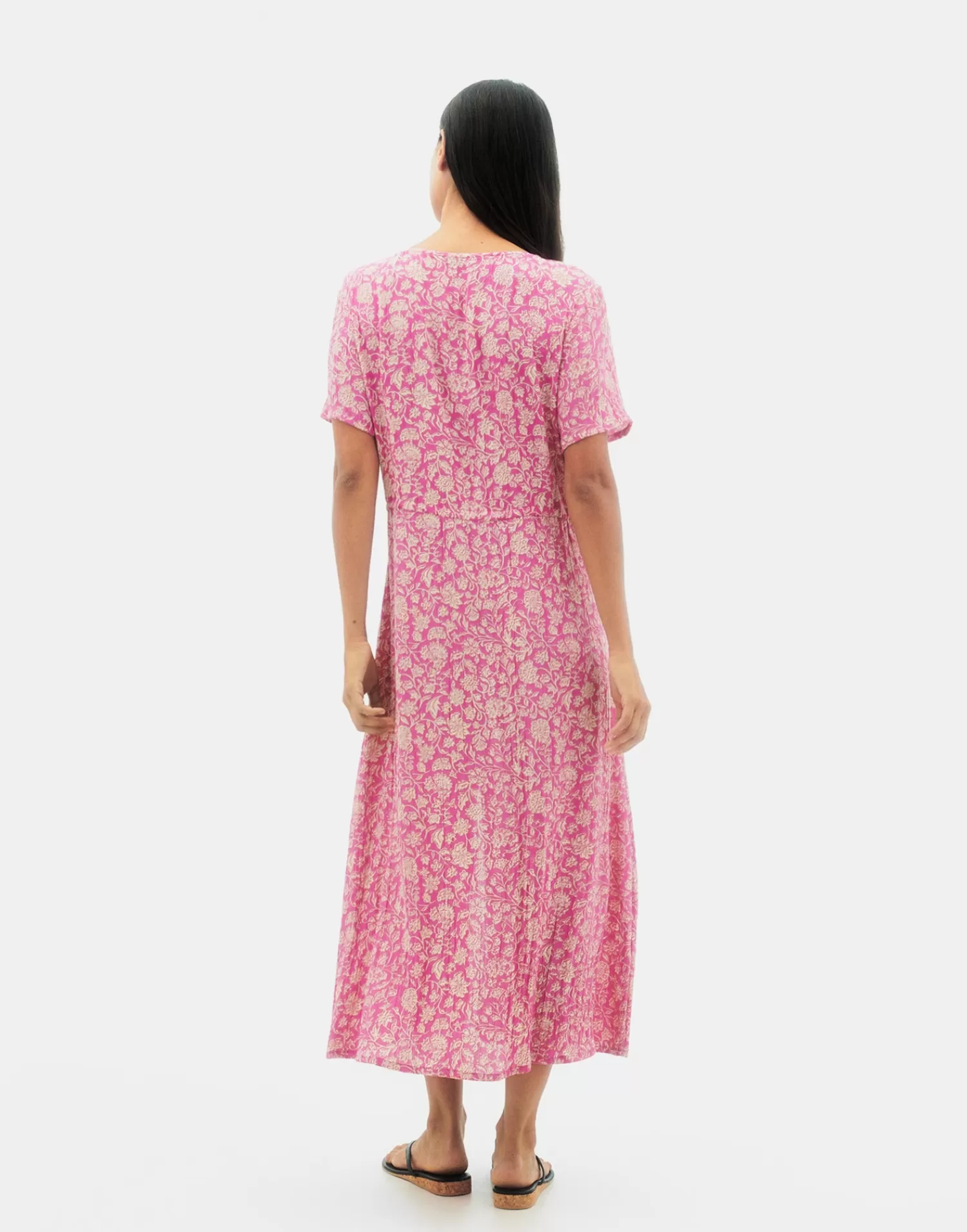 Long dress featuring a floral print, round neckline, short sleeves, and a button-front closure. Adjustable waist with tie.