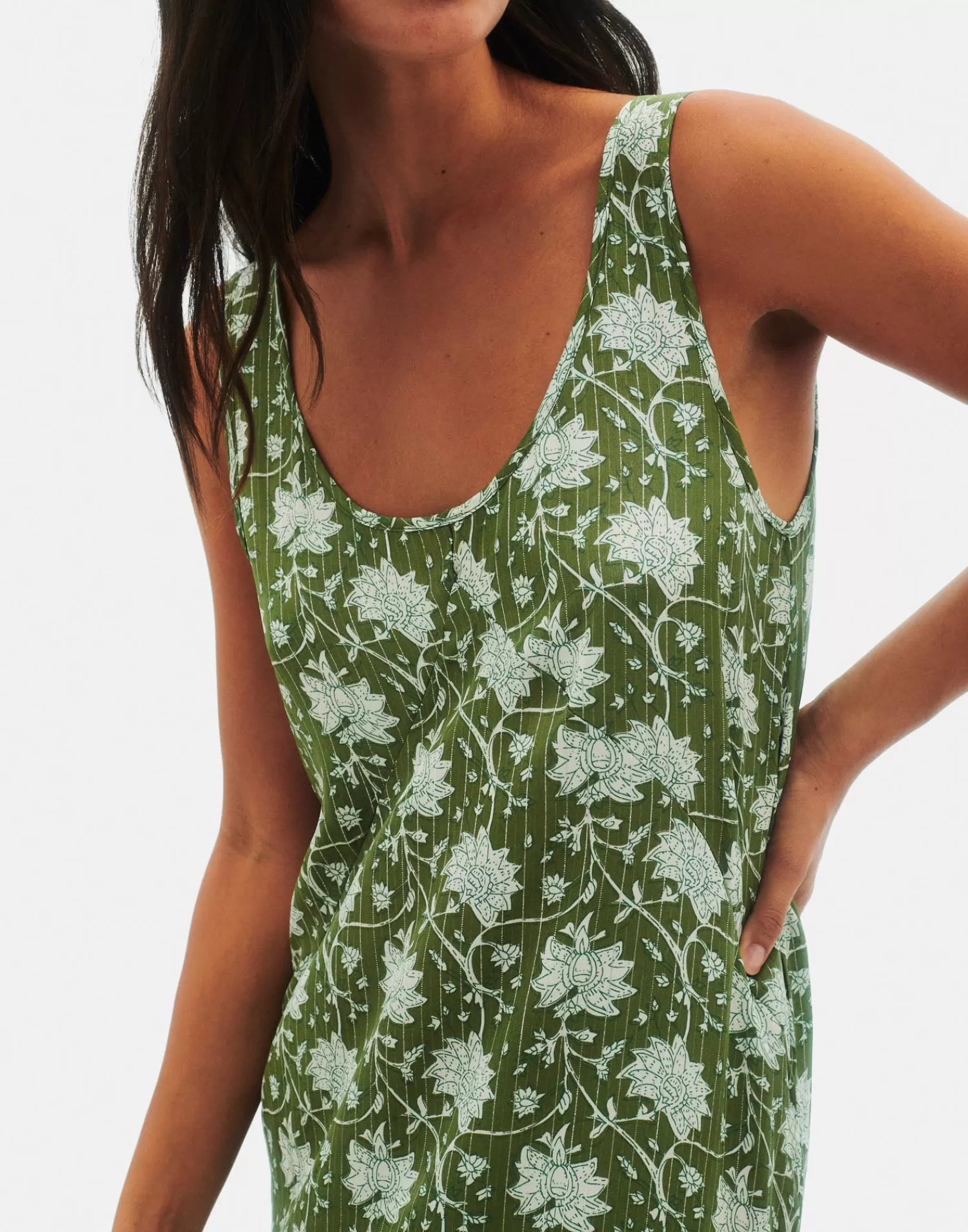 Long sleeveless dress featuring an all-over print and a scoop neckline.The model is 1.71 m tall.