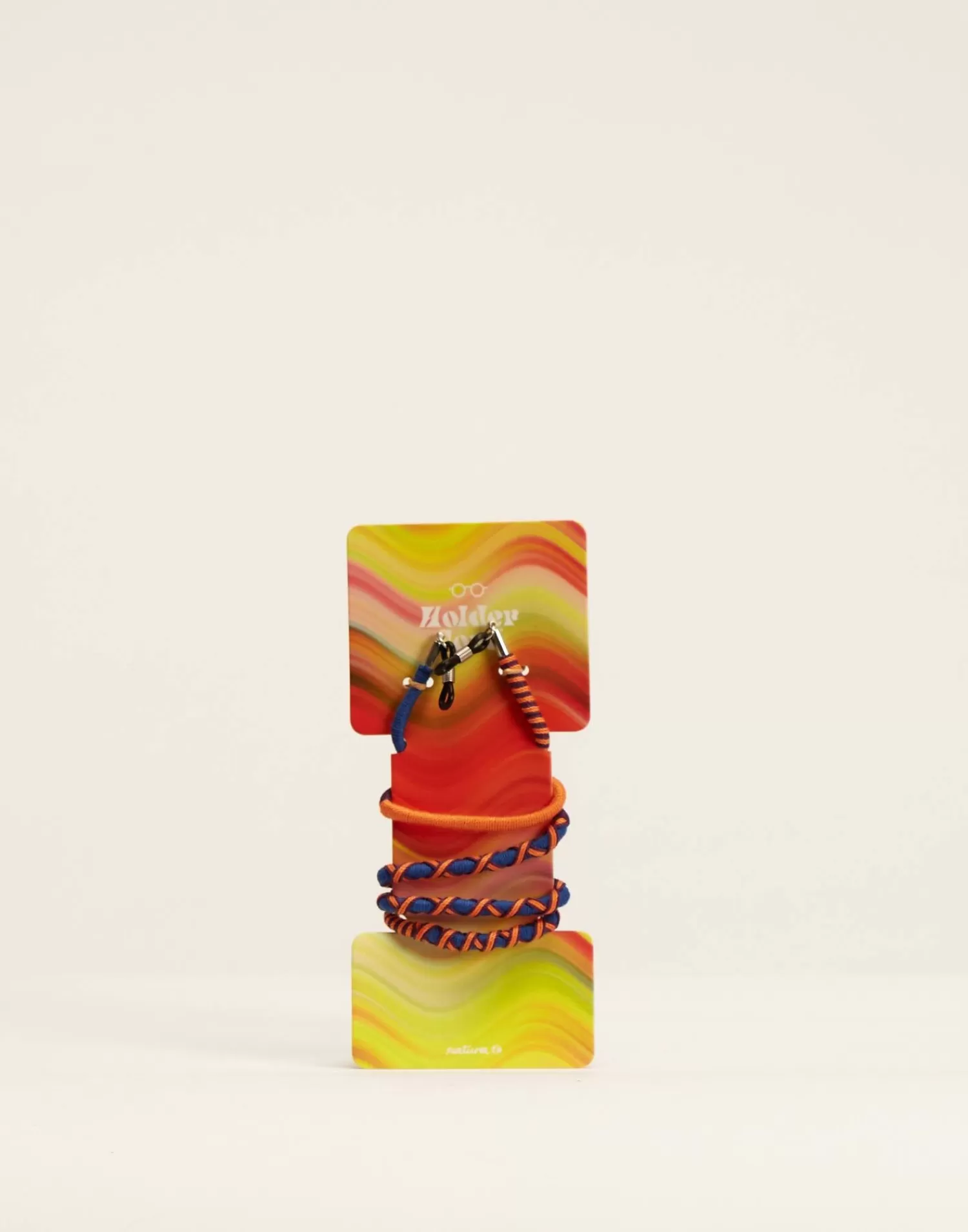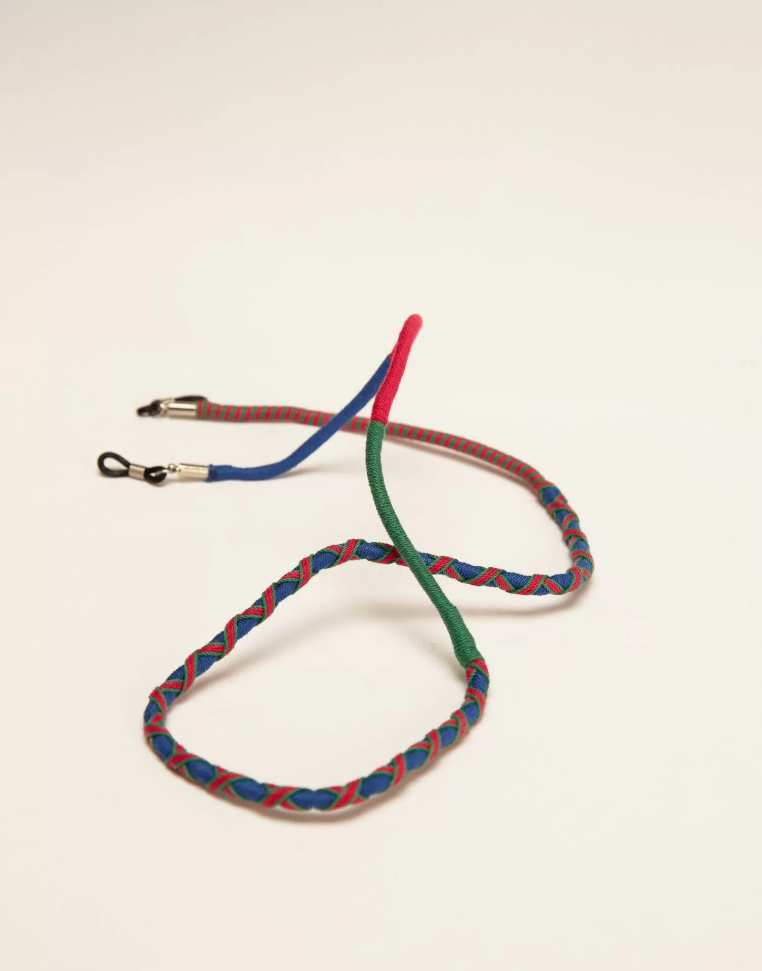 Keep your glasses secure with this colorful rope chain, featuring flexible holds to harness. Hold them in place around your neck when not in use.