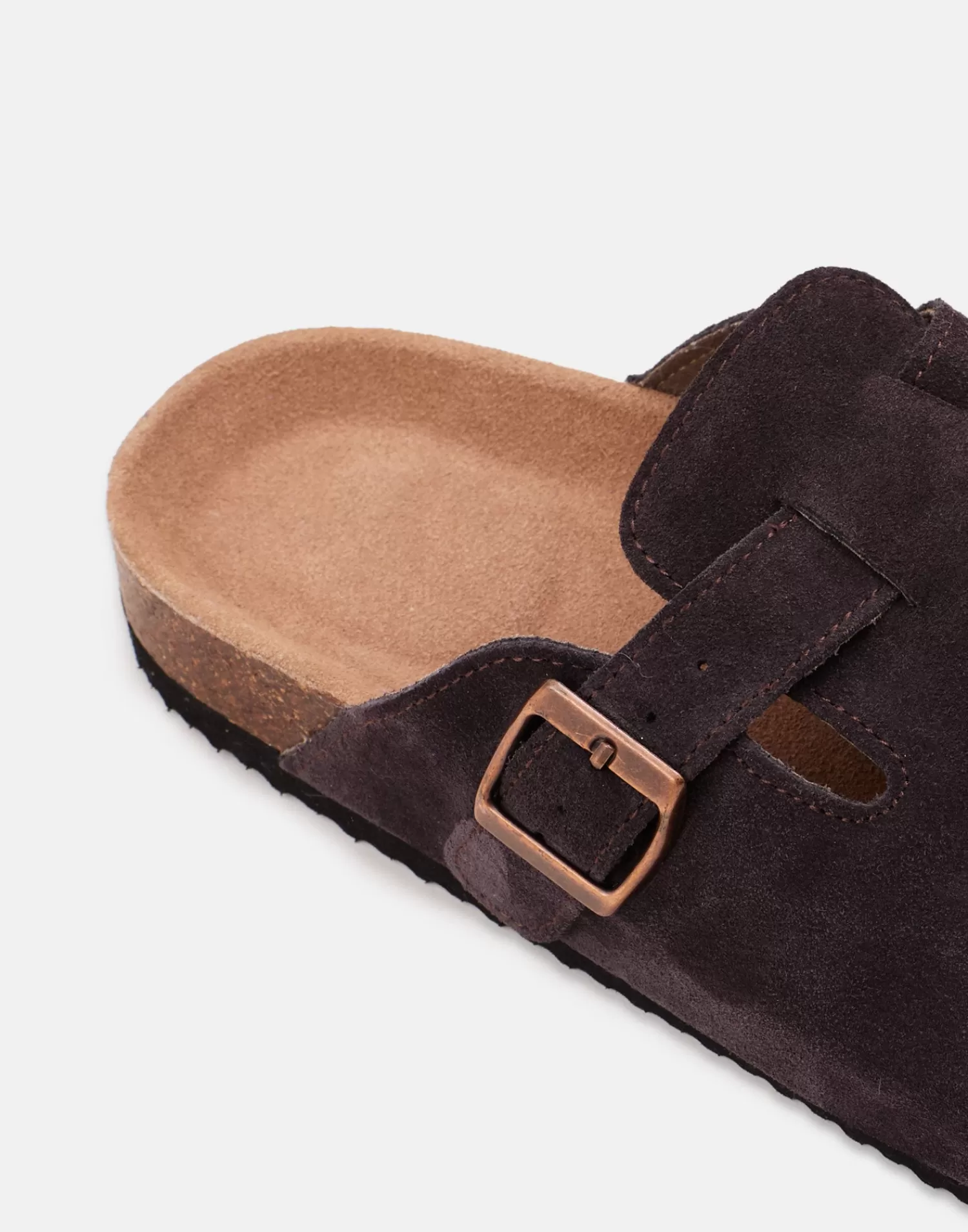 Men’s backless clog-style shoe with suede leather upper, cork sole, and buckle detail on the upper.