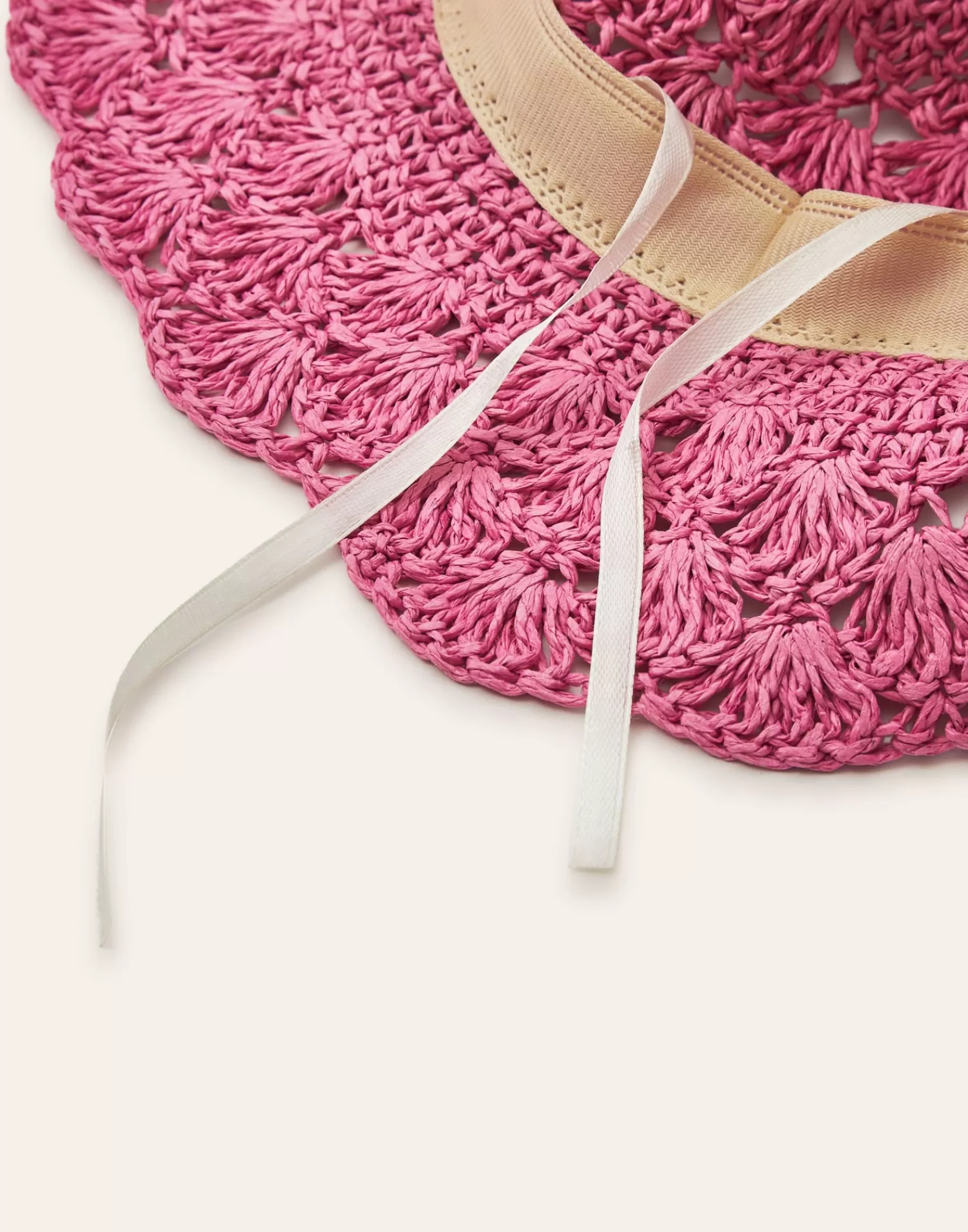 Bucket hat in paper straw with cut-out details. Wide brim, fabric sweatband, and adjustable cord.