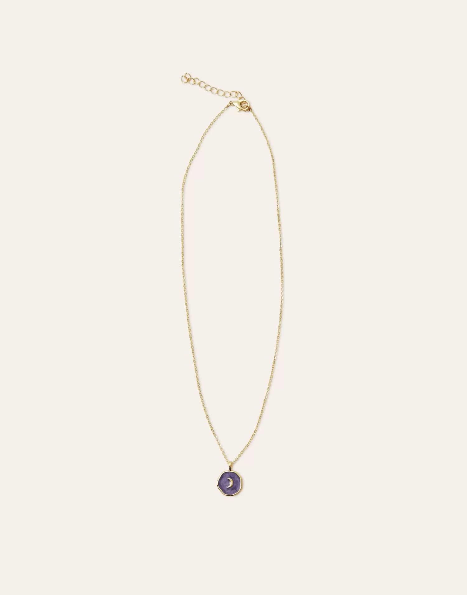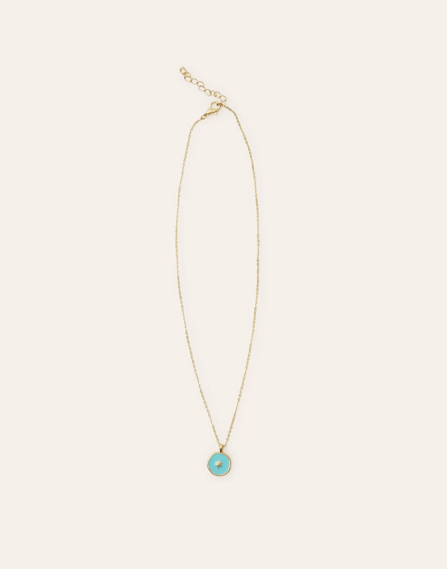 Fine chain necklace with enameled pendant charm. Adjustable length with clasp chain.