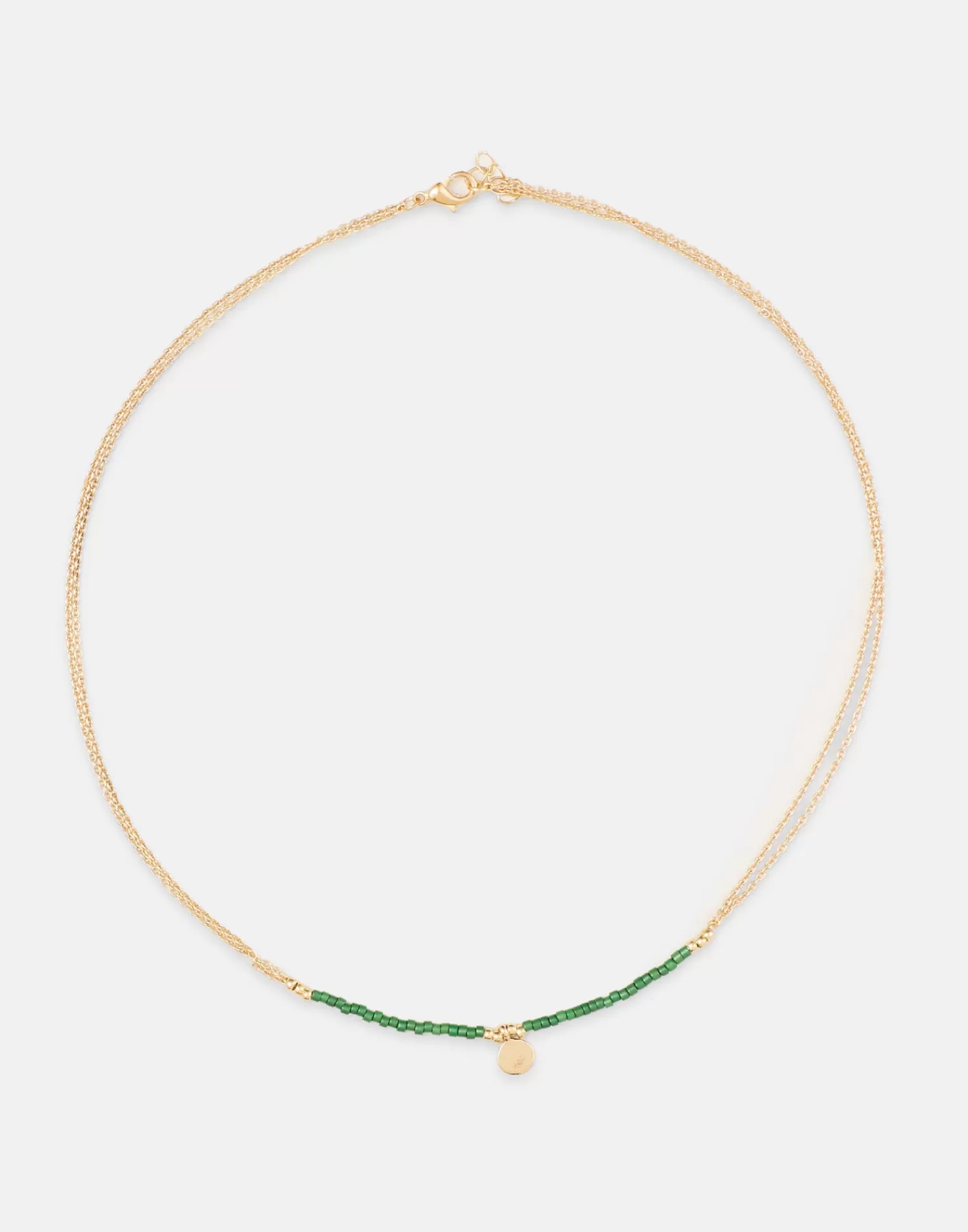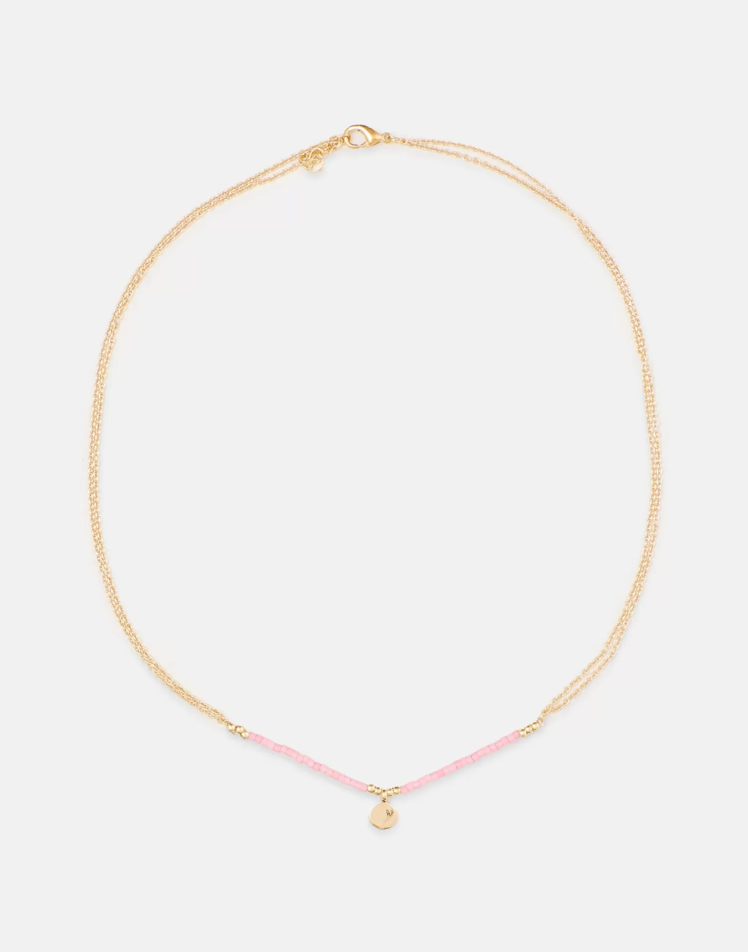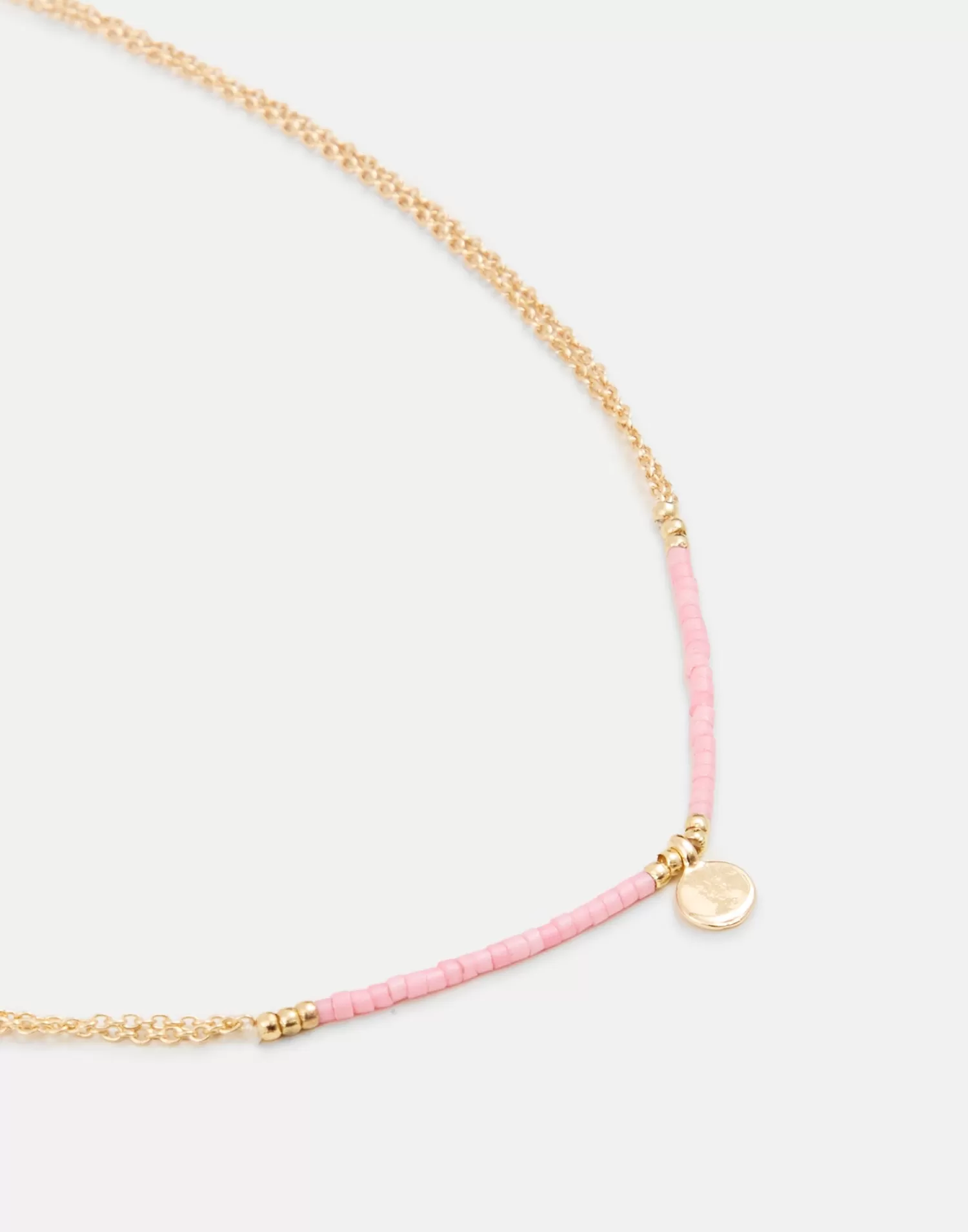 Gold chain necklace featuring color beads and a small medal charm. Lobster clasp closure with adjustable chain.