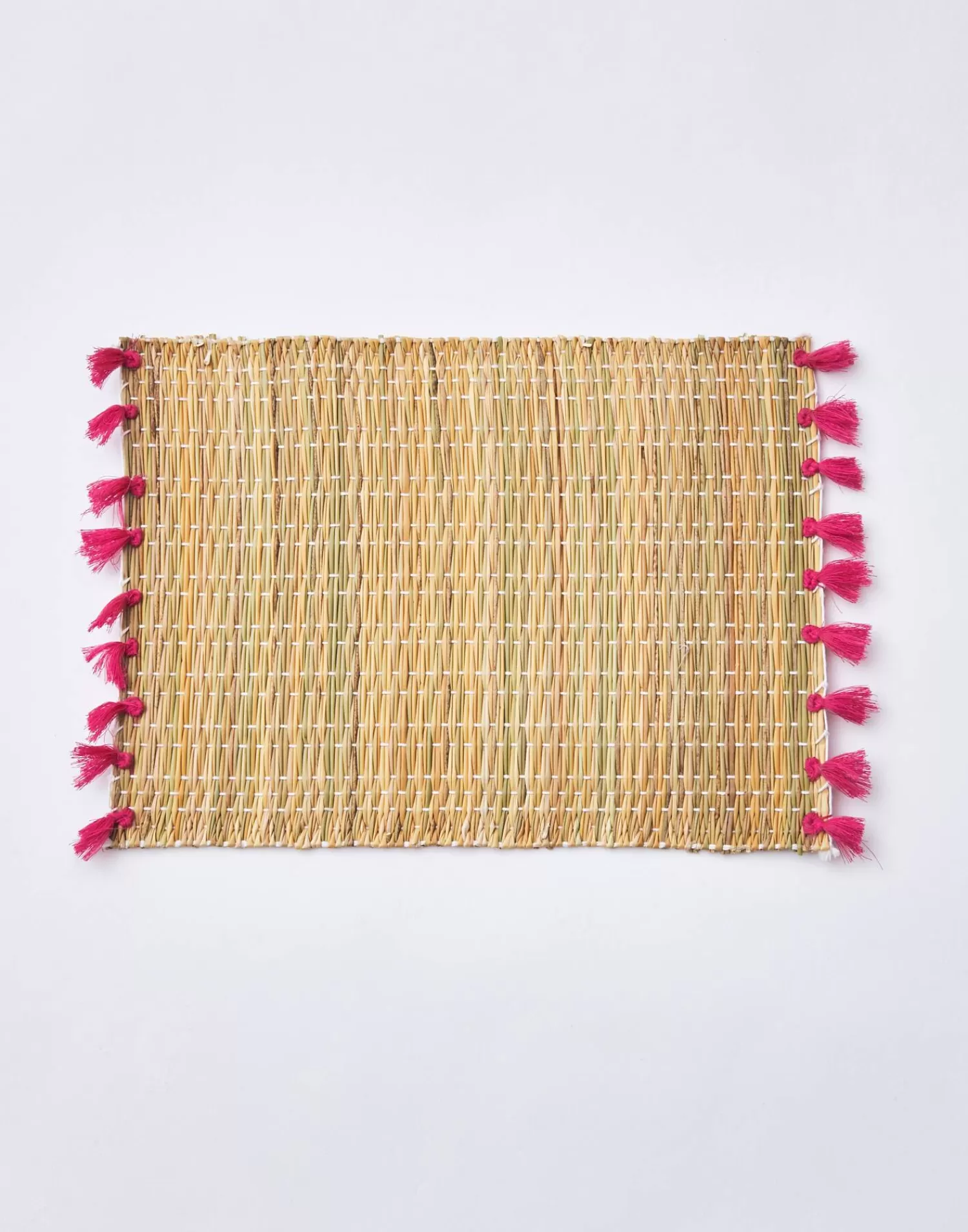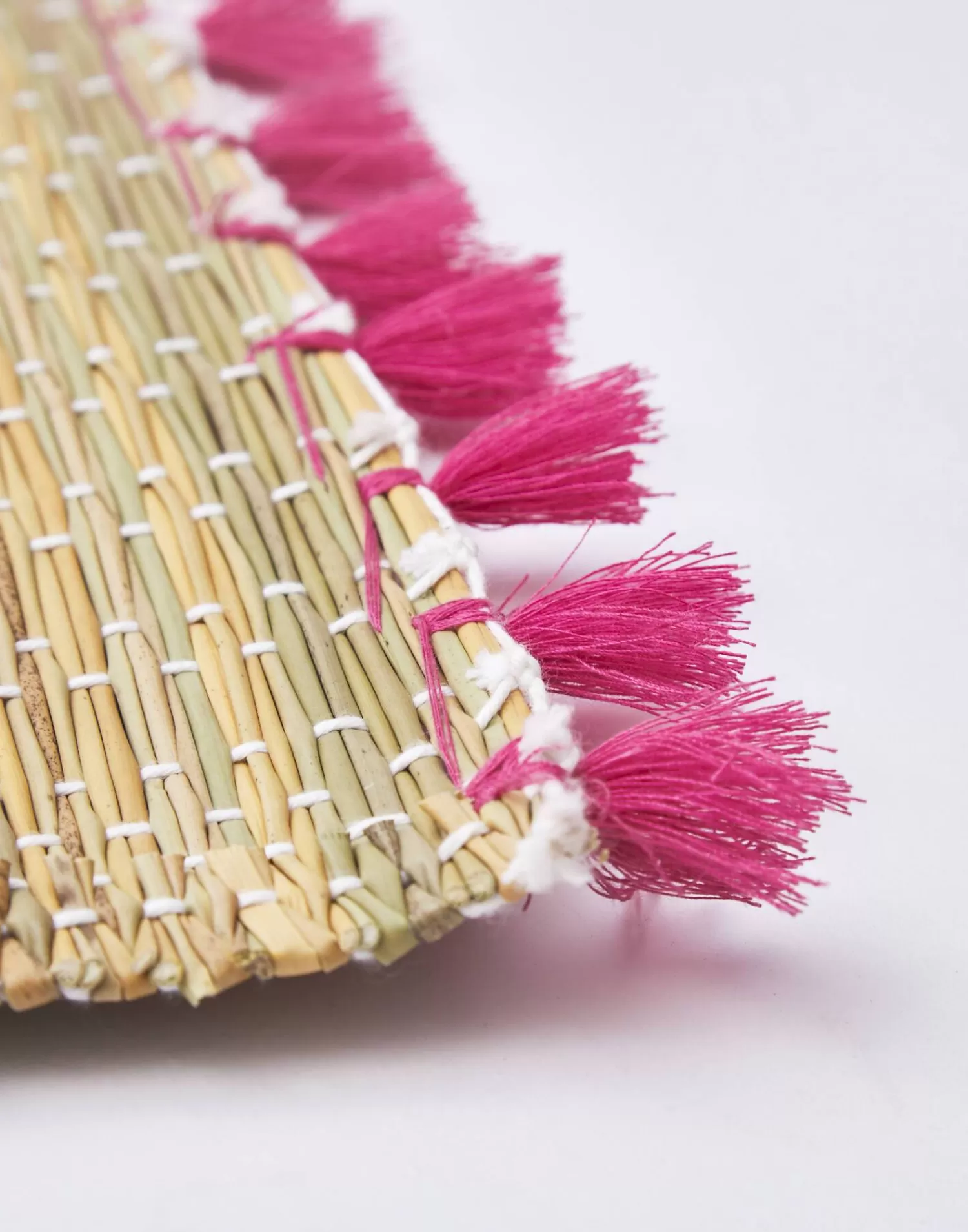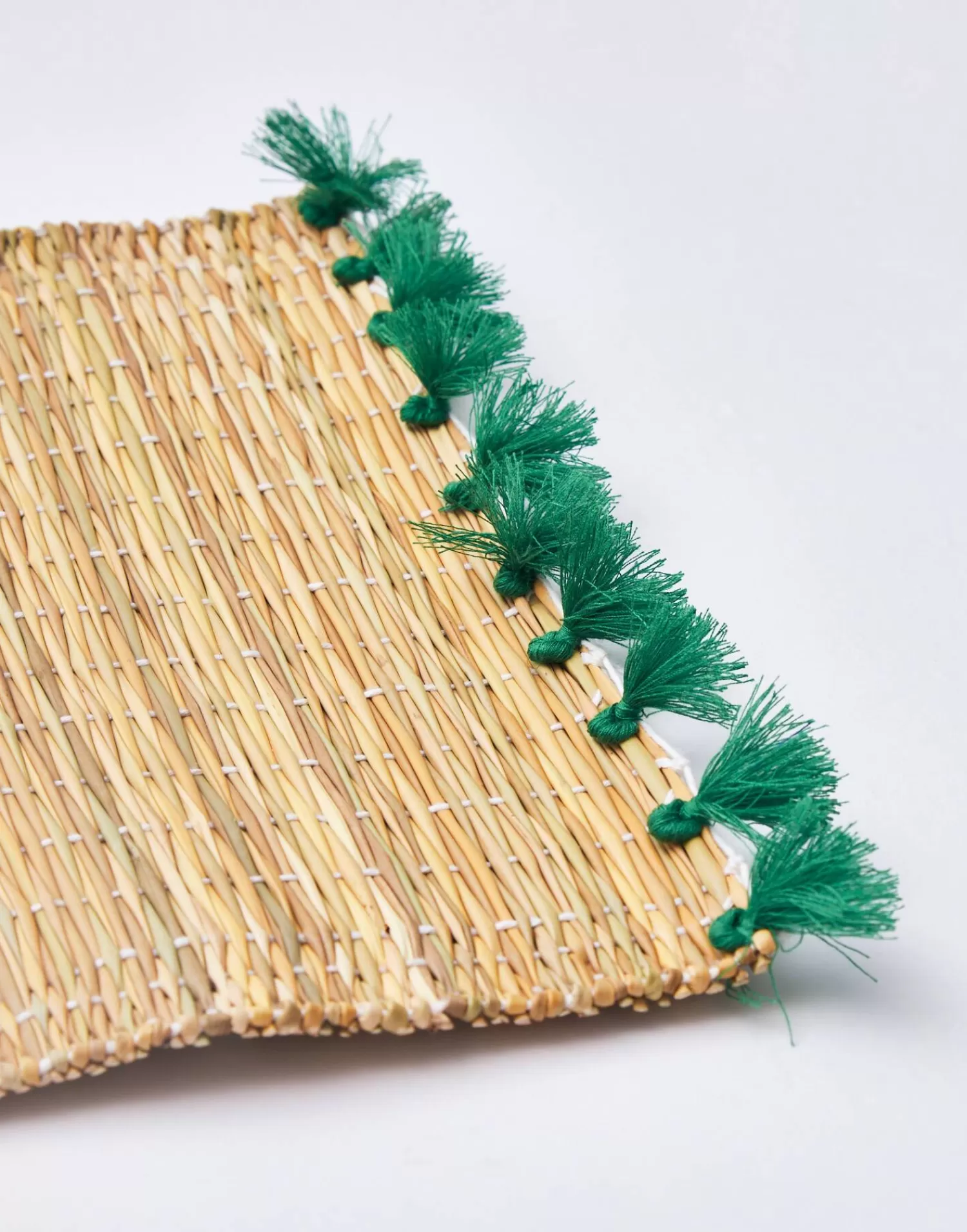 Handmade placemat featuring a trim of pom-poms on two sides, found in Morocco.