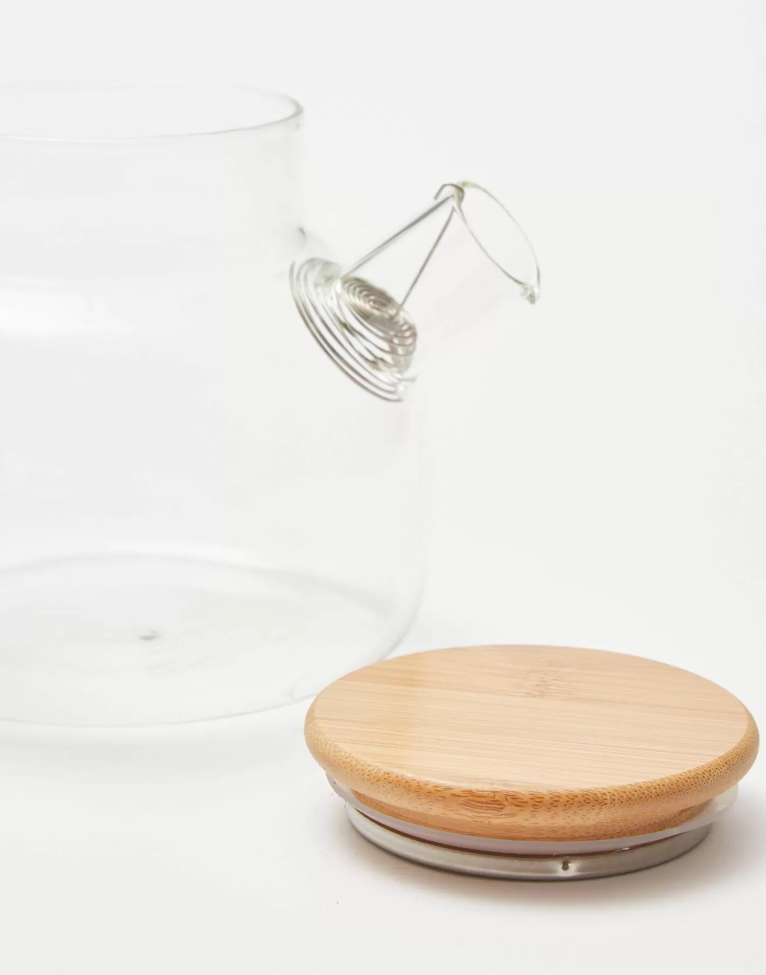 A glass teapot with an infuser and a bamboo lid.Microwave-safe without the stainless steel infuser.Suitable for the refr…