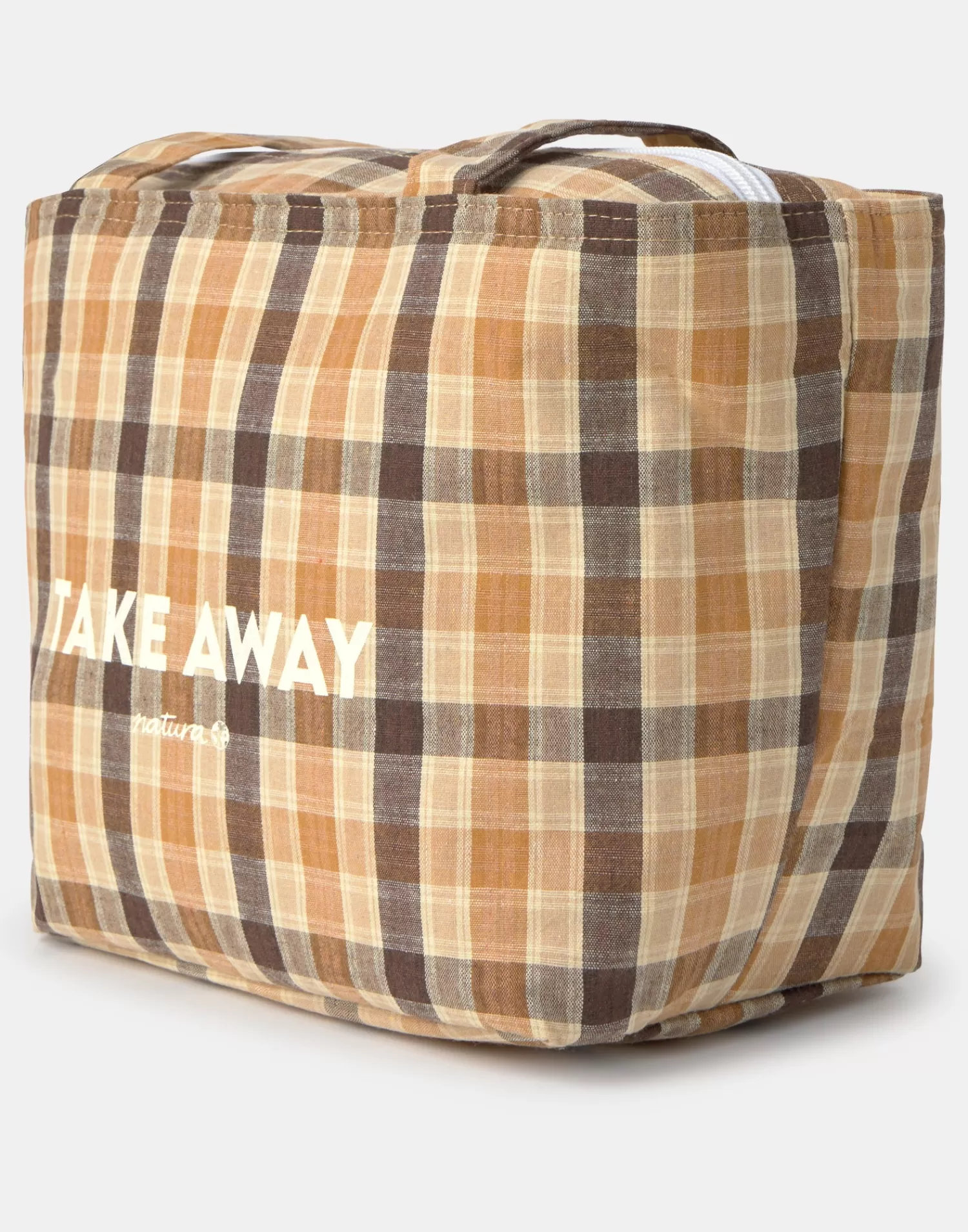 A food-carrying bag with a top zipper closure and long handles.