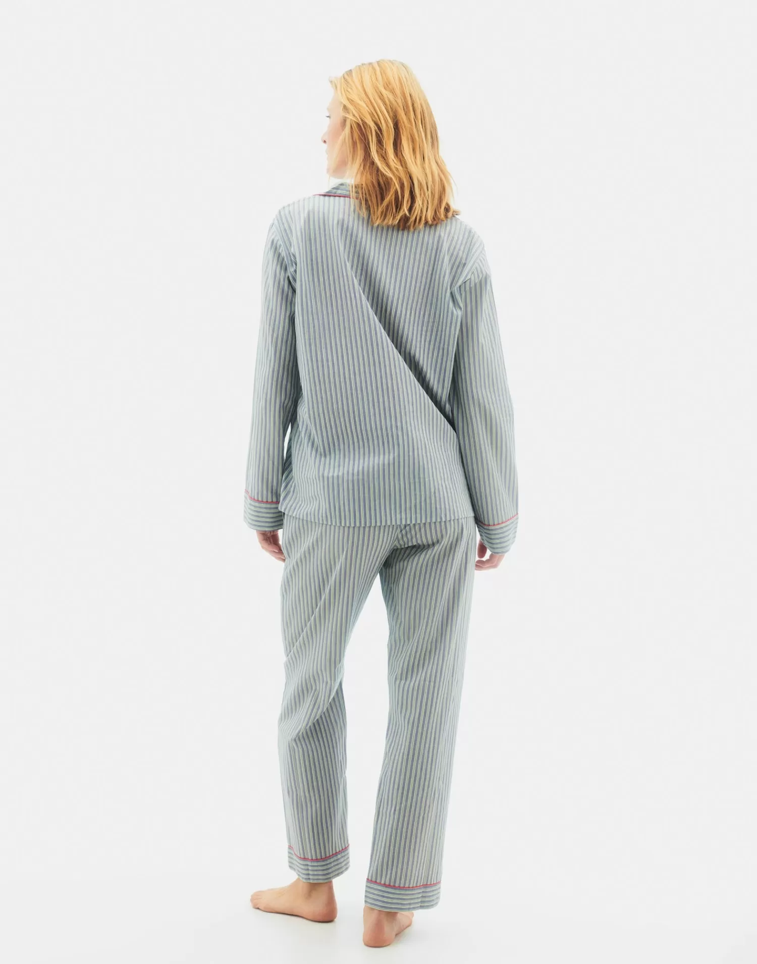 A printed pajama set consisting of two pieces: a long-sleeve shirt and long pants.