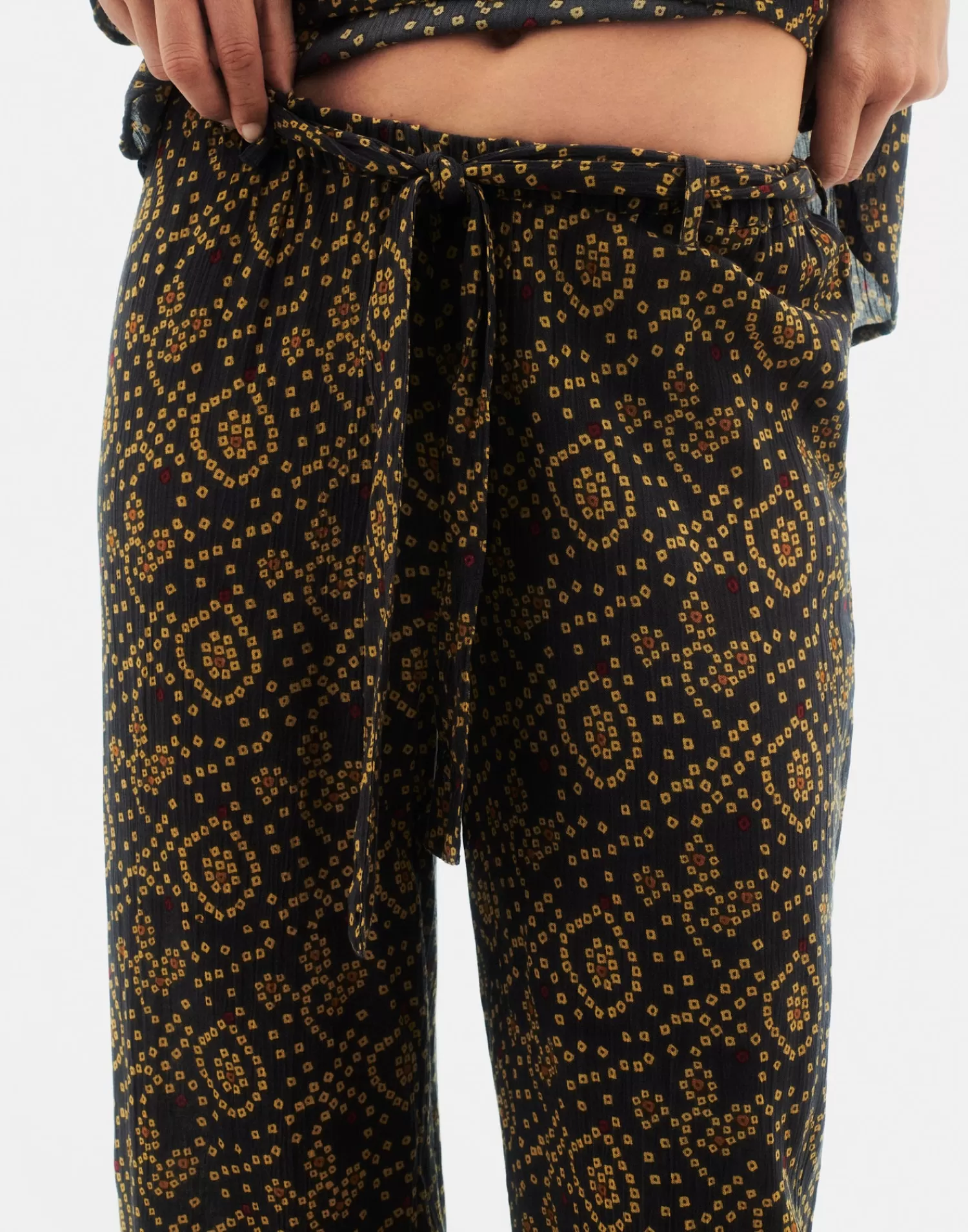 Straight-leg pants featuring a bandani print and an adjustable elastic waistband with tie.