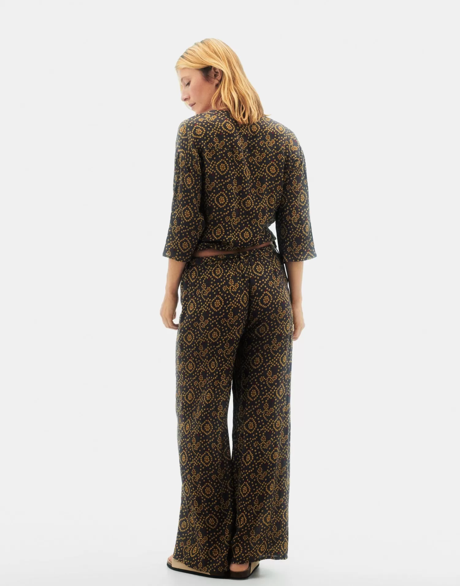 Straight-leg pants featuring a bandani print and an adjustable elastic waistband with tie.The model is 1.77 m tall.