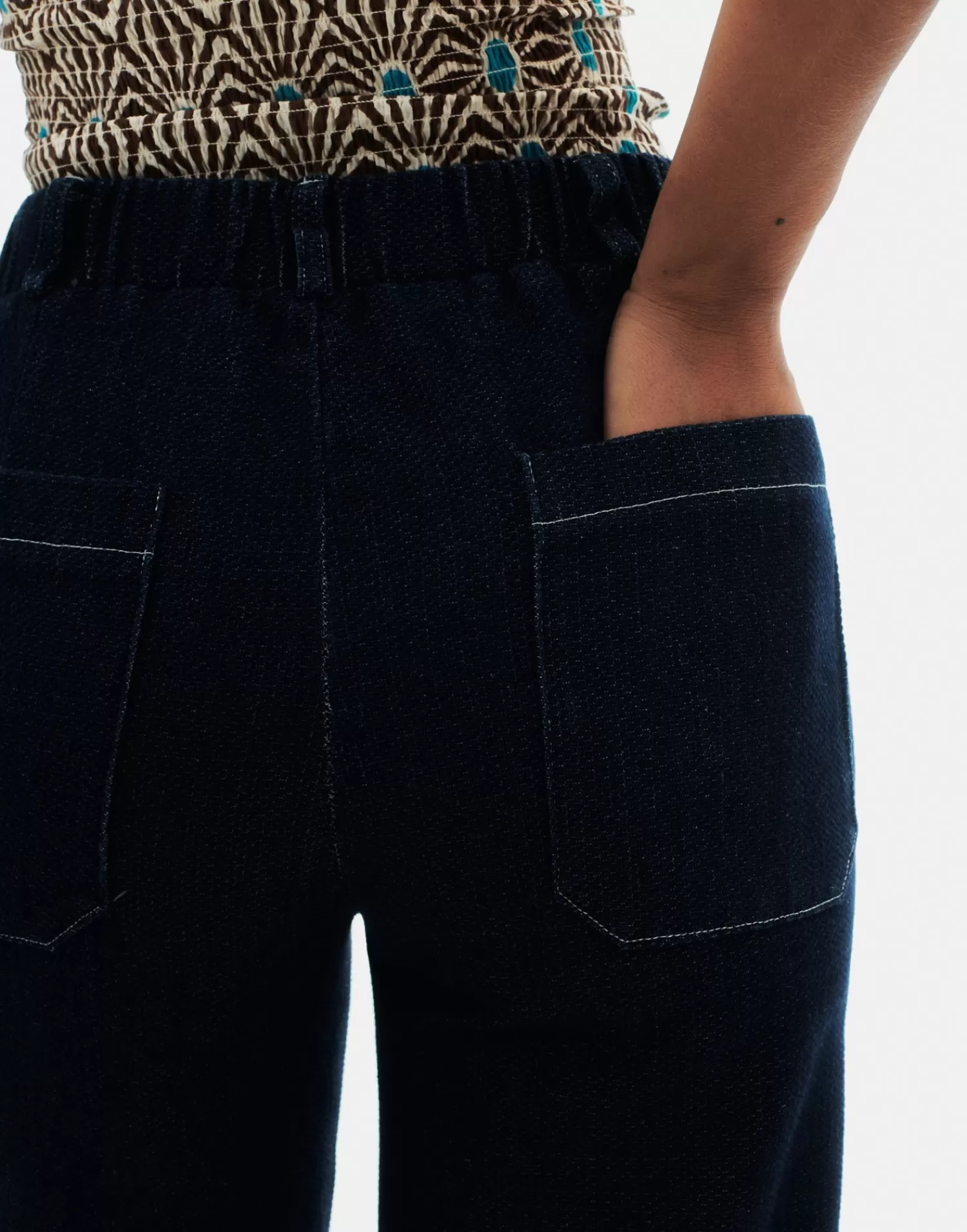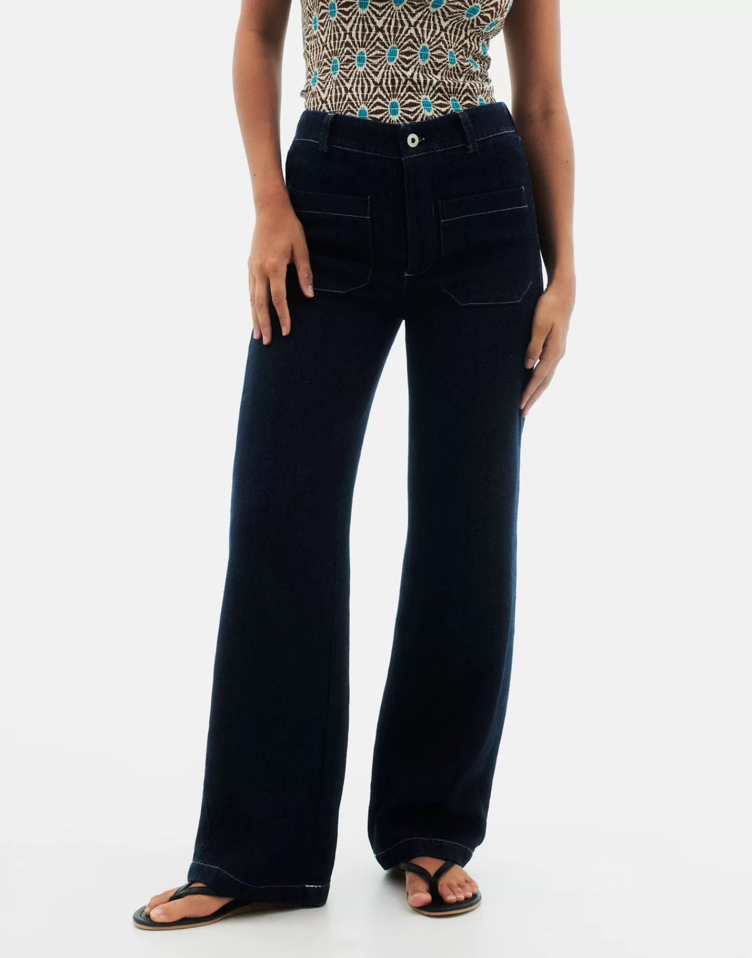 Straight-cut, high-waisted denim pants featuring front button closure and hidden zipper. Topped with patch pockets at the front and back.