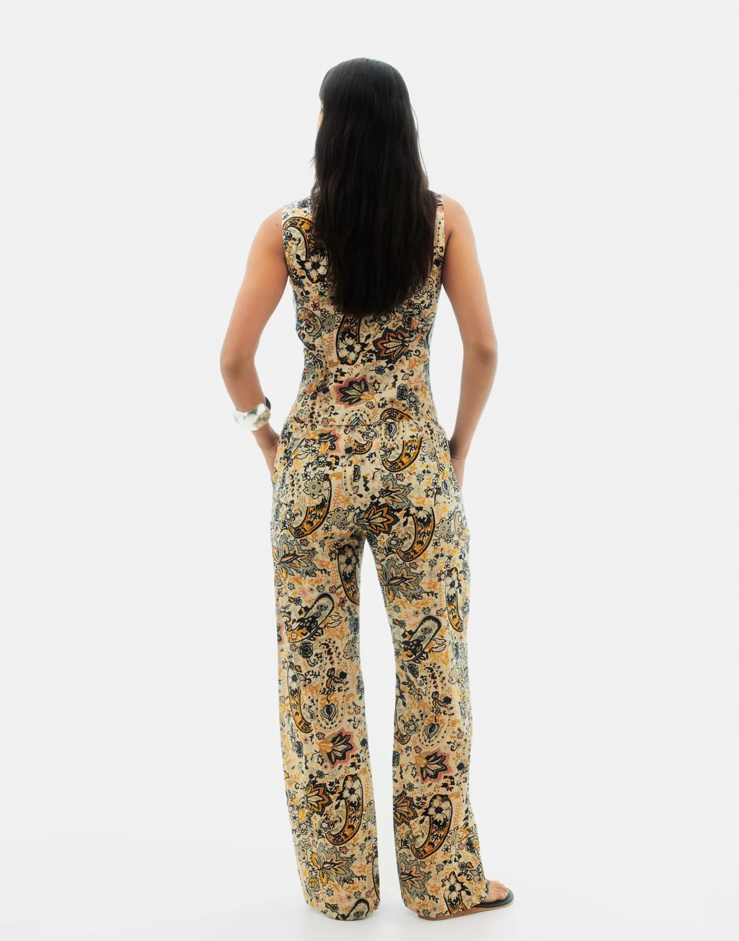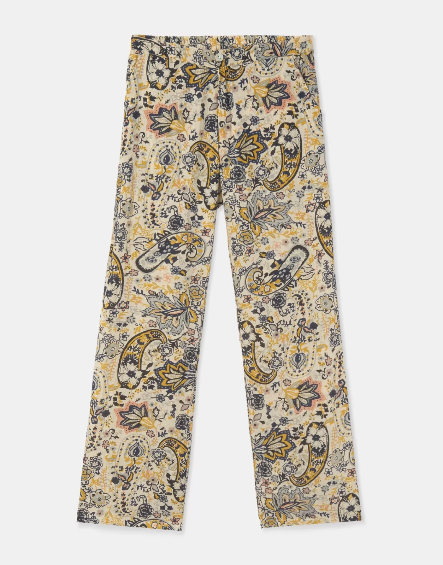Straight-cut printed pants featuring a button and zipper closure and side pockets.