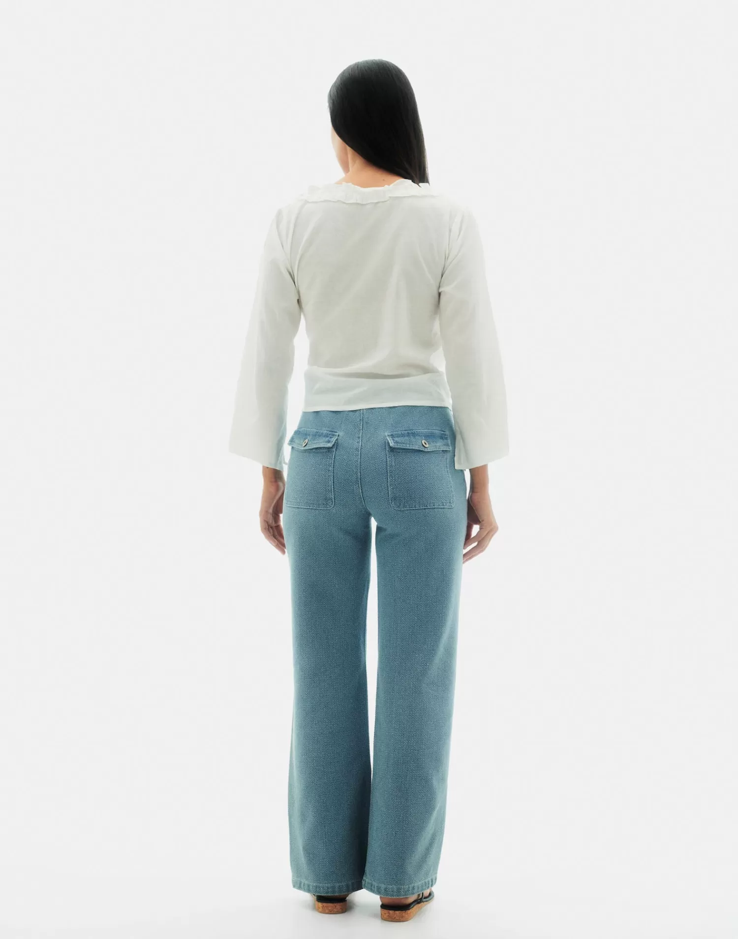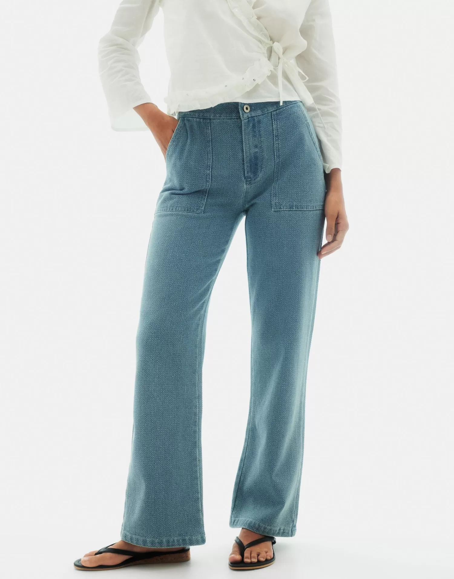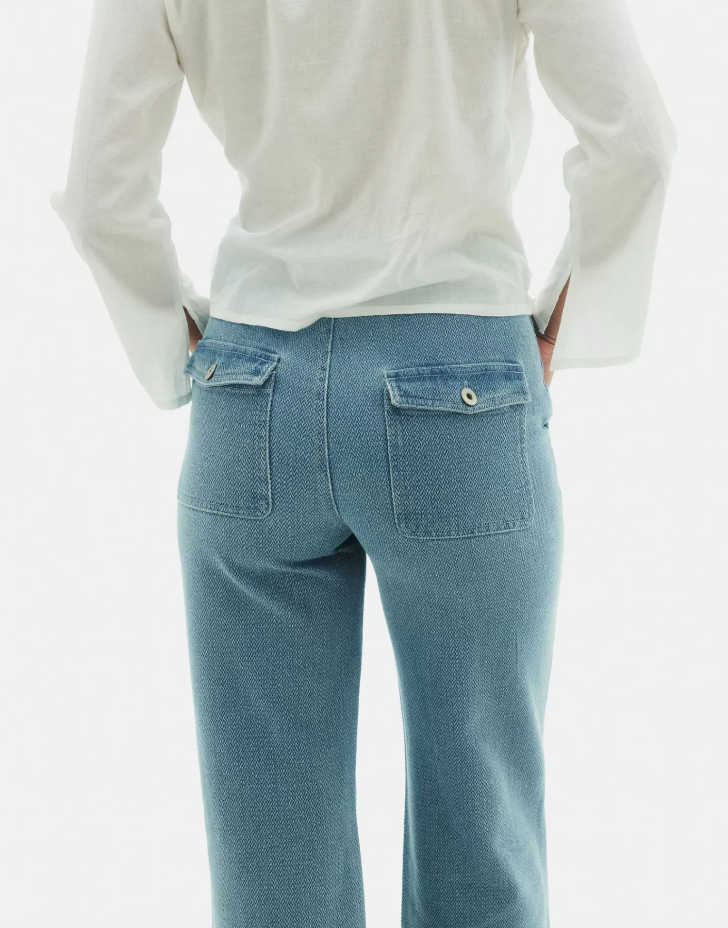 High-waisted, straight-cut jeans made of cotton. Front patch pockets and back pockets with flaps and button closure. Finished with a front button and zipper closure.