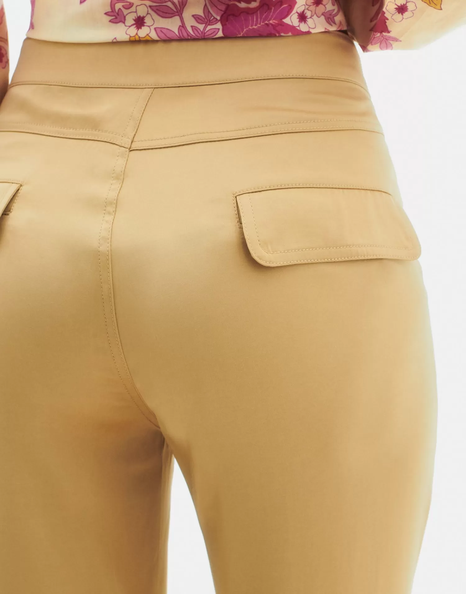 Metallic trousers featuring front pockets and a straight-leg design. Shiny effect fabric and front zip and hook closure.
