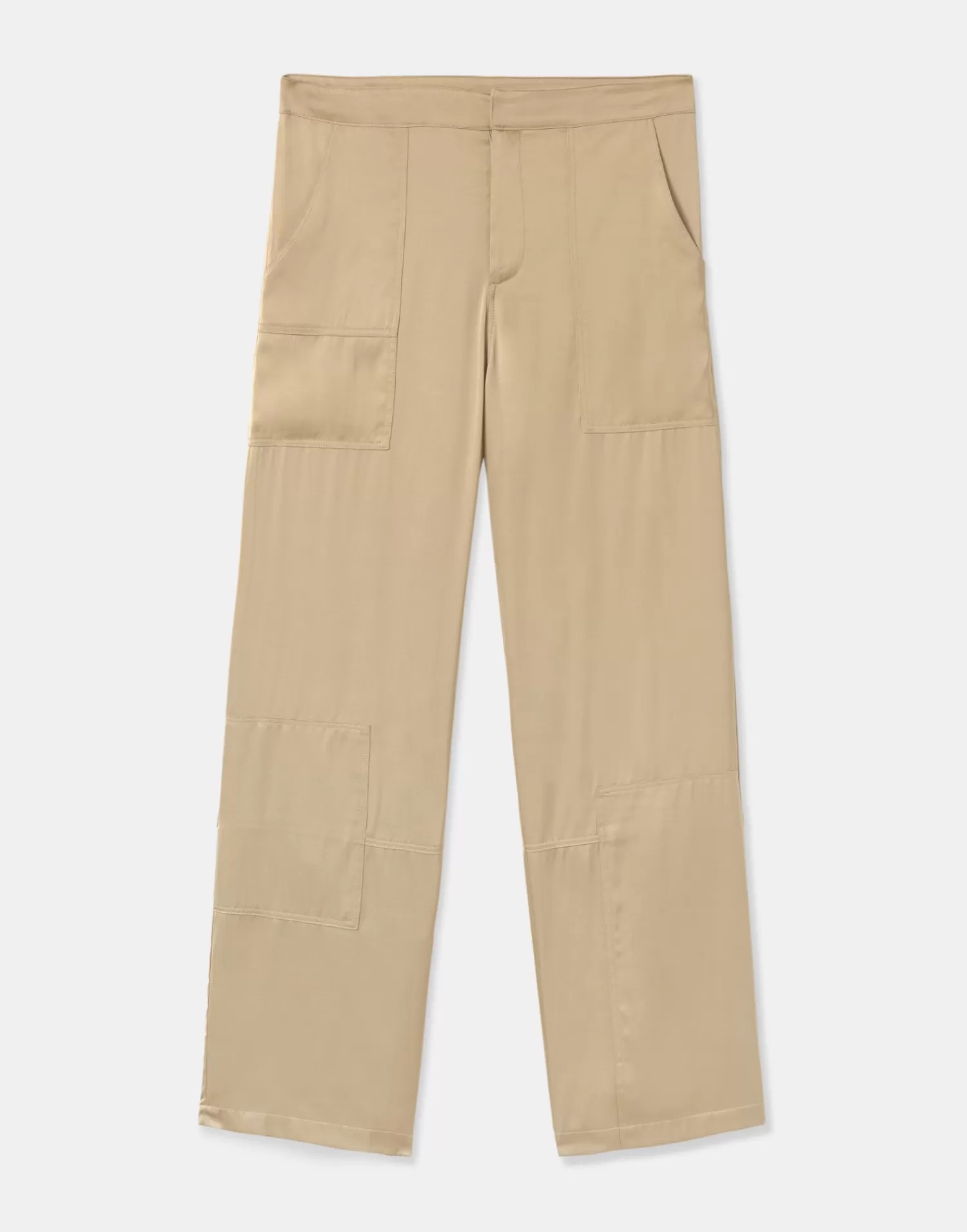 Metallic trousers featuring front pockets and a straight-leg design. Shiny effect fabric and front zip and hook closu…