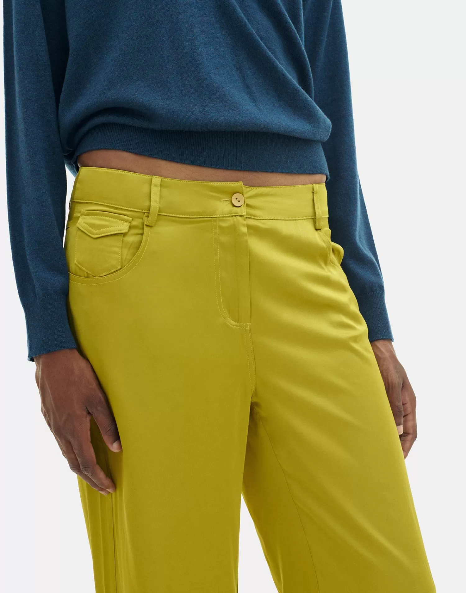 Straight-leg pants made with a flowy satin-finish fabric. Topped with five pockets and a zip fly and button closure.