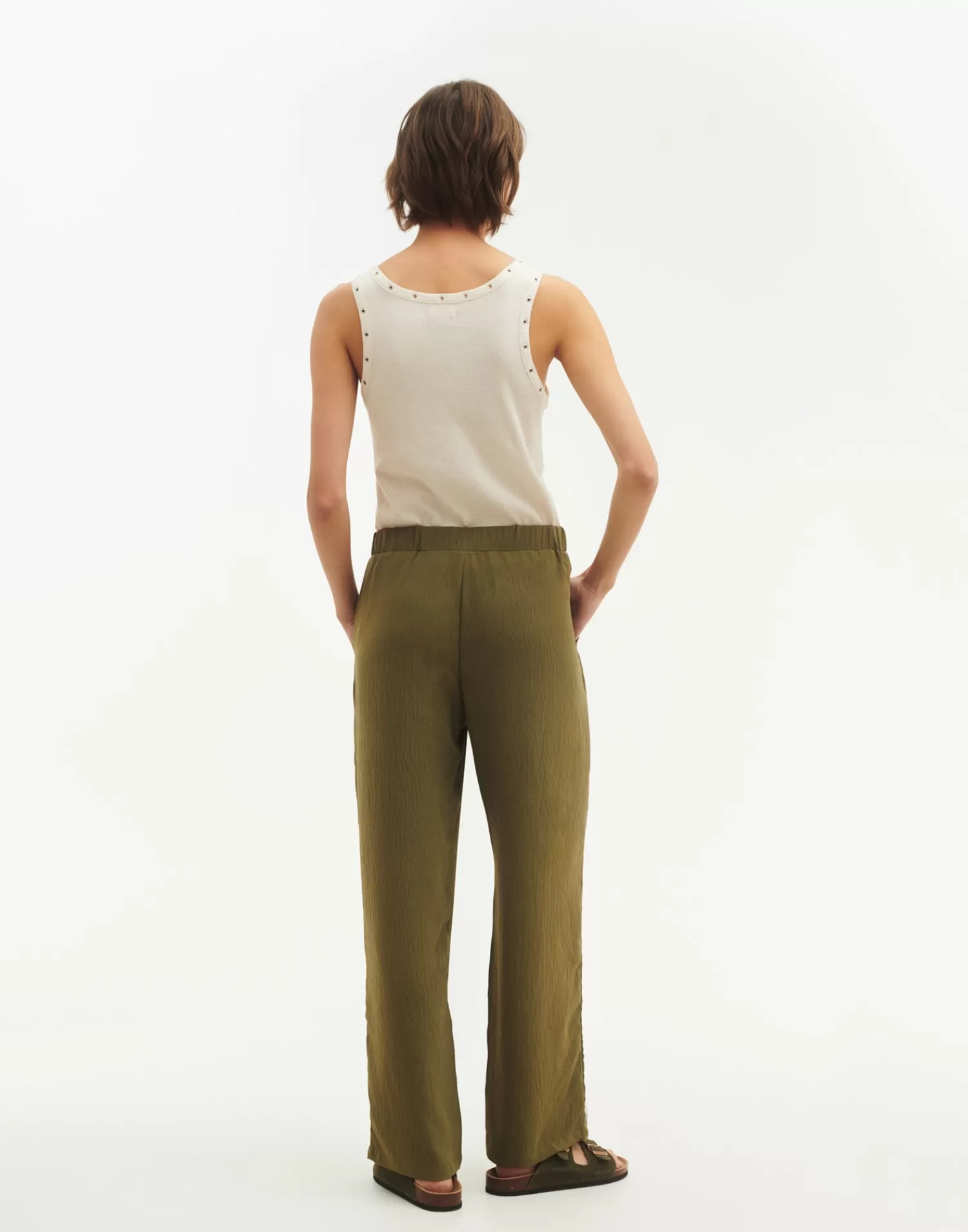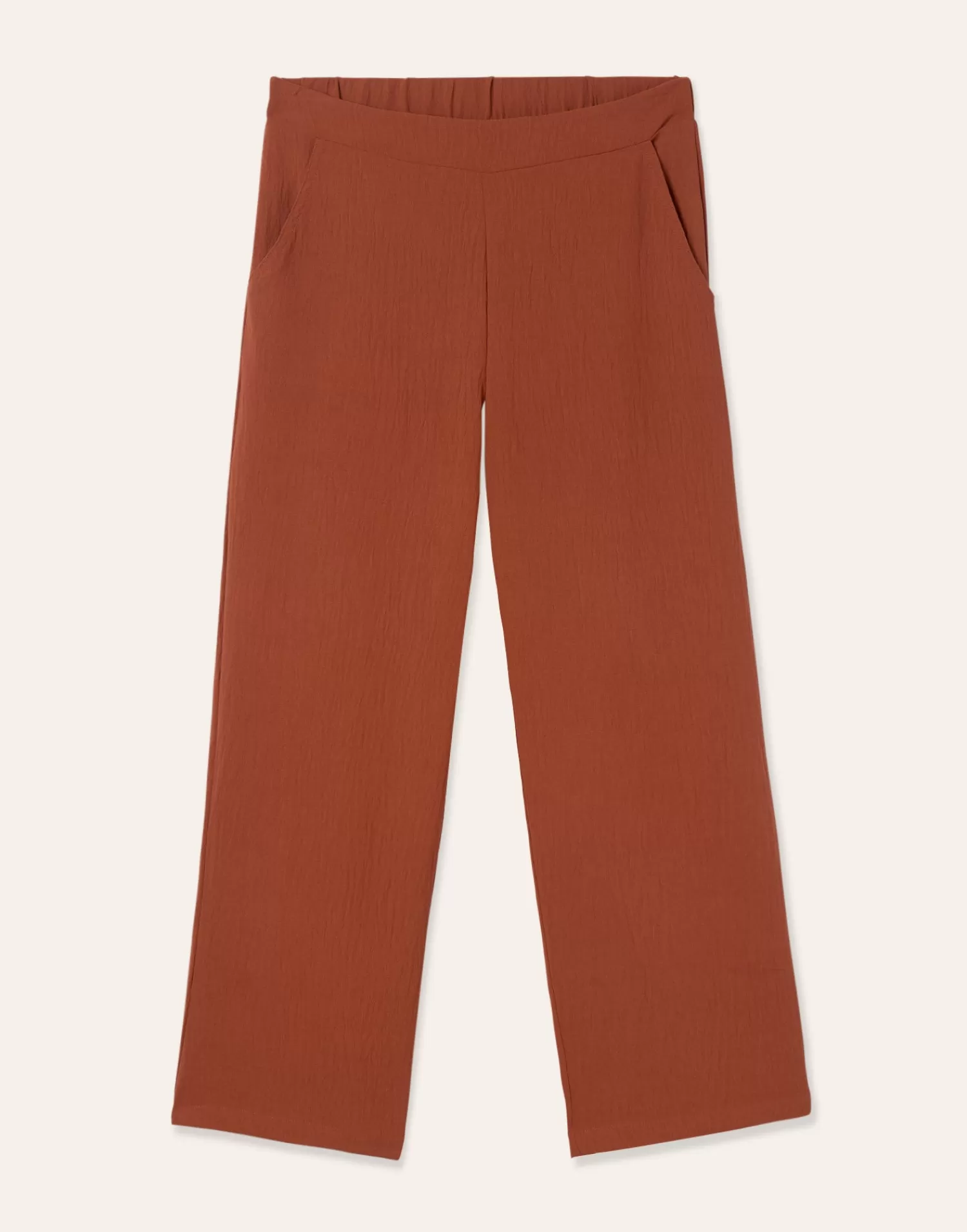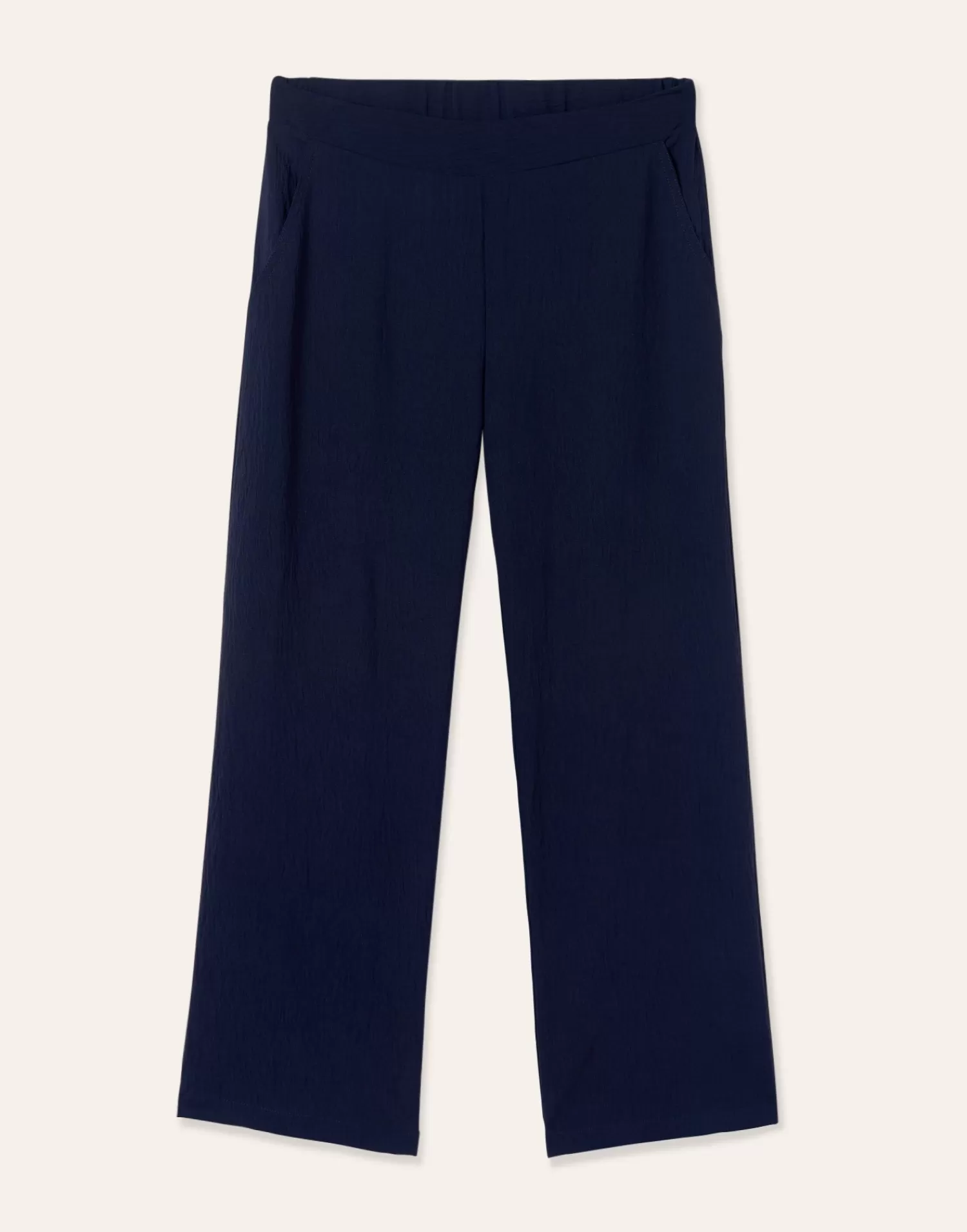 Straight pant featuring an elastic waistband and side pockets.