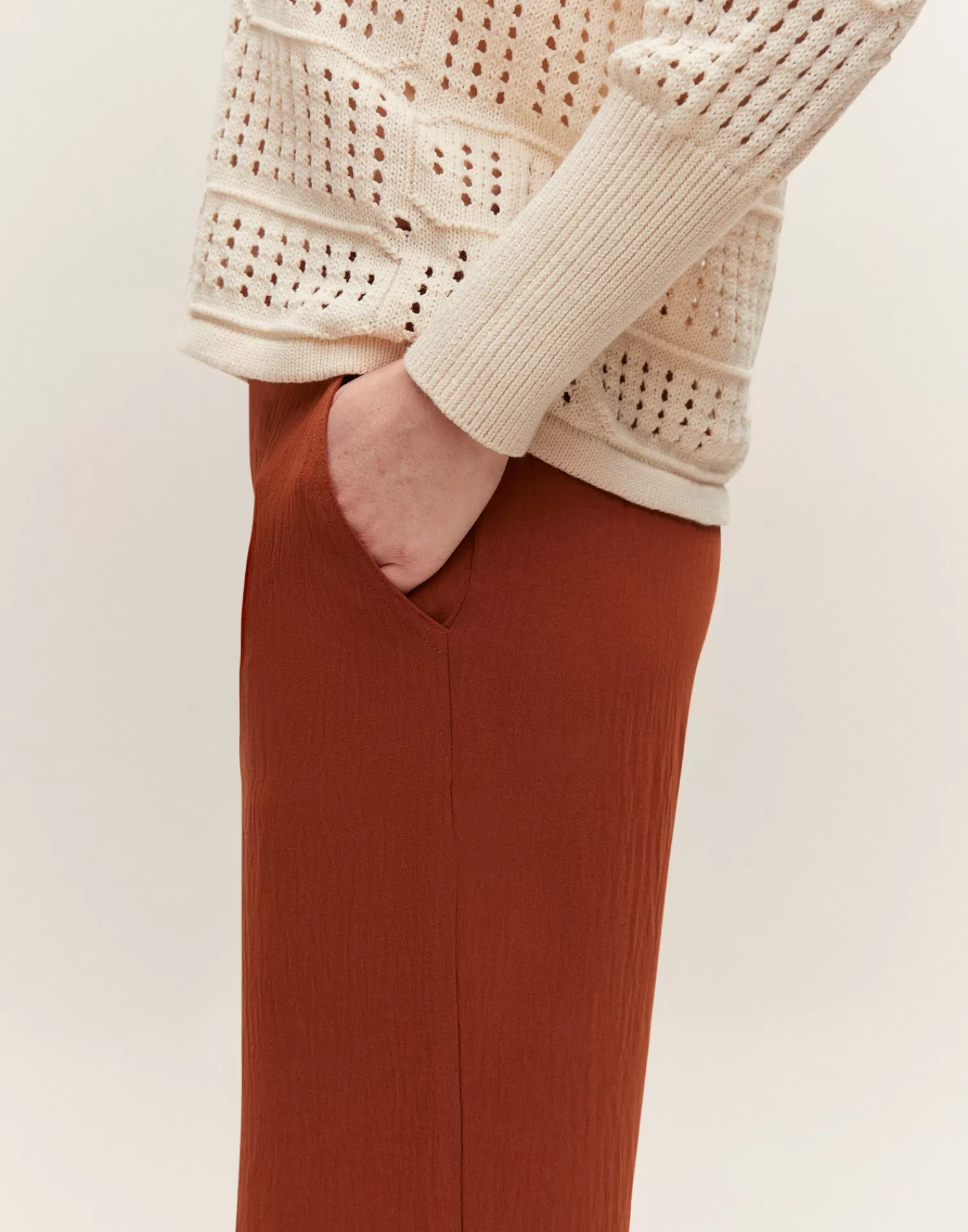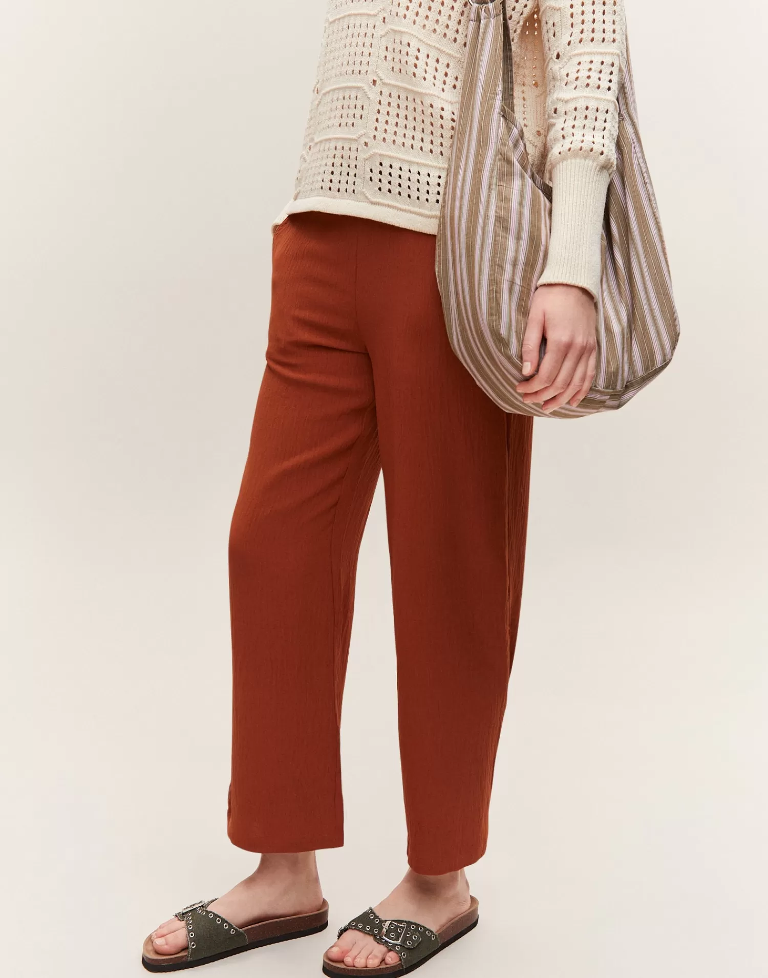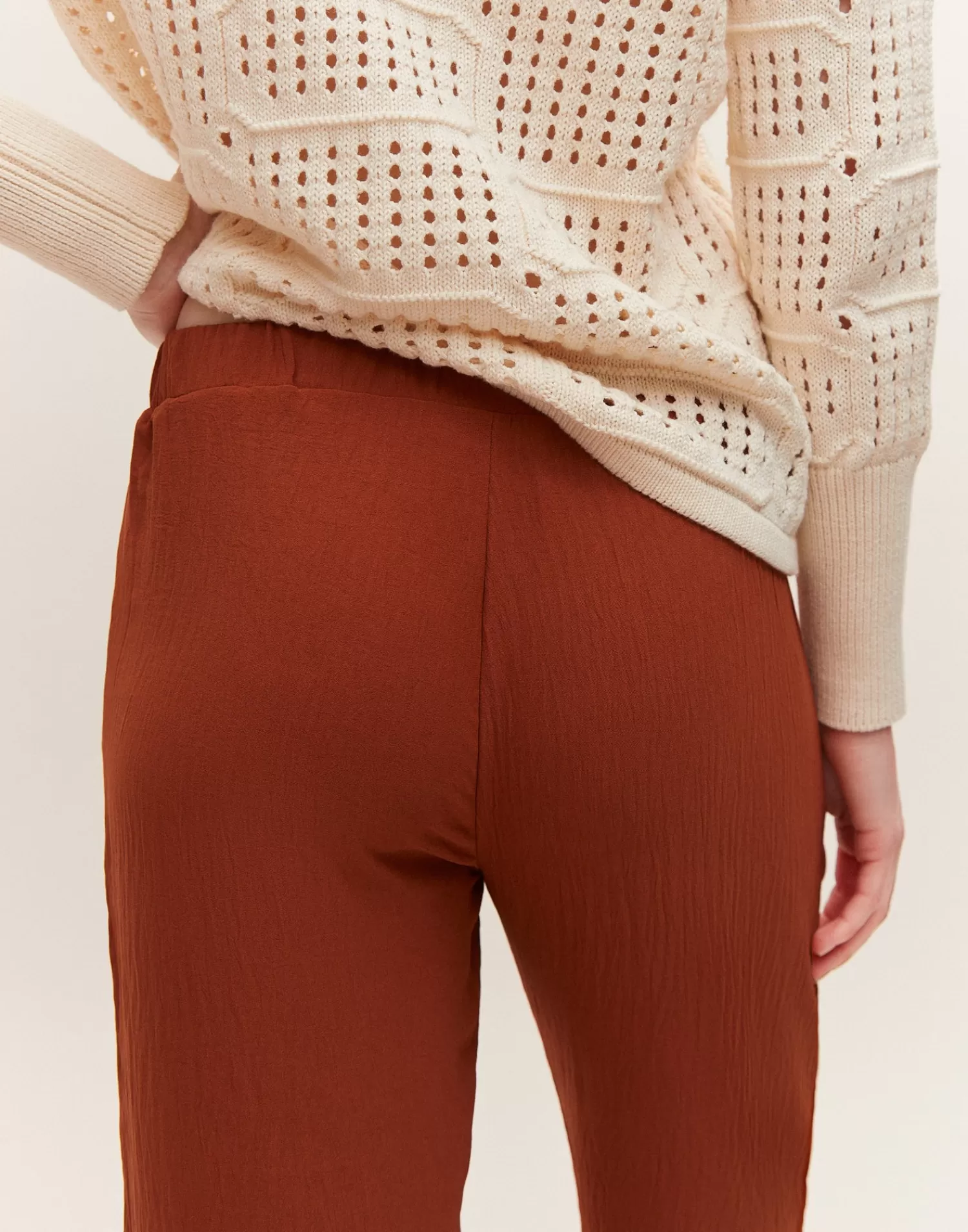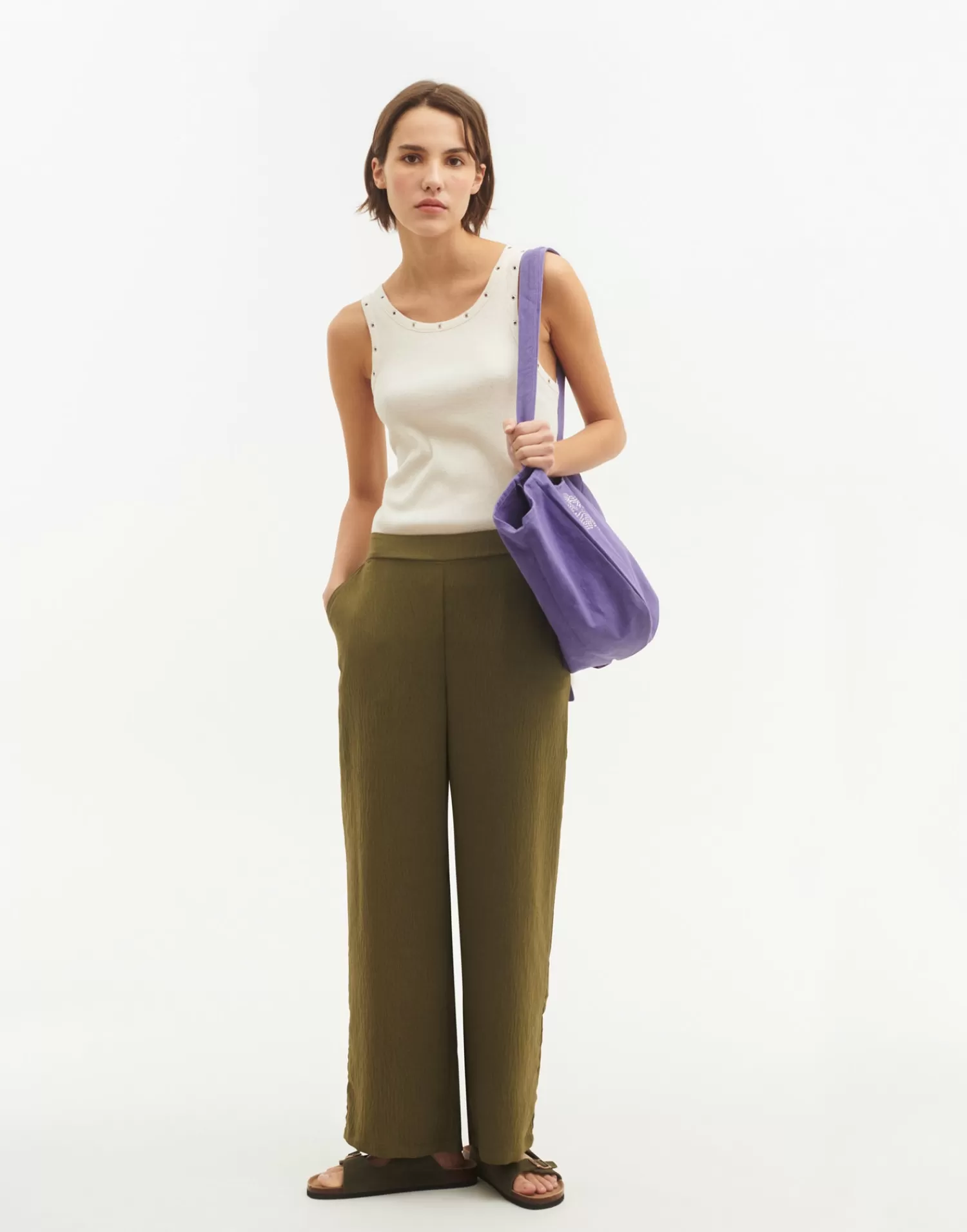 Straight pant featuring an elastic waistband and side pockets.