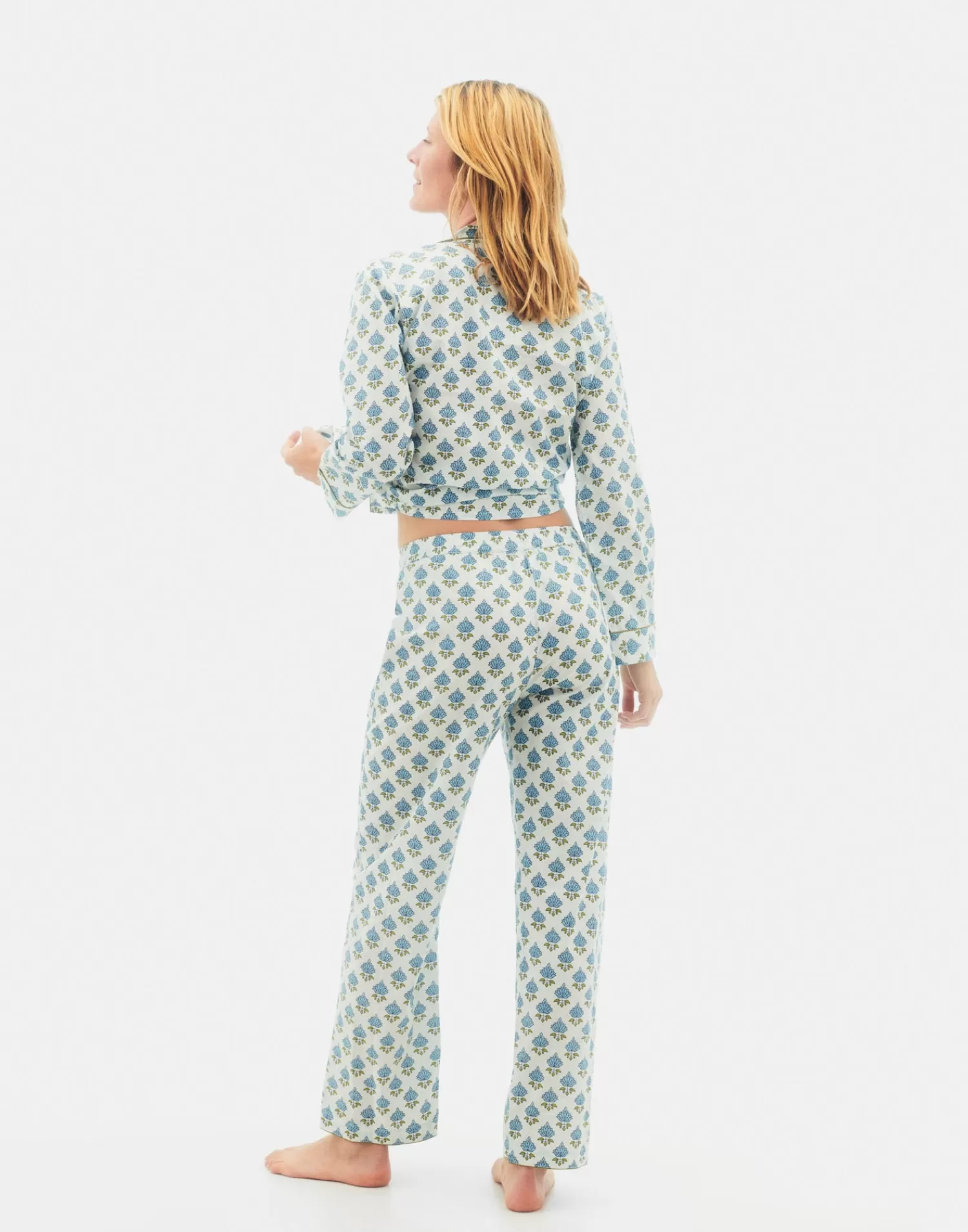 Cotton pyjama set featuring a long sleeved shirt and long pants.