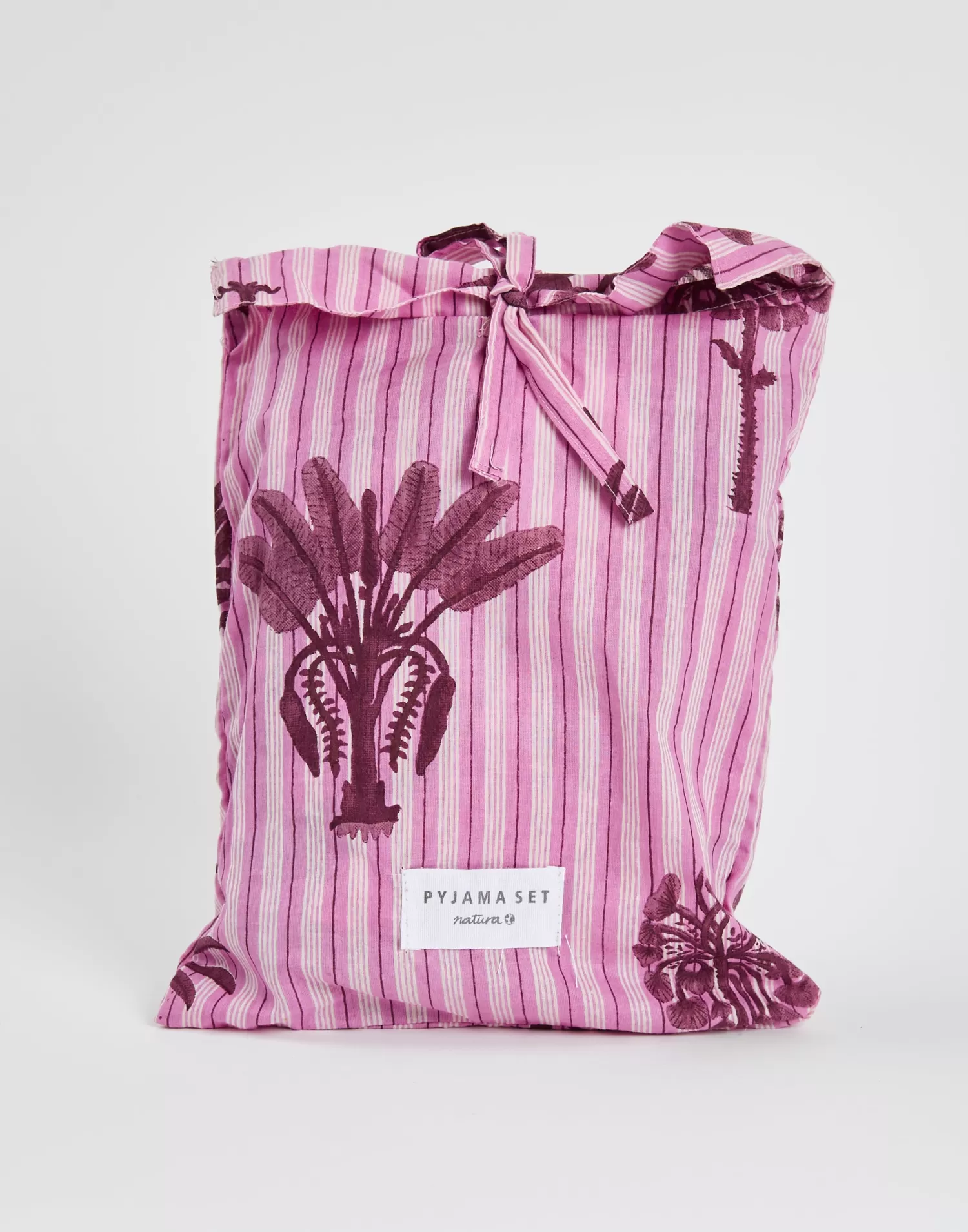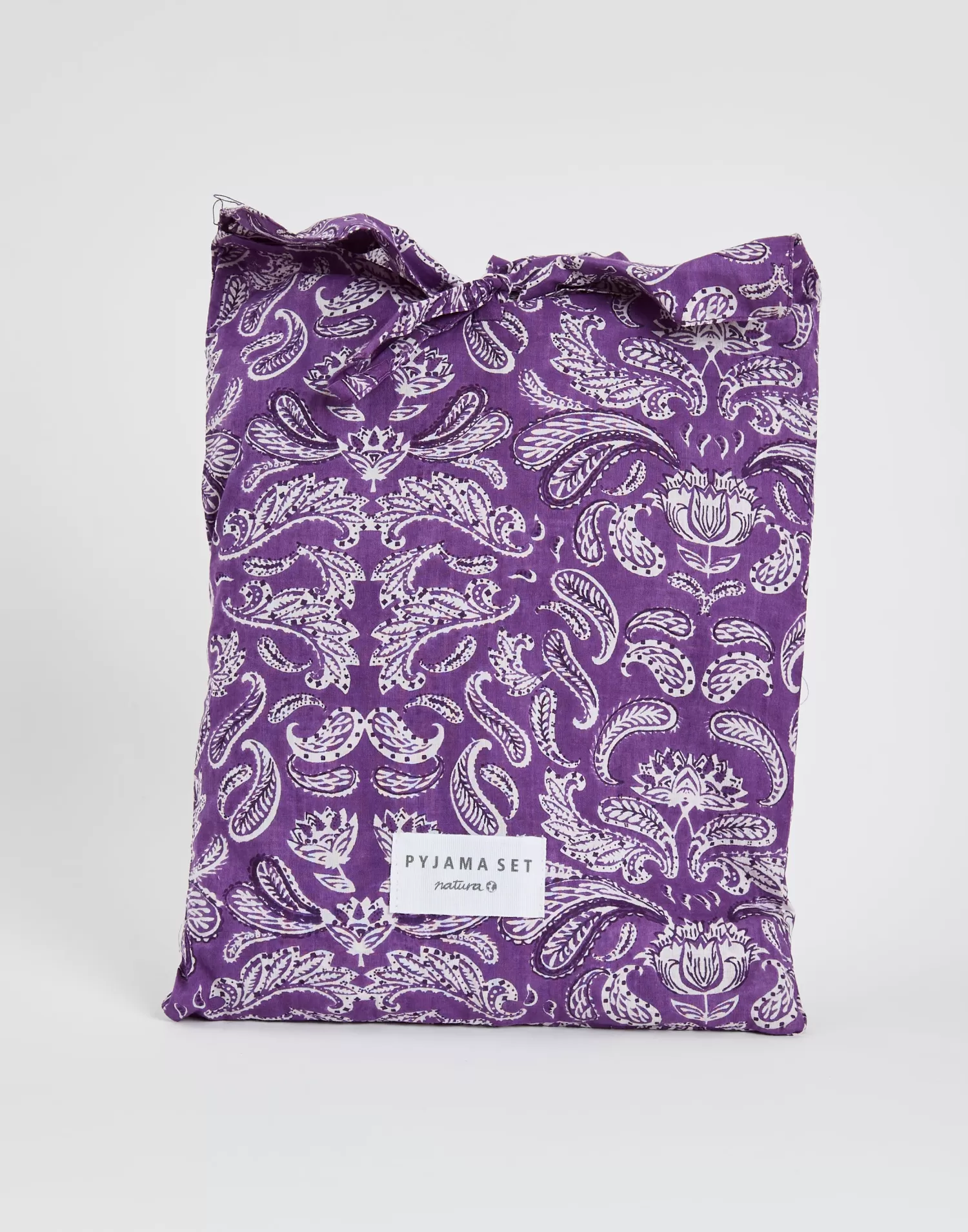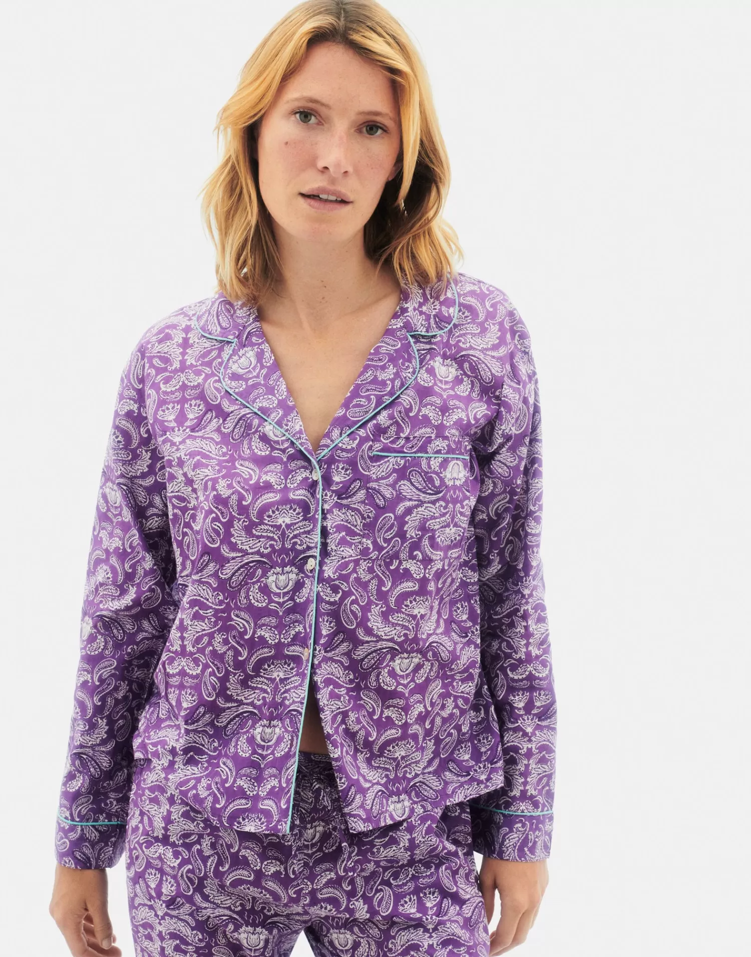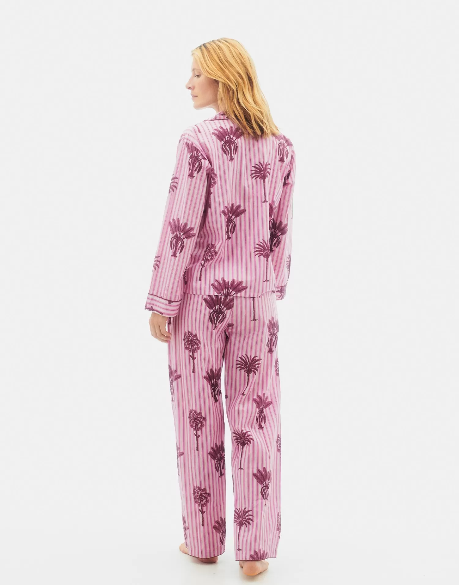 Cotton pyjama set featuring a long sleeved shirt and long pants.
