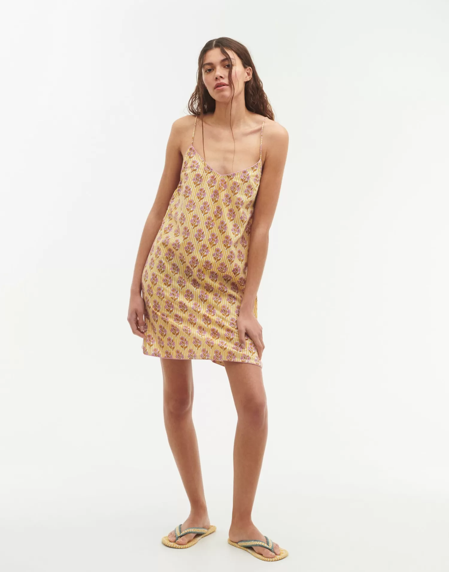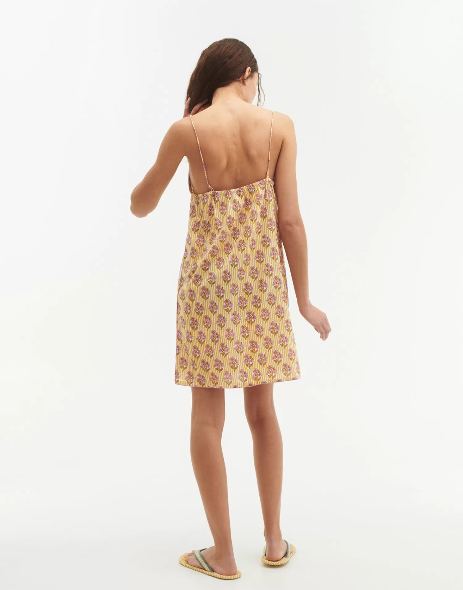 Cotton nightgown printed above the knee, with thin adjustable straps at the back and a V-neckline.