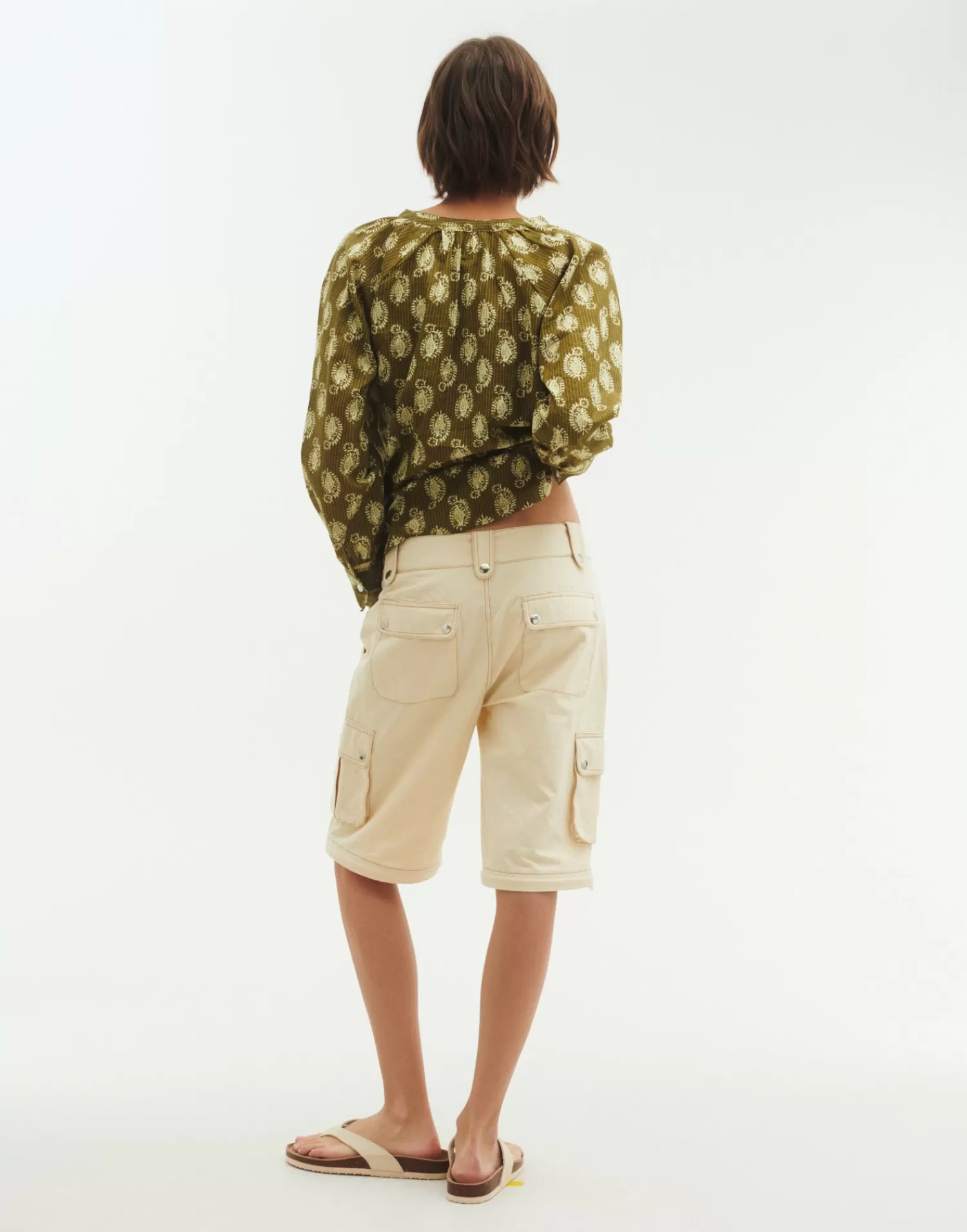 Printed cotton shirt, long-sleeved, round neck, and V-neckline. Button detail on cuffs.