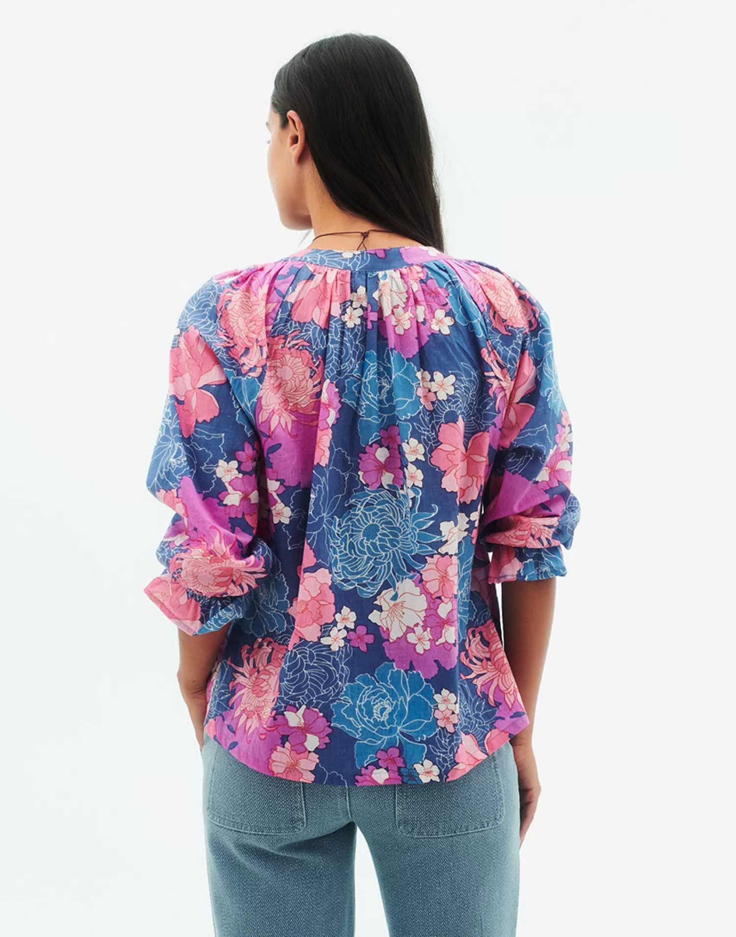 Floral blouse featuring 3/4 sleeves with ruffled elastic cuffs, a v-neckline and a button front closure.
