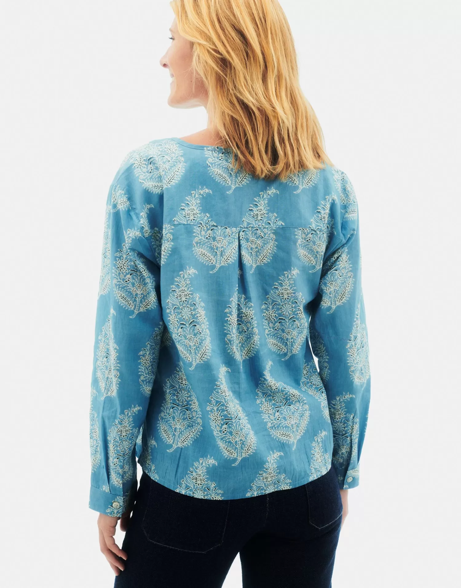 Printed long-sleeved blouse featuring a round neckline and partial button closure.