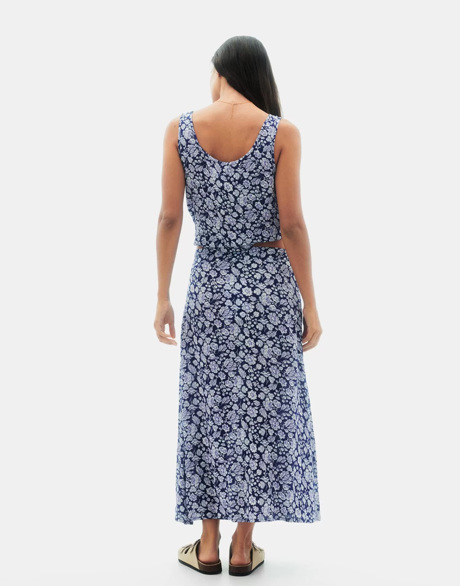 Long skirt featuring a floral print and a zipper closure at the side. Finished with a front slit and matching buttons…
