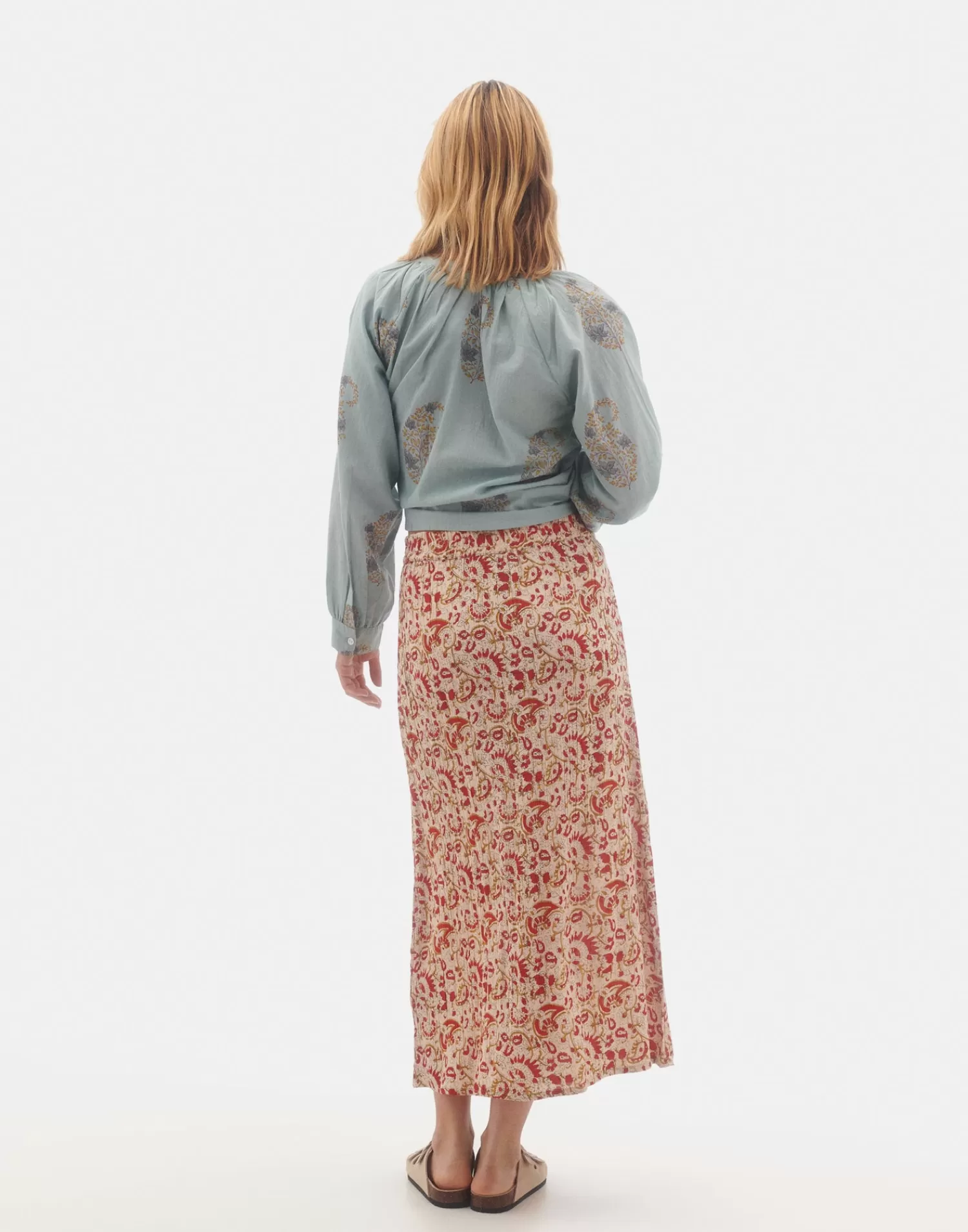 Long printed skirt featuring a straight design and elastic waistband at the back.