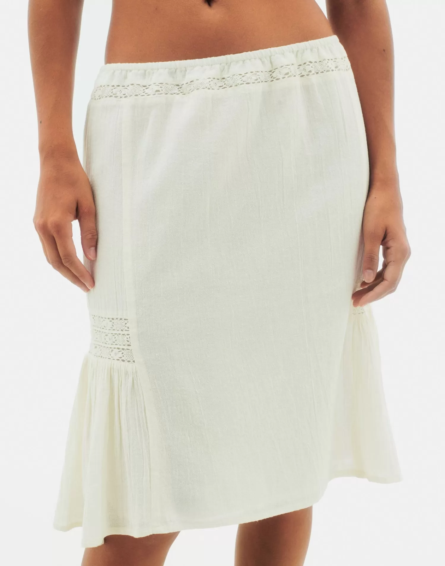 Cotton midi skirt featuring an elastic waistband, ruffle detail and lace appliqué.