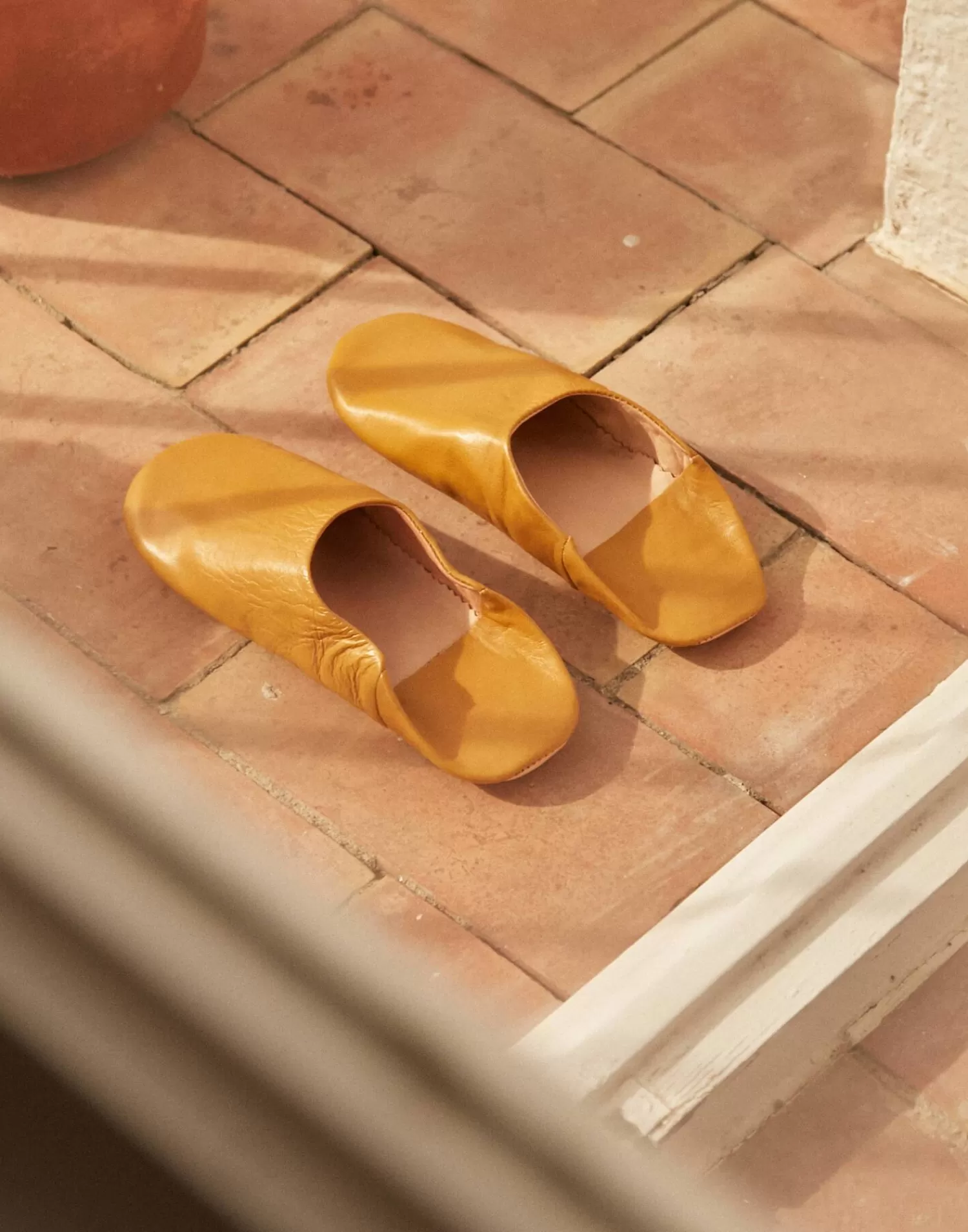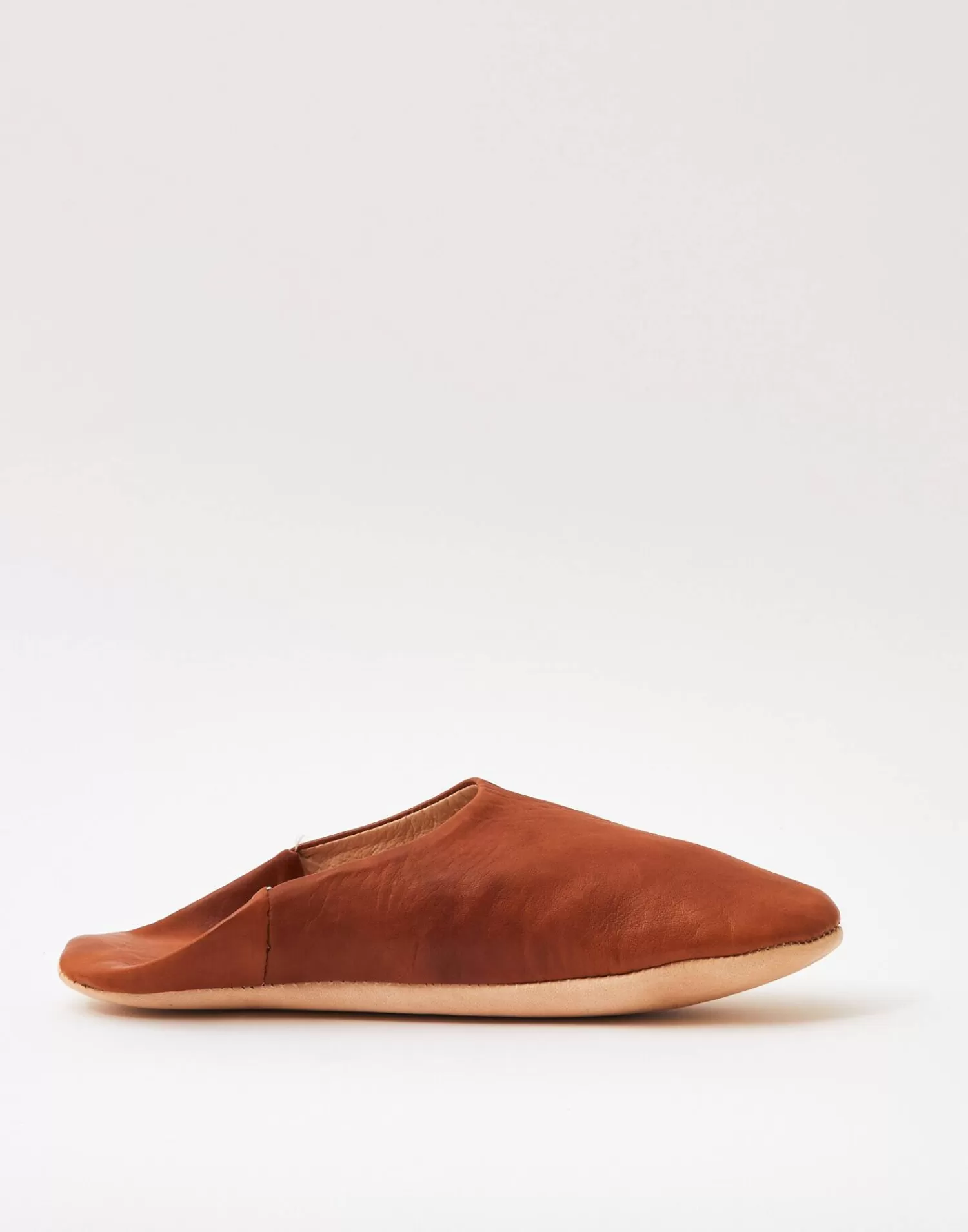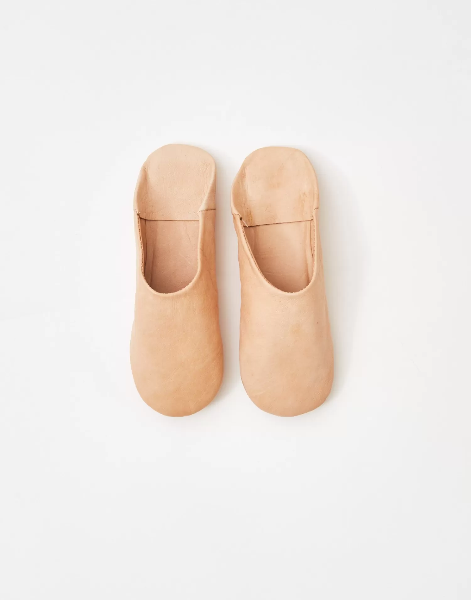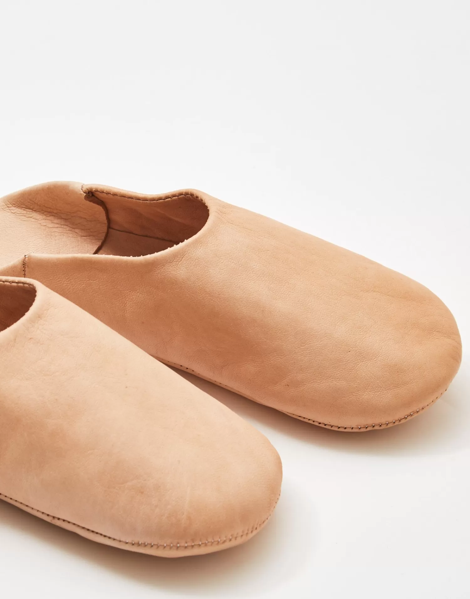 Handmade leather babouche from Morocco. Finished with a heel counter to hold the foot or fold it and use it as a sandal.