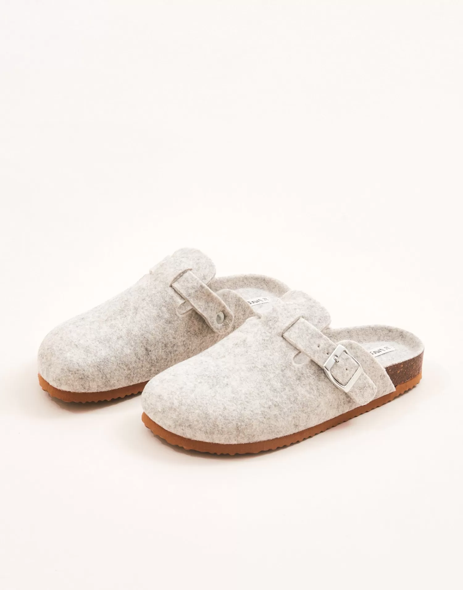 Backless felt mules with cork sole. Buckle detail on the upper.