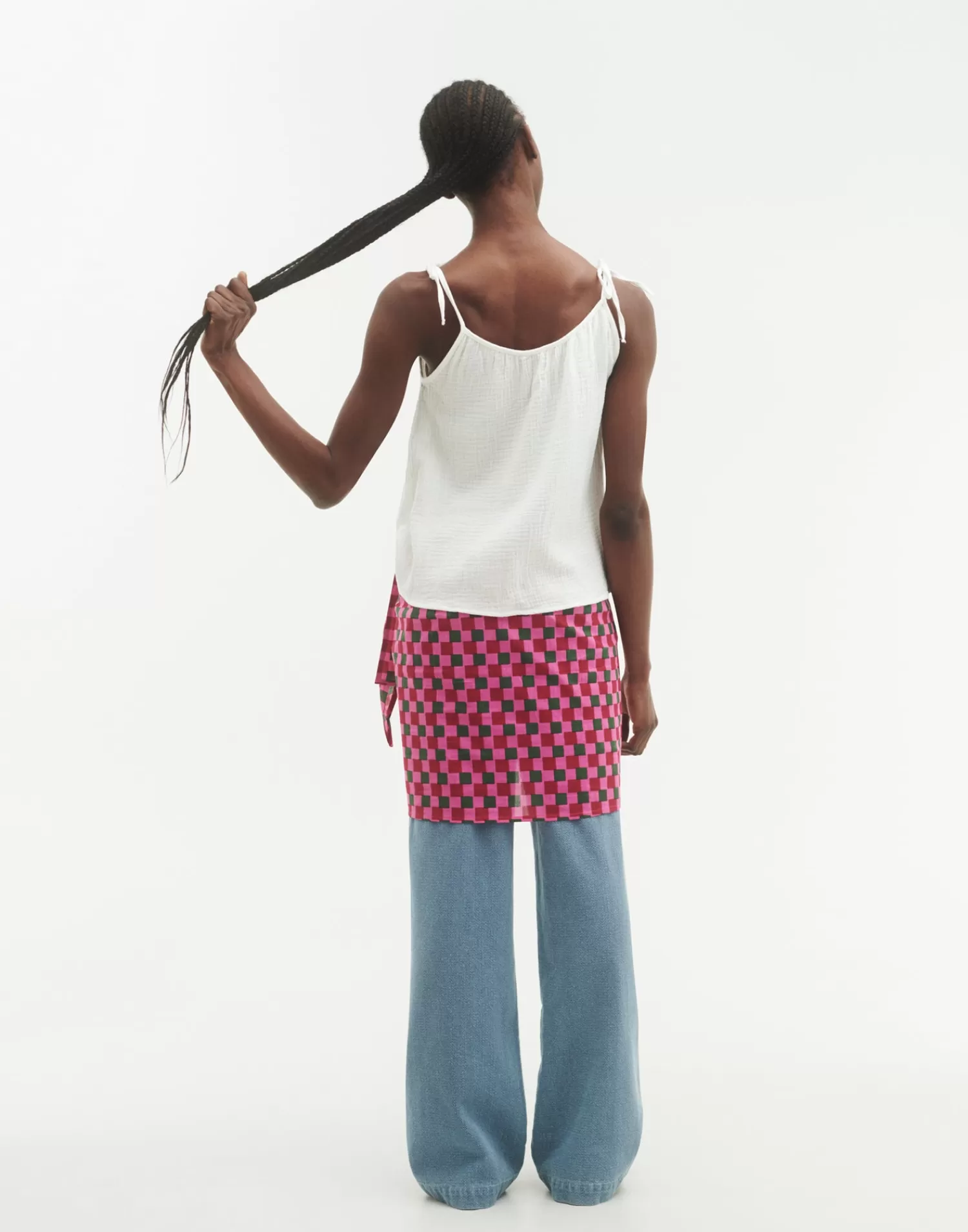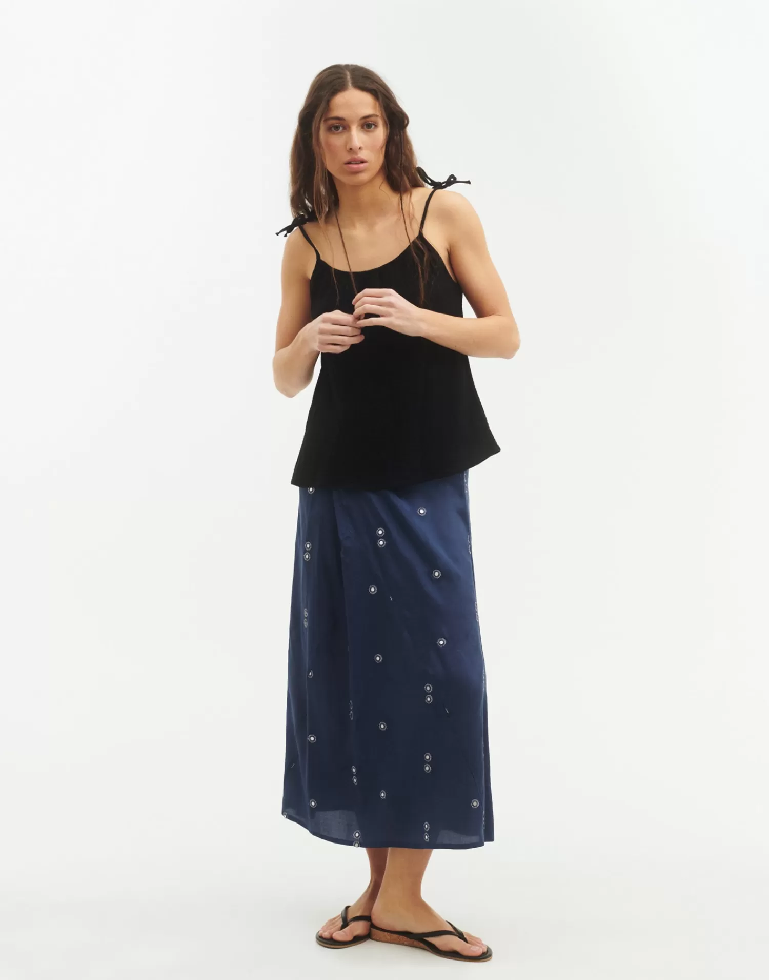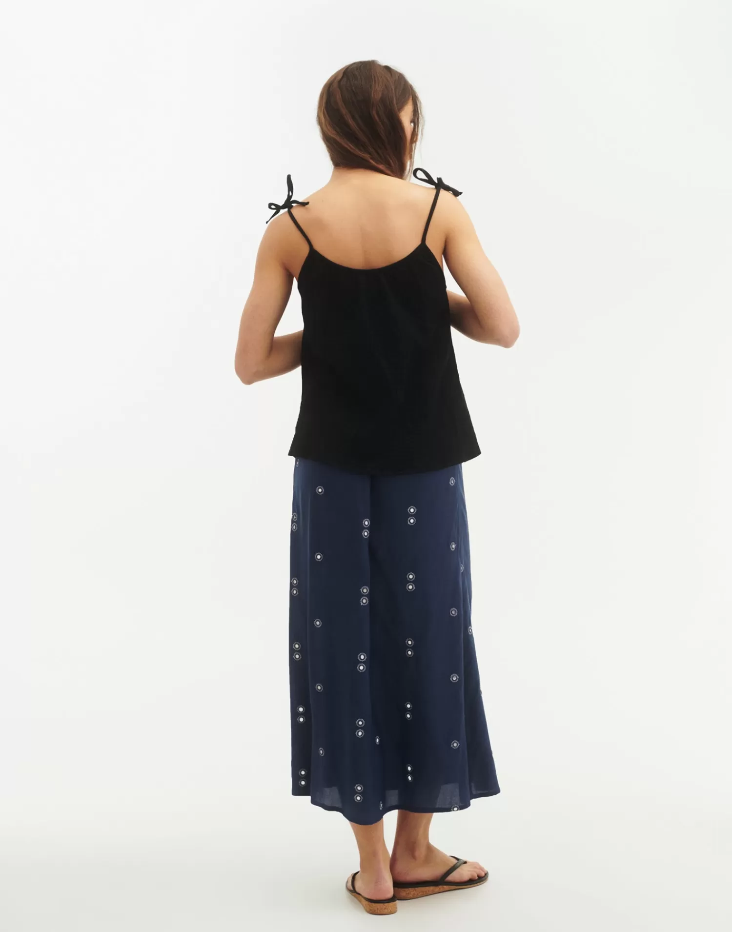 Cotton top with thin adjustable straps via bow.